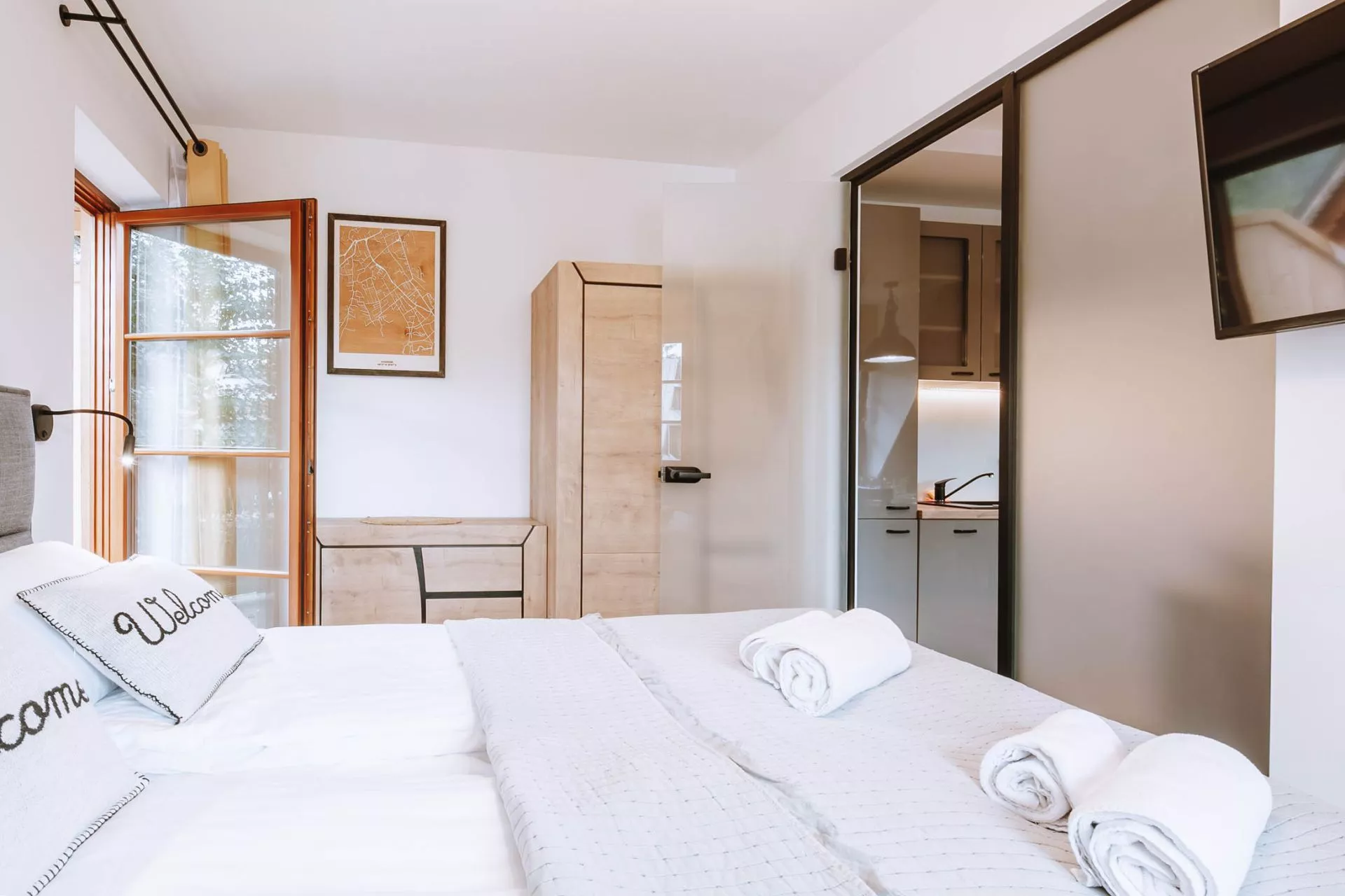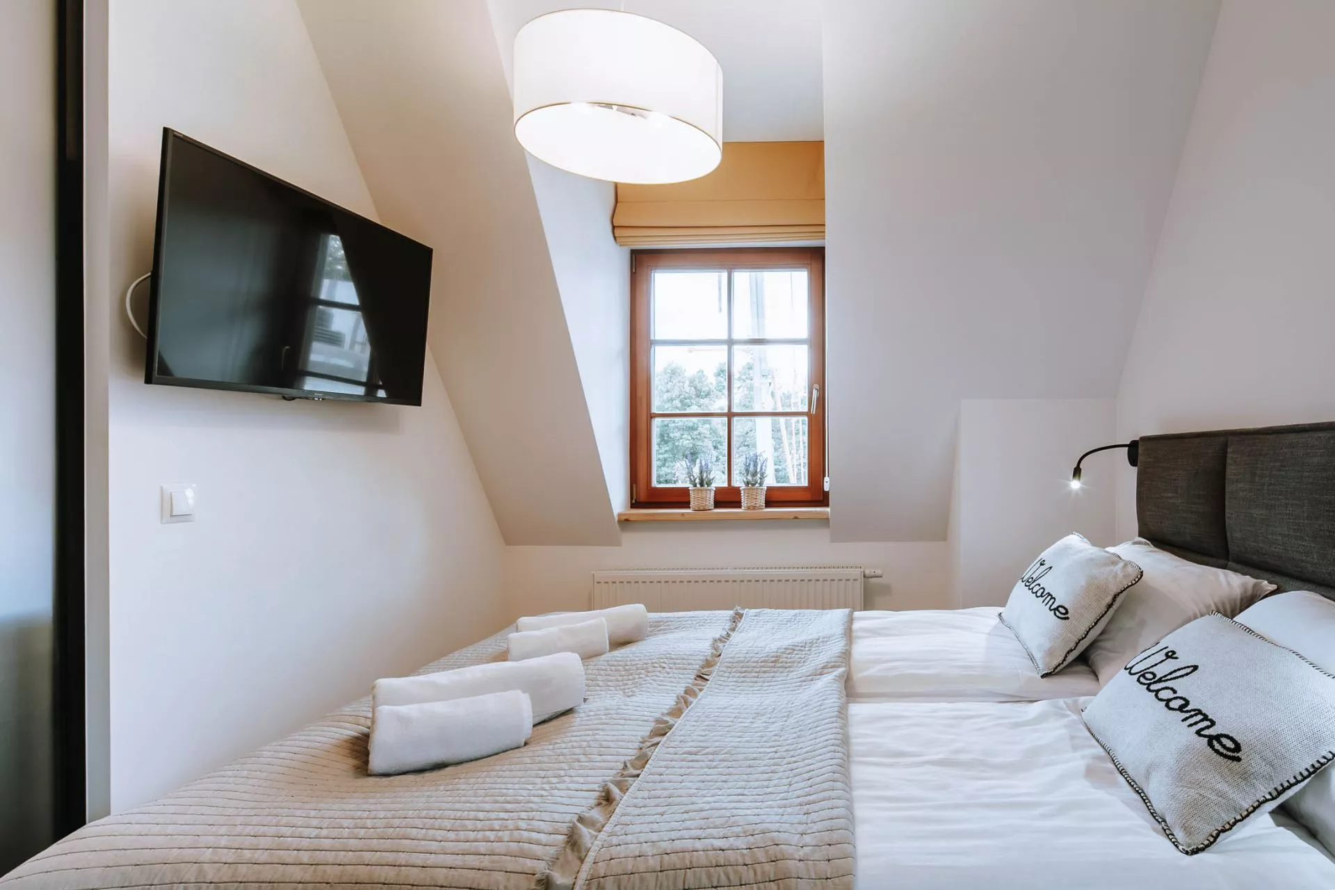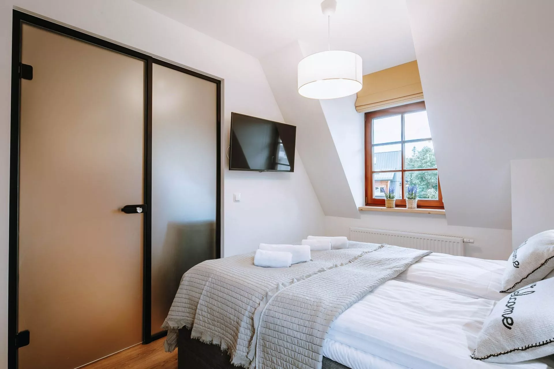 Sypialnia: zamykana (szklane drzwi przesuwne), łóżko małżeńskie, TV'42, wyjście na balkon (widok na góry i Wielką Krokiew)