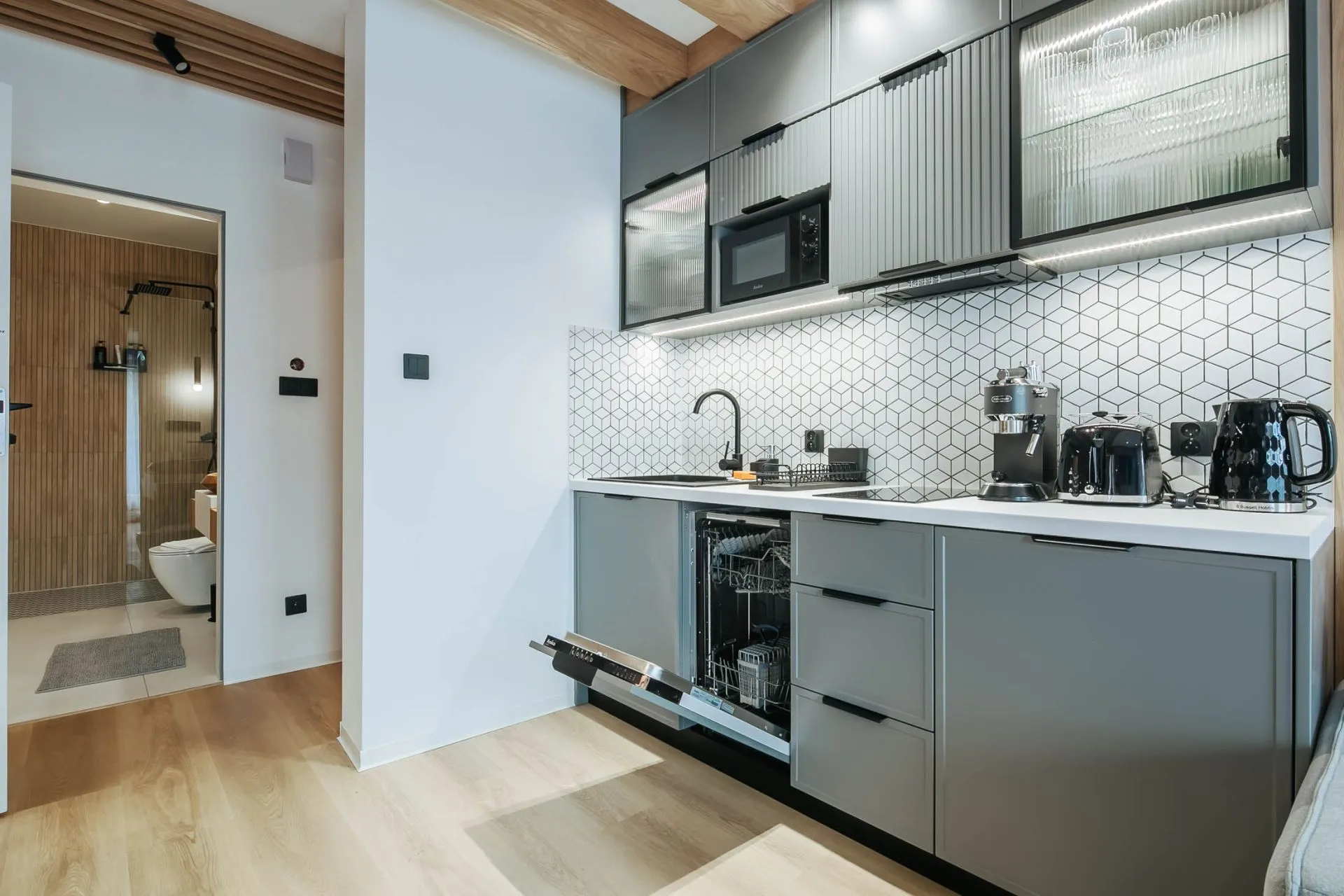 Aneks kuchenny: dwupalnikowa płyta indukcyjna, lodówka, zmywarka, mikrofalówka, czajnik elektryczny, ekspres do kawy DeLonghi, toster, komplet talerzy, sztućców, zastawa szklana, garnki patelnie oraz akcesoria do gotowania