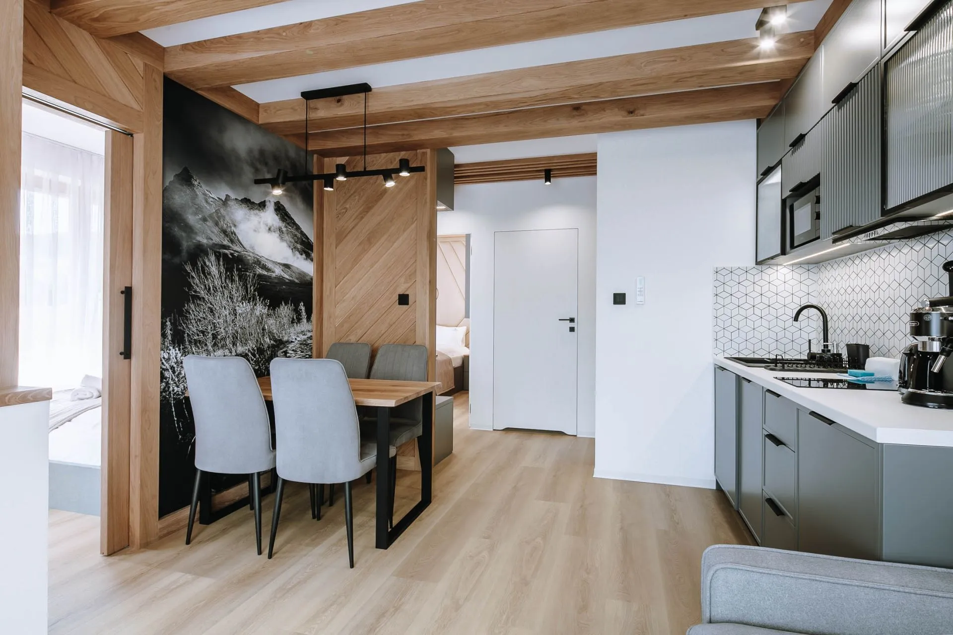 Struktura Apartamentu: salon z aneksem kuchennym z wyjściem na duży balkon z widokiem na panoramę Tatr i miasto, dwie zamykane sypialnie, łazienka i przedpokój