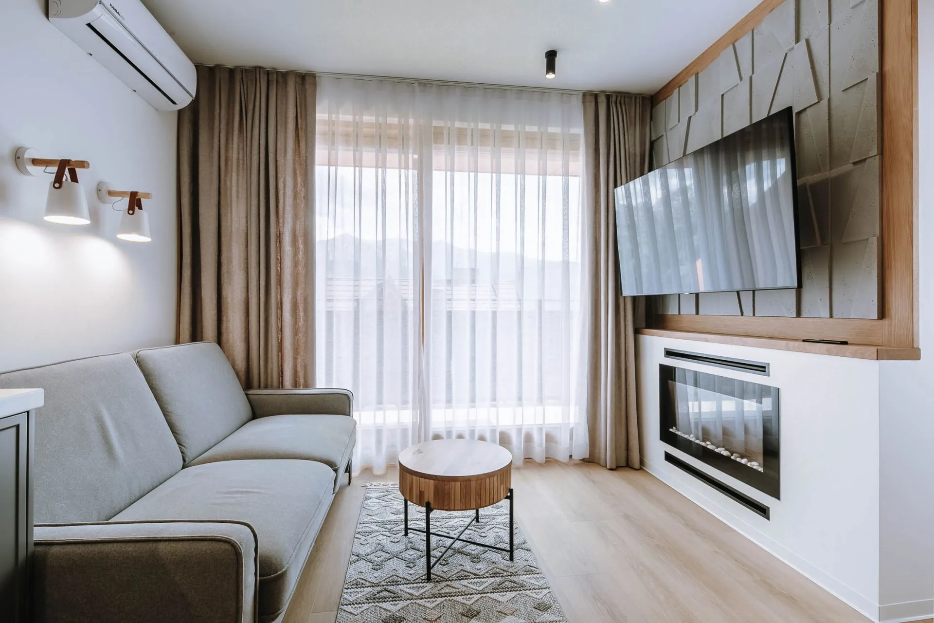 Salon: rozkładana sofa, stolik kawowy, telewizor samsung, kominek elektryczny, klimatyzacja, wyjście na balkon