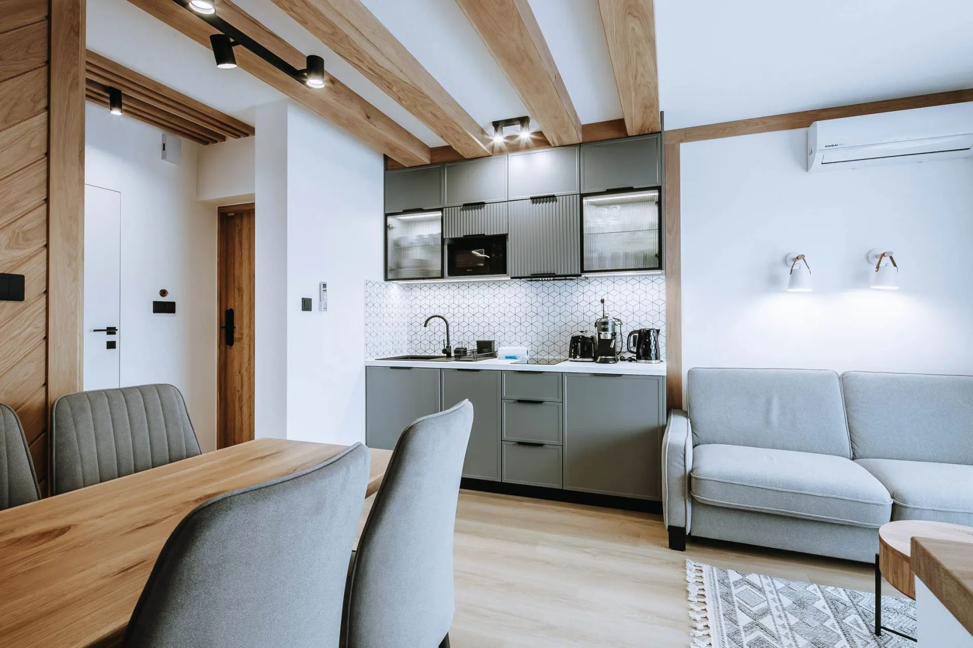 Aneks kuchenny: dwupalnikowa płyta indukcyjna, lodówka, zmywarka, mikrofalówka, czajnik elektryczny, toster, ekspres do kawy DeLonghi, zastawa ceramiczna oraz szklana, sztućce, garnki, patelnie, akcesoria do gotowania, stół i krzesła
