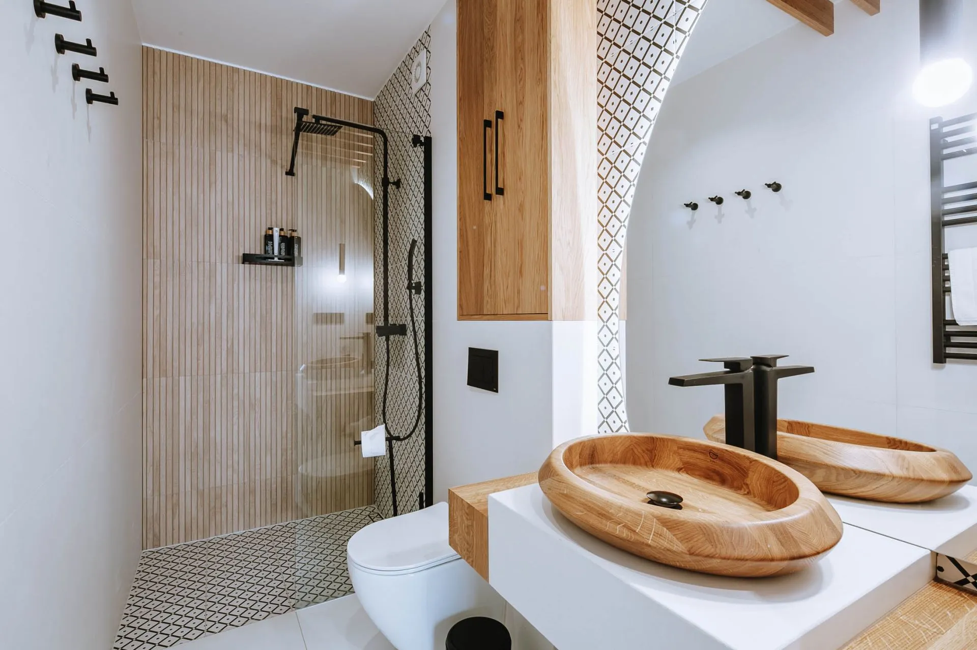 Łazienka: kabina prysznicowa, toaleta, umywalka, szafka, suszarka do włosów