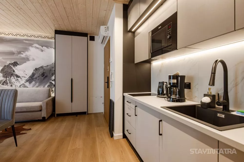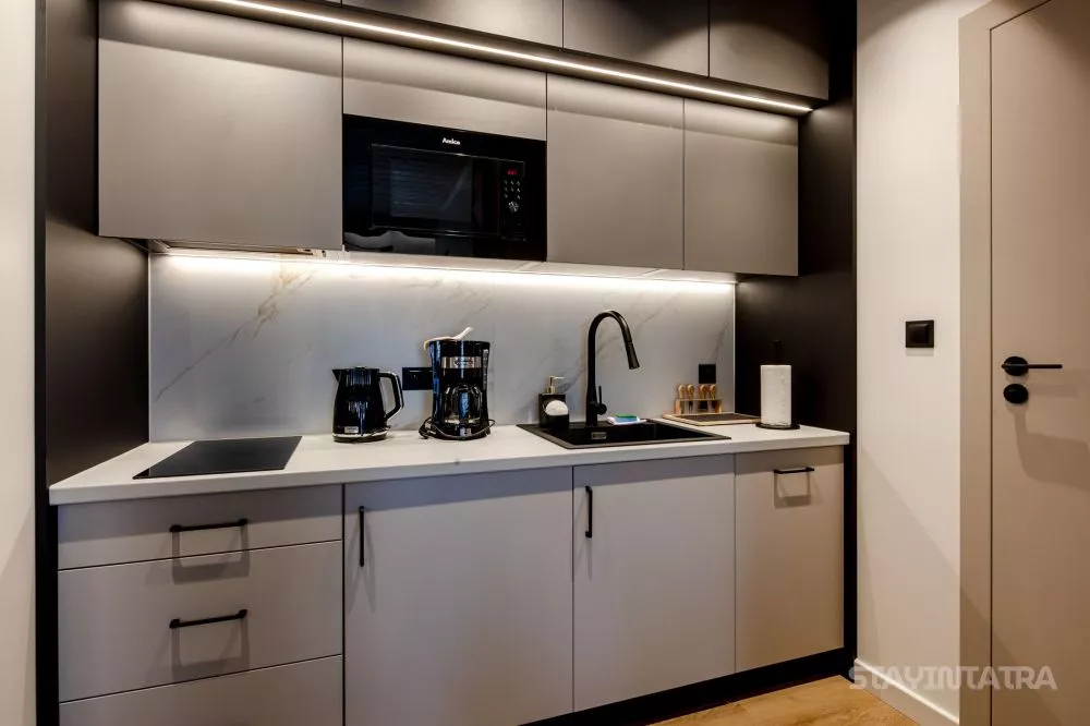 Aneks kuchenny: dwupalnikowa płyta indukcyjna, lodówka, zmywarka, mikrofalówka, czajnik elektryczny, ekspres do kawy DeLonghi przelewowy, zastawa ceramiczna oraz szklana, sztućce, garnki, patelnie, akcesoria do gotowania, stół i krzesła