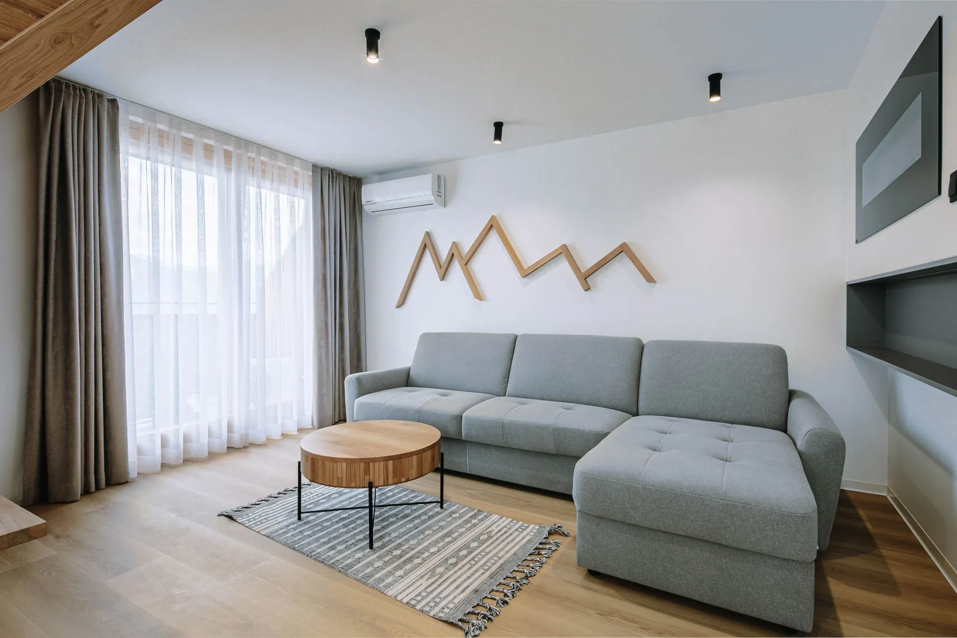 Salon: dwuosobowy rozkładany narożnik, stolik kawowy, klimatyzacja, kominek elektryczny, telewizor samsung, wyjście na balkon z widokiem na całą Panoramę Tatr, Zakopane oraz Kościelisko