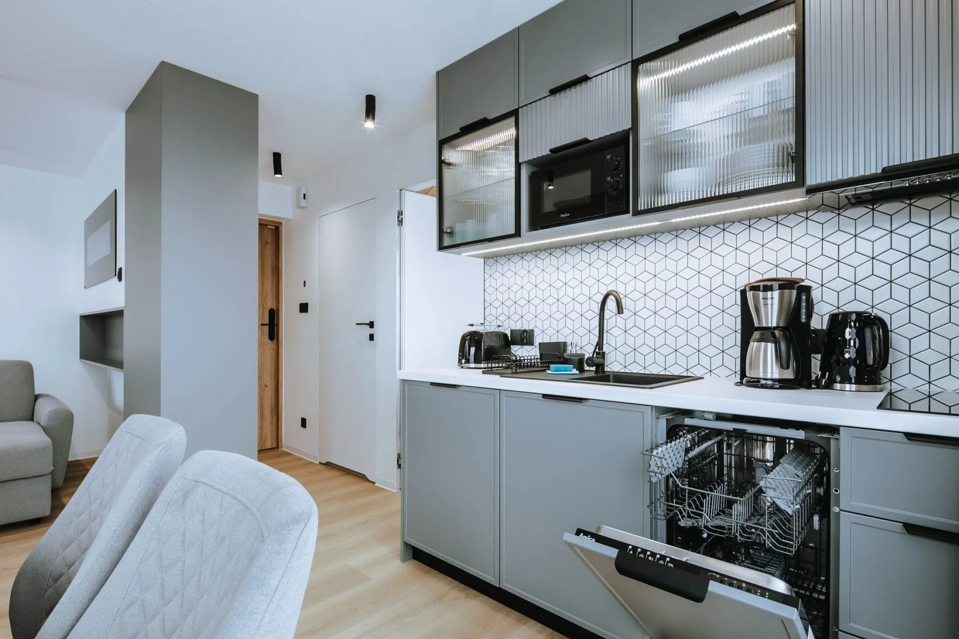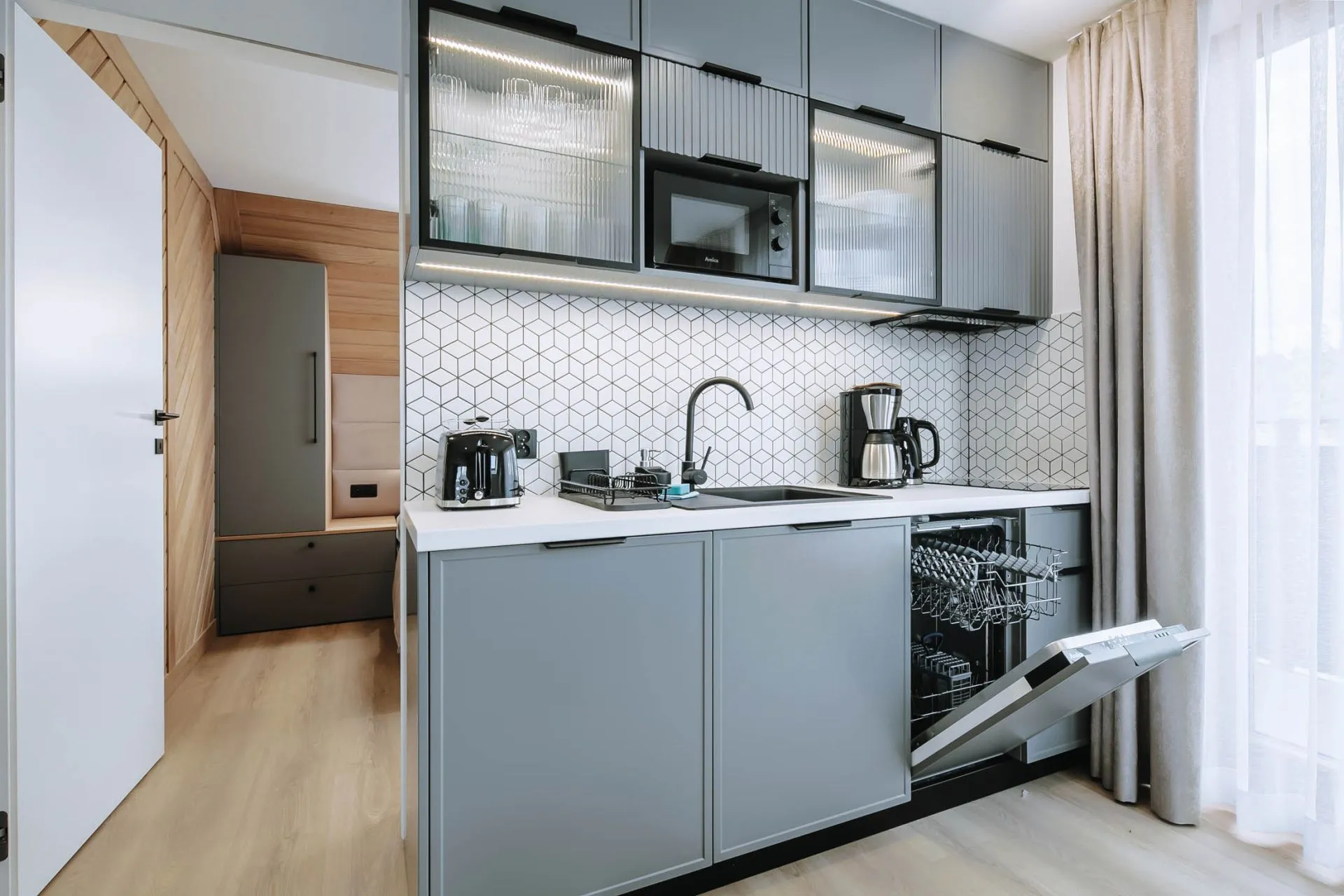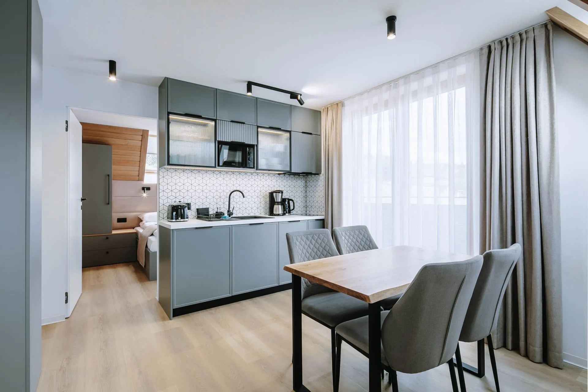 Aneks kuchenny: dwupalnikowa płyta indukcyjna, lodówka, zmywarka, mikrofalówka, czajnik elektryczny, ekspres przelewowy Philips, toster, zastawa ceramiczna oraz szklana, sztućce, garnki, patelnie, akcesoria do gotowania, stół i krzesła, wyjście na balkon z widokiem bocznym na Tatry Zakopane oraz łąkę