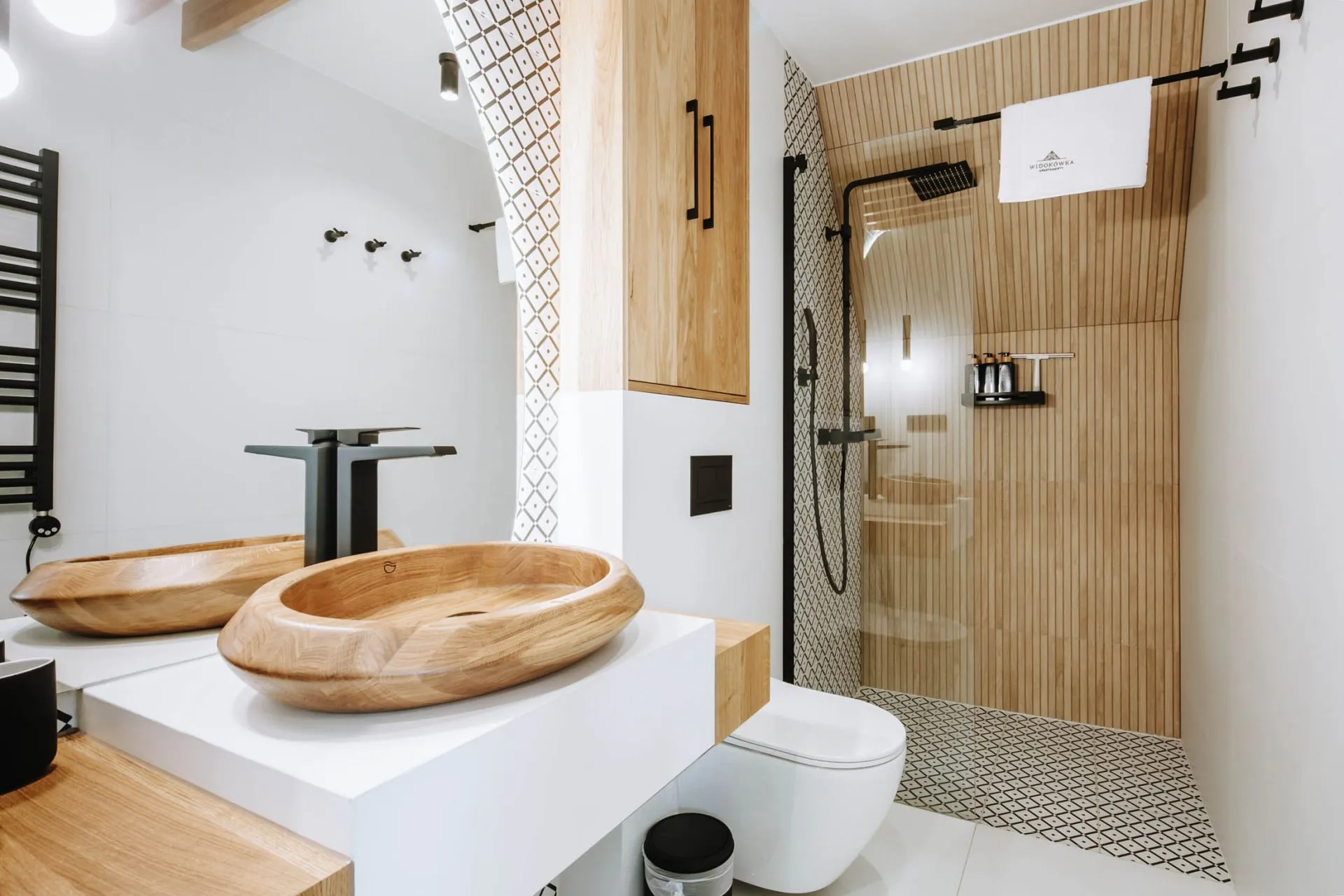 Łazienka: kabina prysznicowa, toaleta, umywalka, szafka, lustro, suszarka do włosów