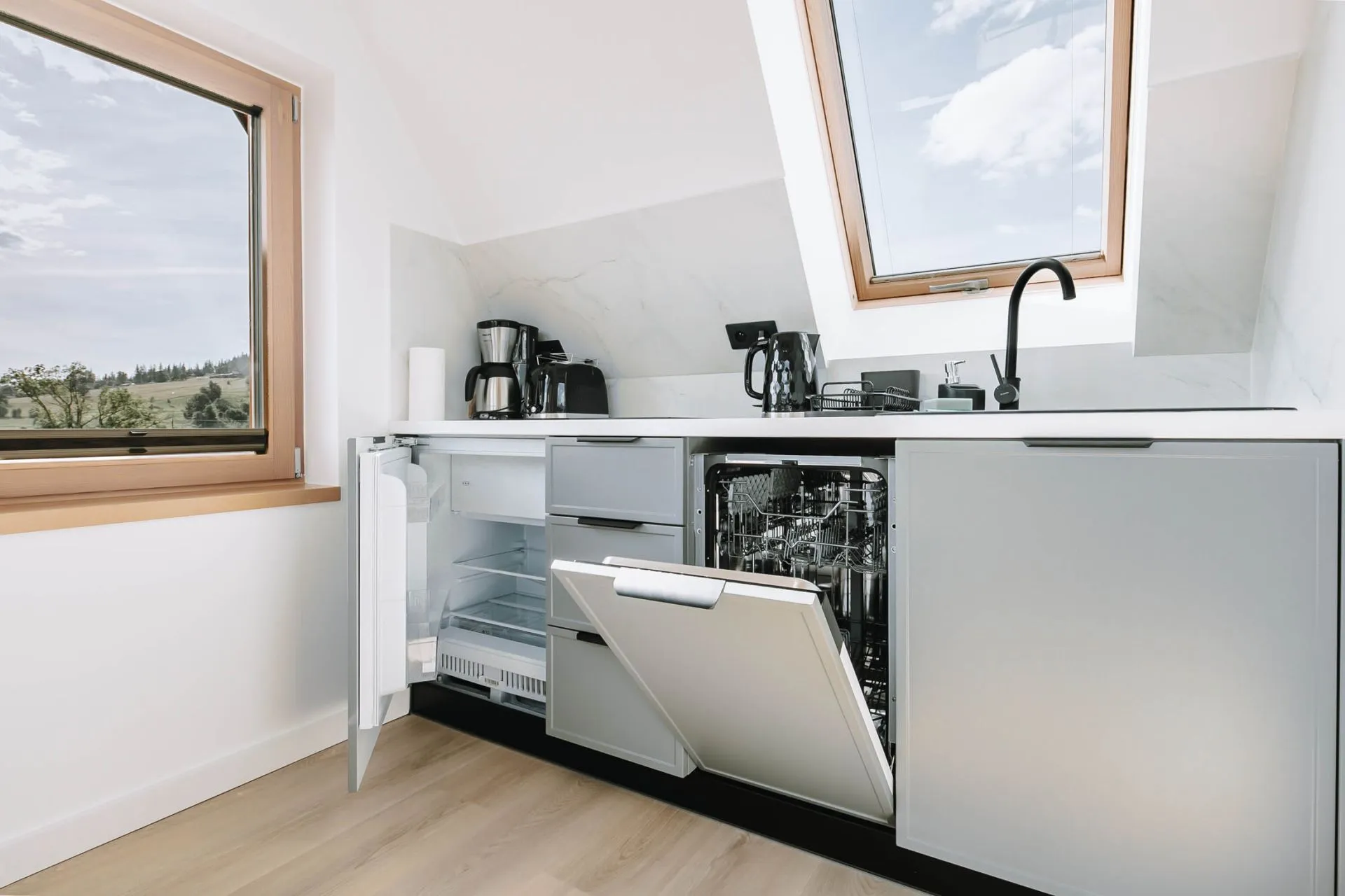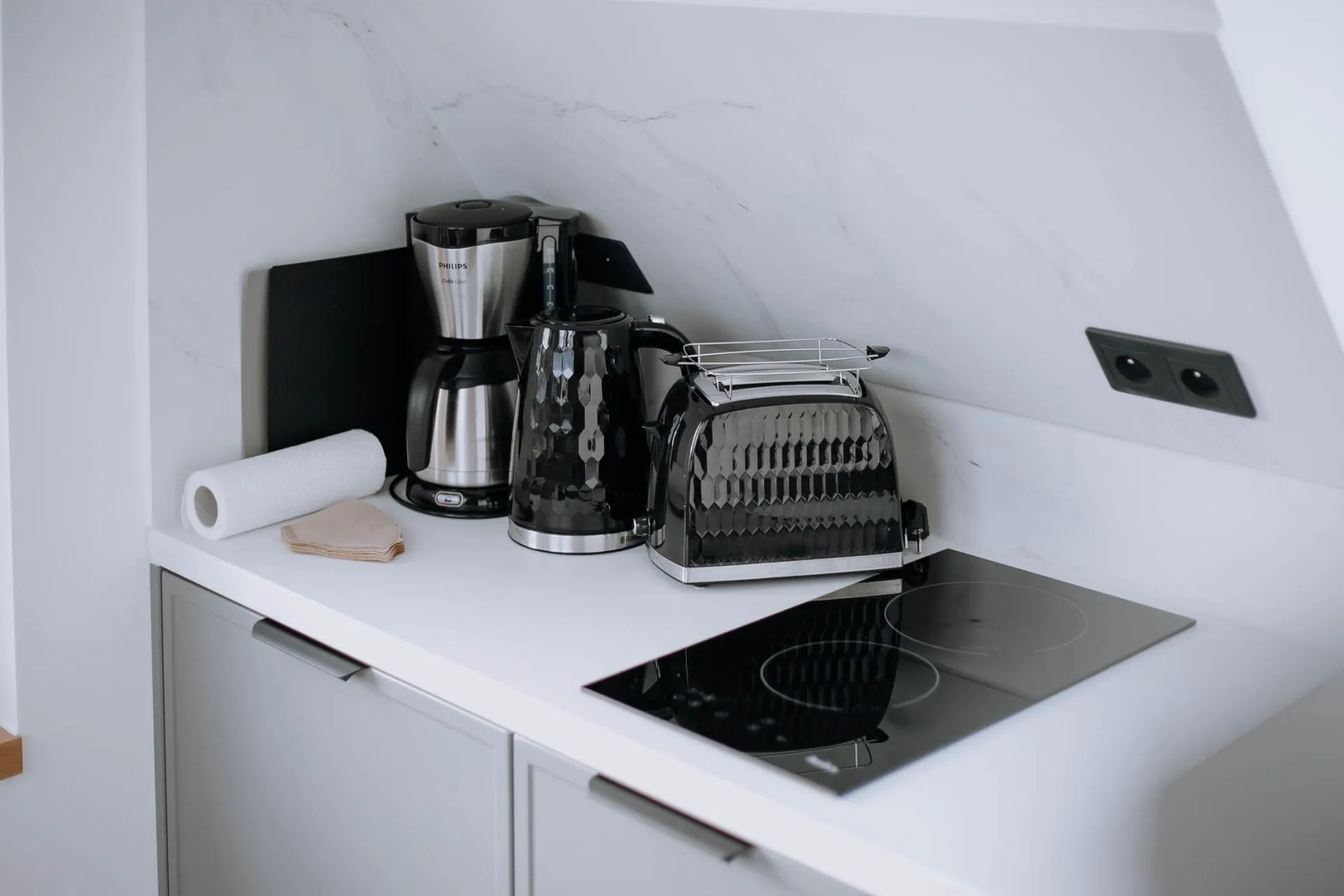 Otwarta cześć kuchenna: klimatyzacja, dwupalnikowa płyta indukcyjna, zmywarka, lodówka, czajnik elektryczny, ekspres przelewowy Philips, toster, stół z krzesłami, zastawa ceramiczna oraz szklana, sztućce, garnki, patelnie, przybory do gotowania.