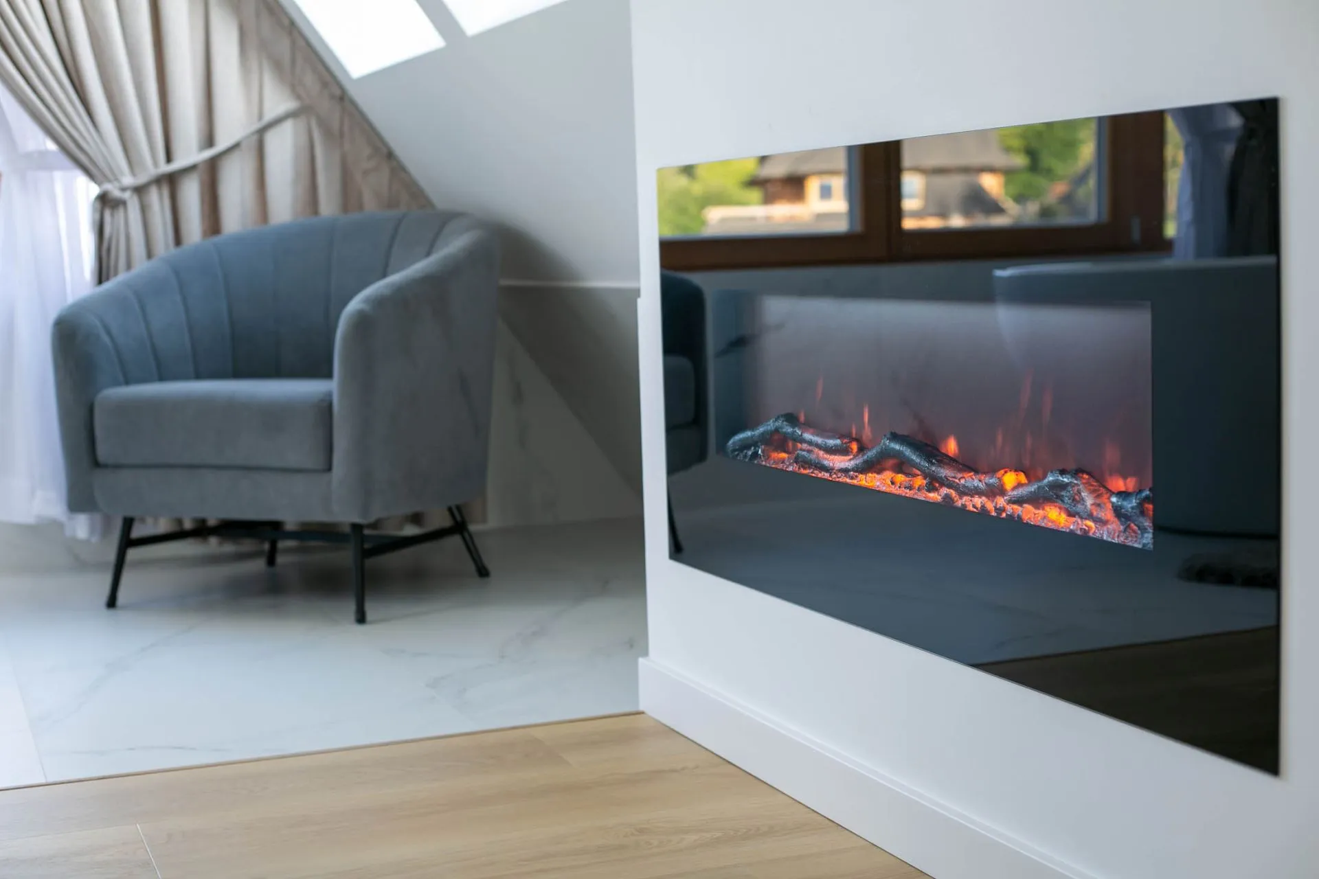 Otwarta część sypialniana: łóżko małżeńskie, wanna, fotel, kominek elektryczny, szafka nocna
