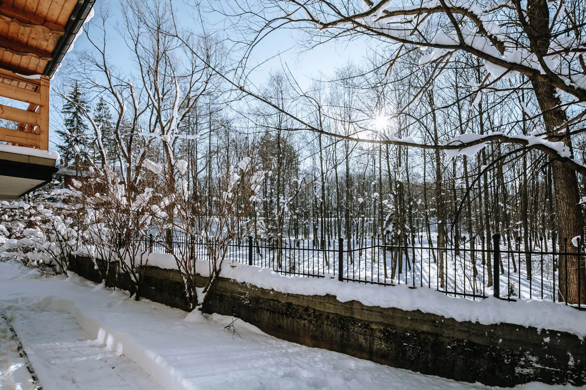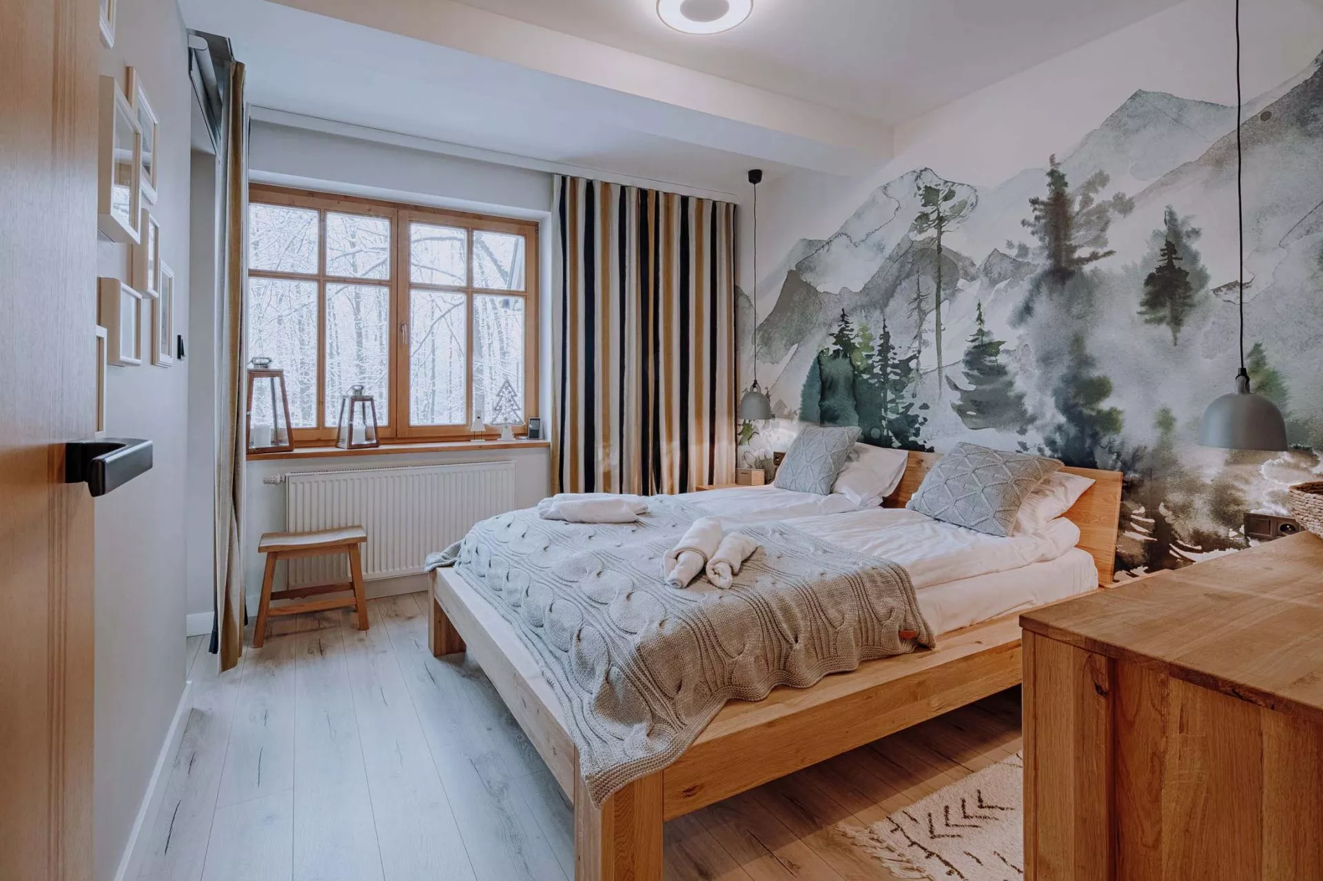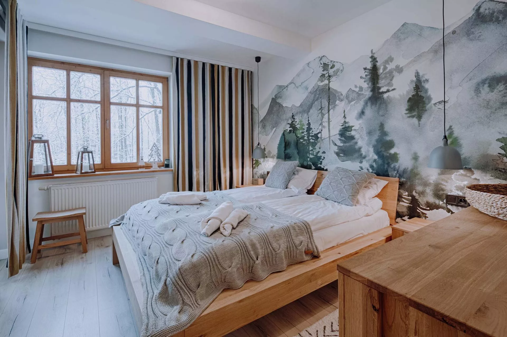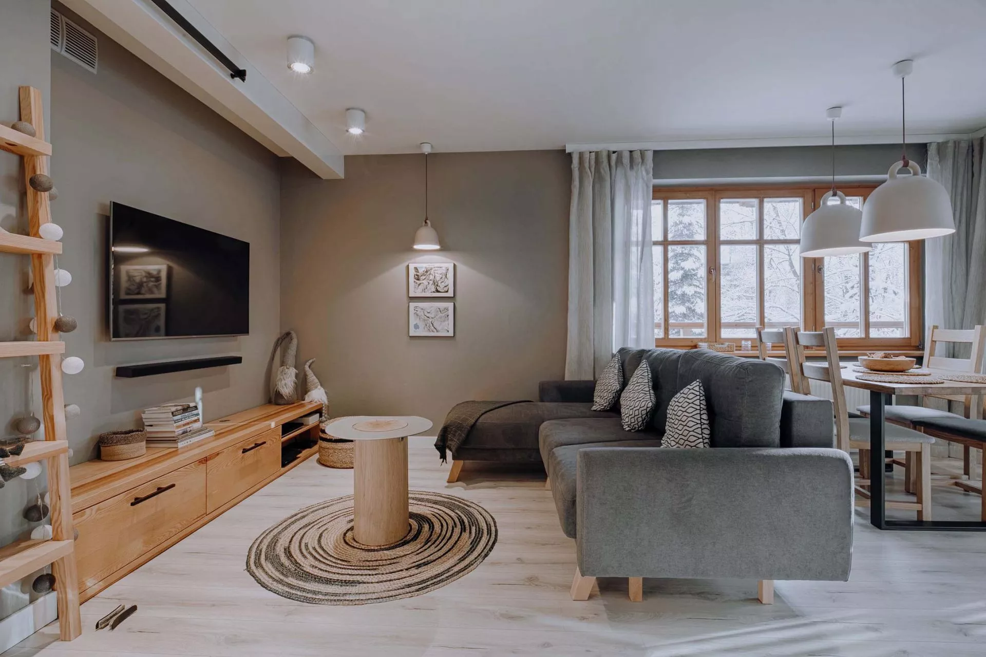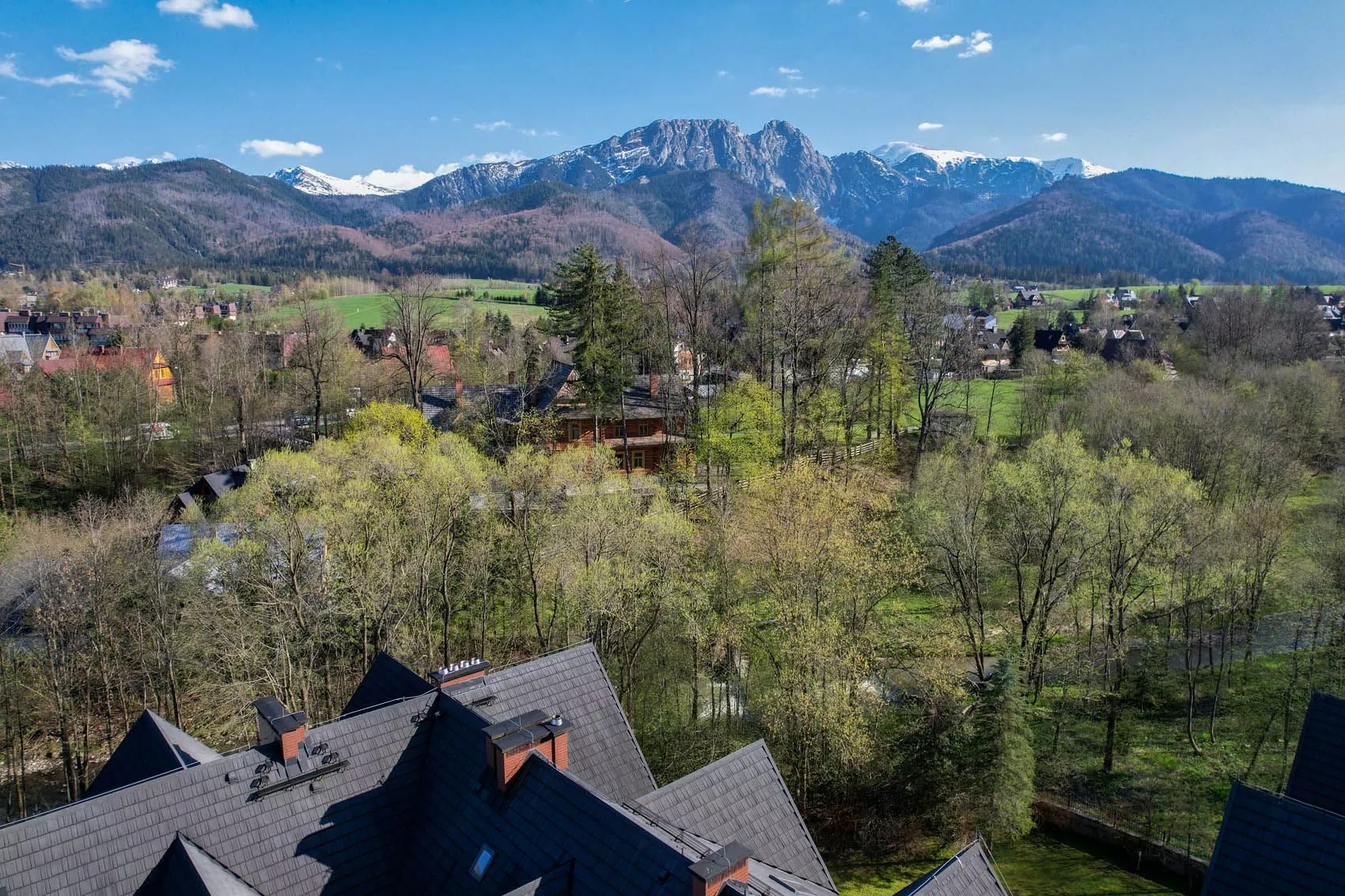 Salon z wyjściem na duży taras z meblami ogrodowymi, z którego rozpościera się widok na Tatry i las Doliny Cichej Wody z potokiem górskim przepływającym w pobliżu. Z tarasu widać także piękny i stylowy budynek Muzeum Stylu Zakopiańskiego.