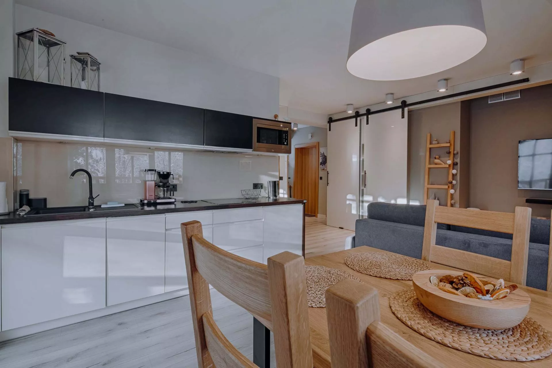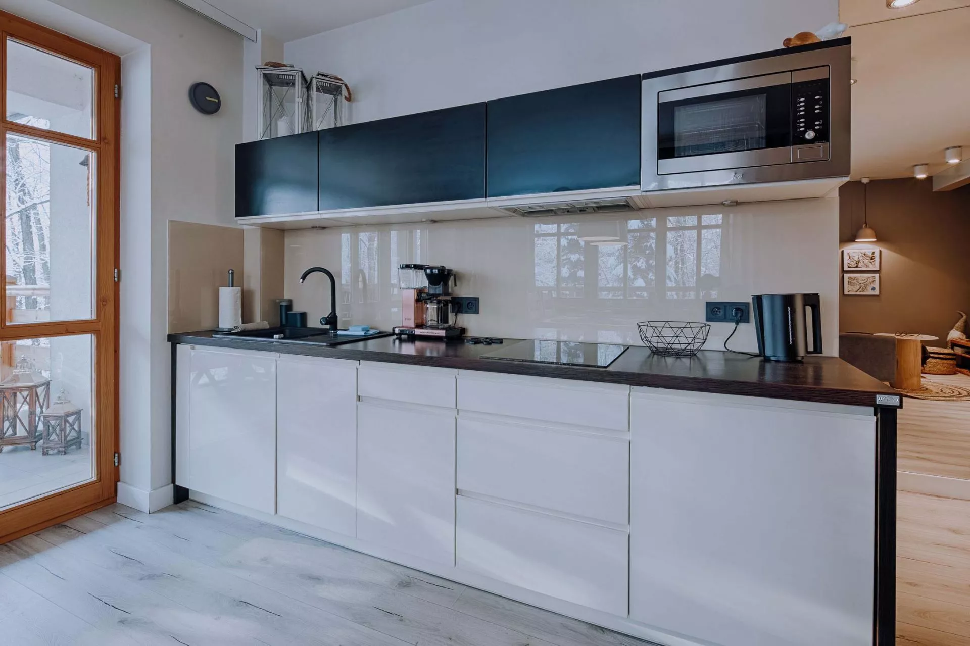Aneks kuchenny: 3 stanowiskowa płyta indukcyjna, lodówka, zmywarka, kuchenka mikrofalowa, czajnik elektryczny, przelewowy ekspres do kawy, naczynia, sztućce, garnki, zastawa szklana