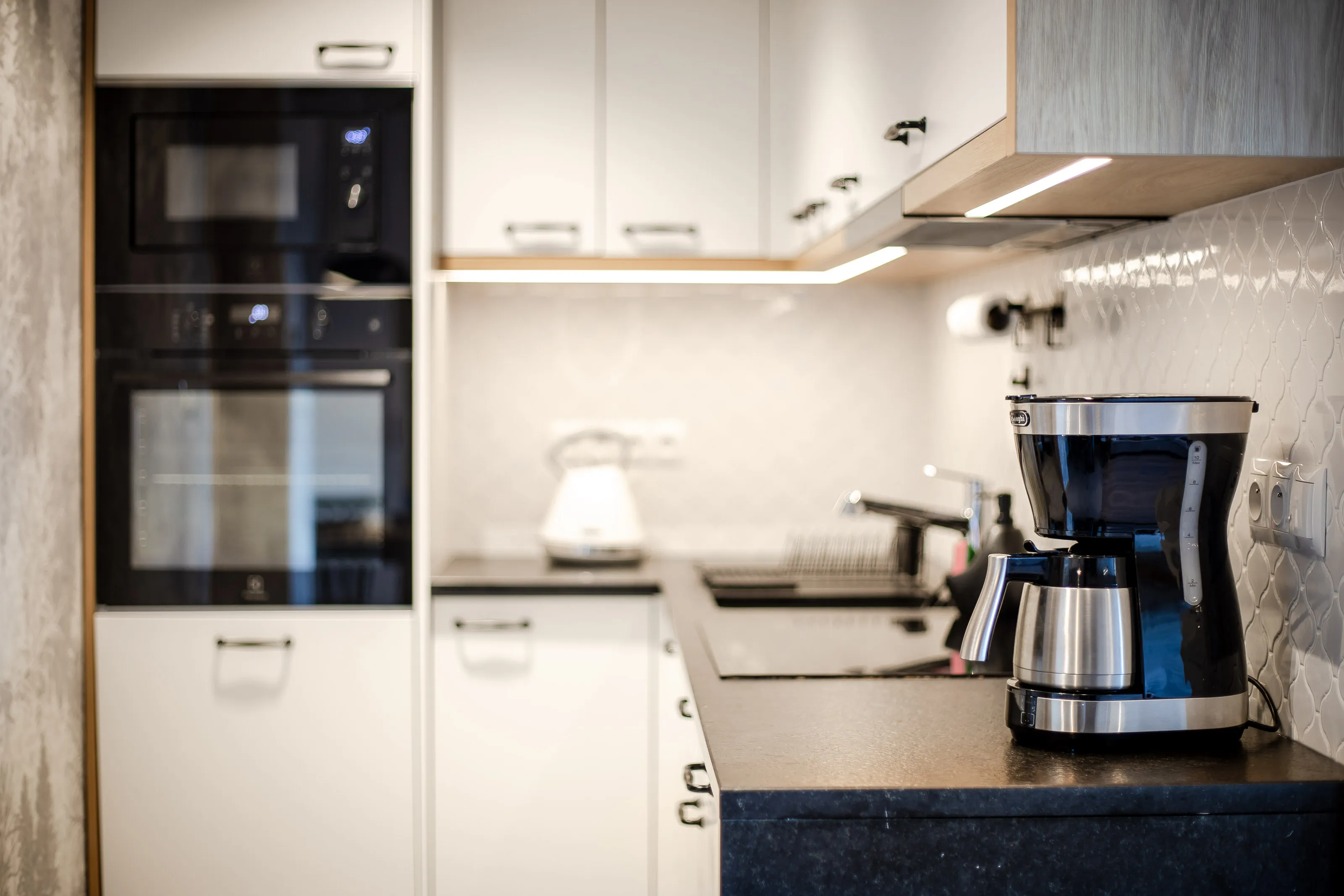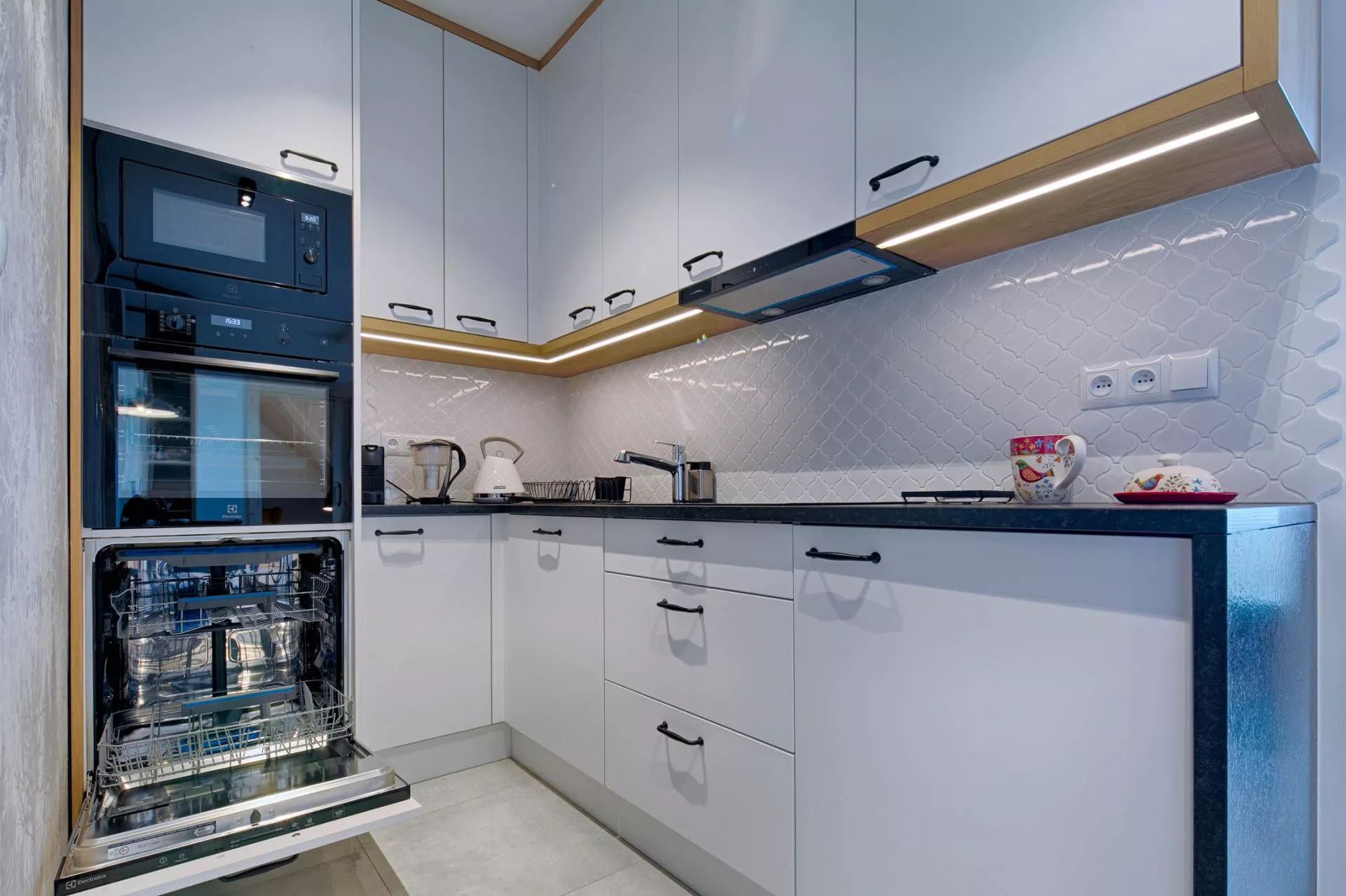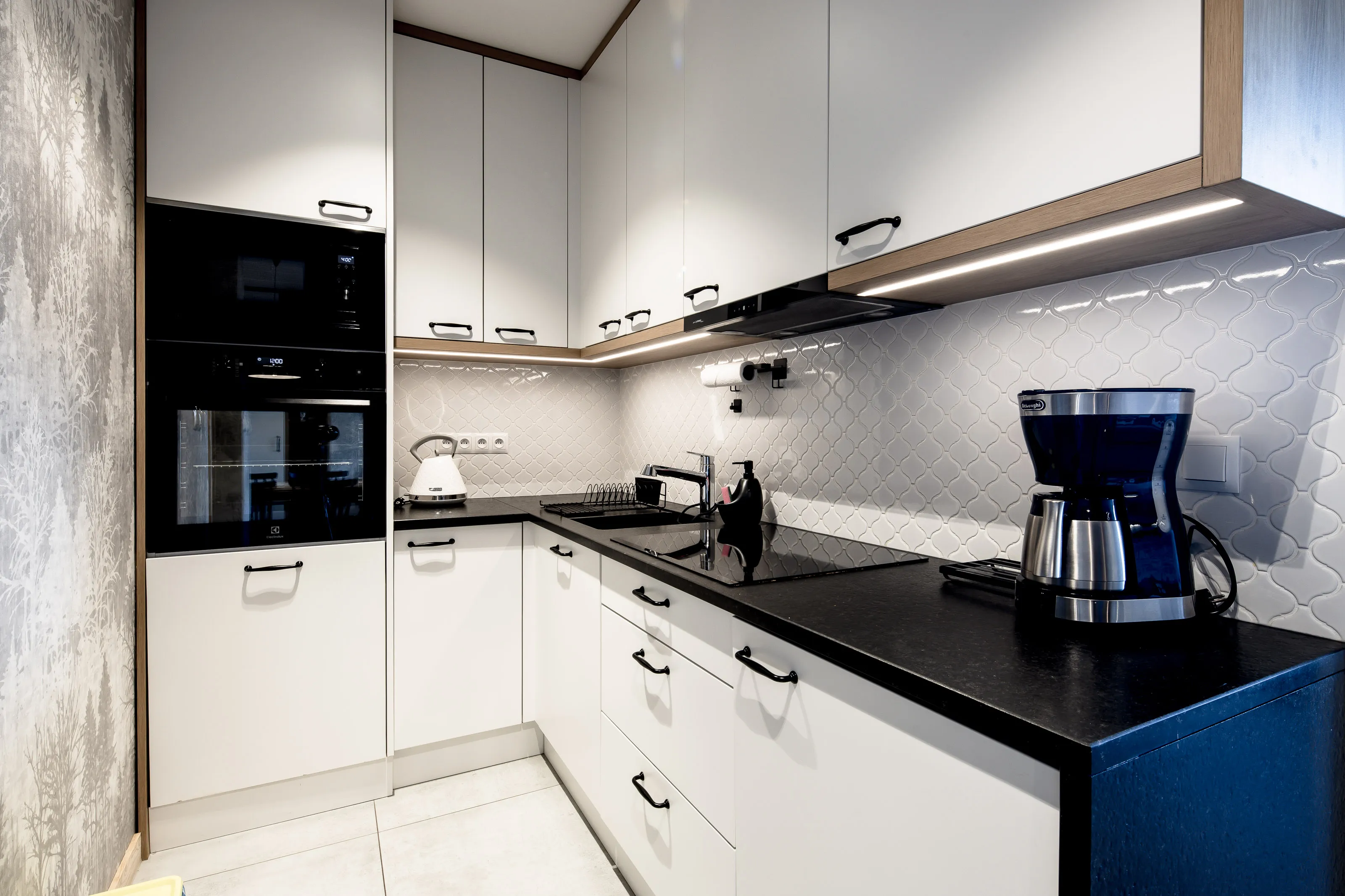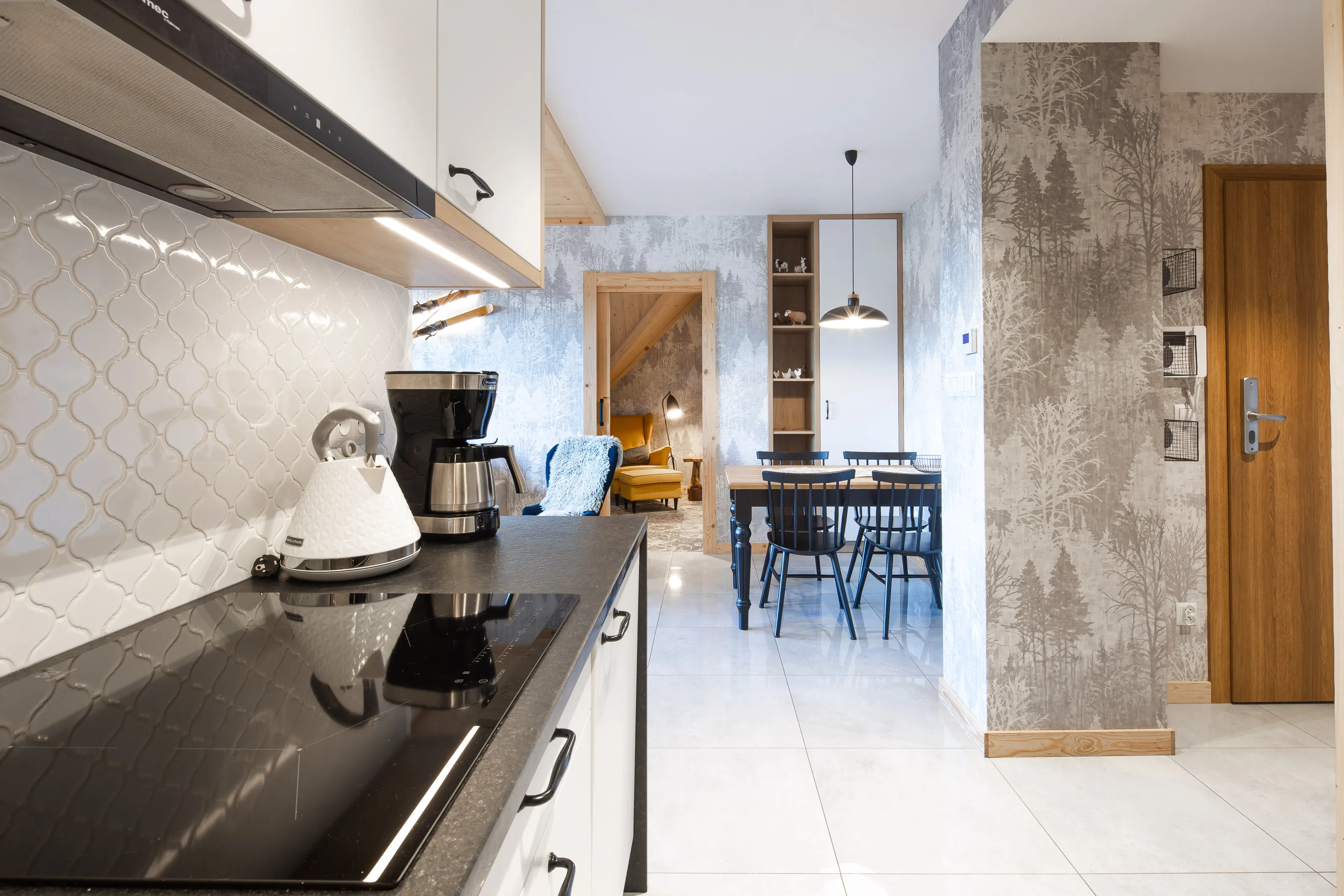 Aneks kuchenny: lodówka podblatowa, płyta indukcyjna czteropalnikowa, zmywarka, mikrofalówka, piekarnik, czajnik elektryczny, dzbanek filtrujący, zlew, zastawa szklana, kieliszki, garnki, patelnia, sztućce, akcesoria do gotowania