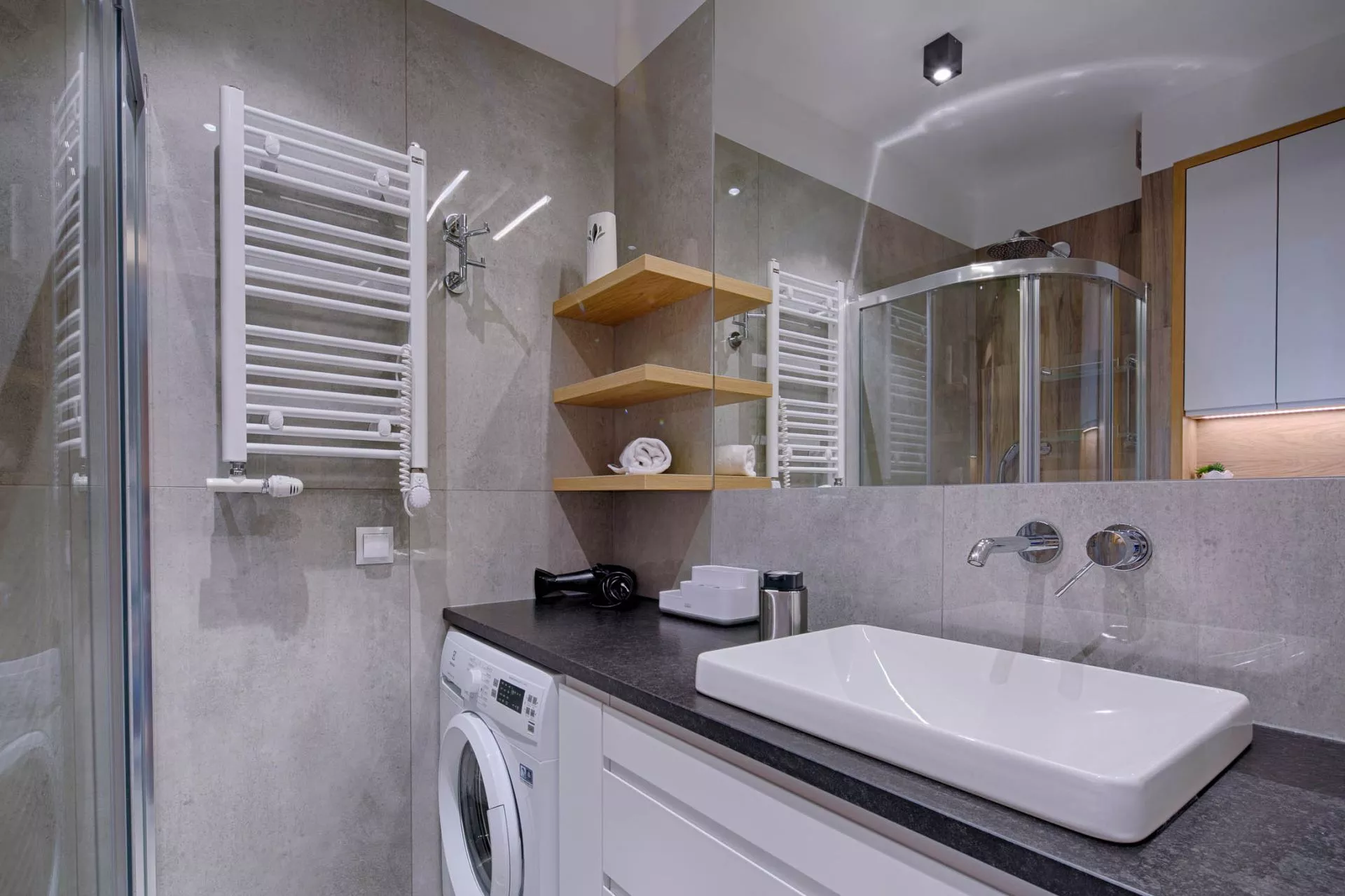 Łazienka: pralka, kabina prysznicowa z deszczownicą, wc, umywalka z szafką, suszarka do włosów