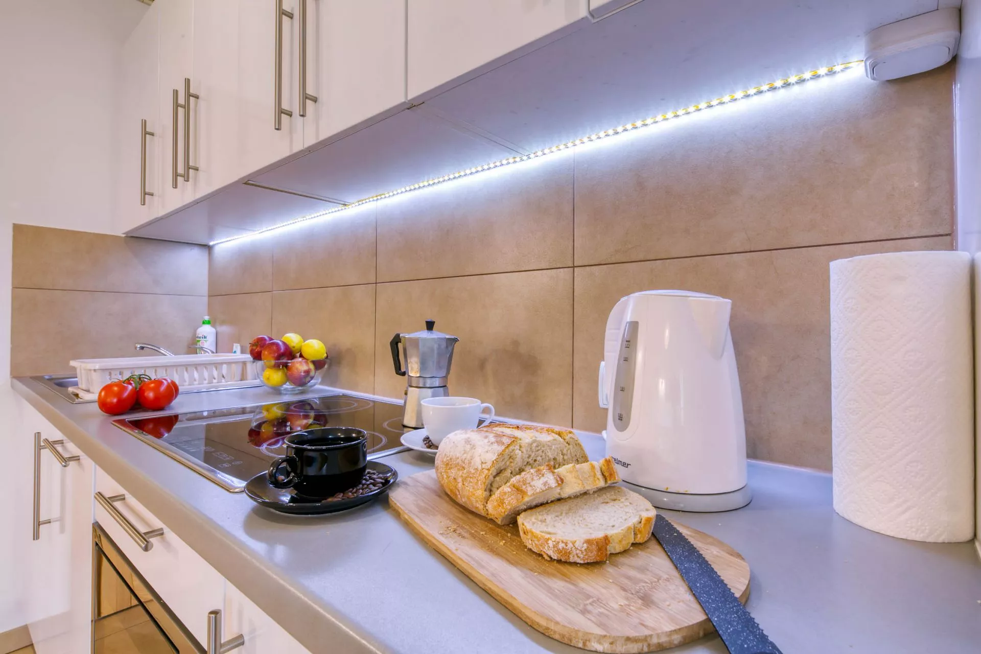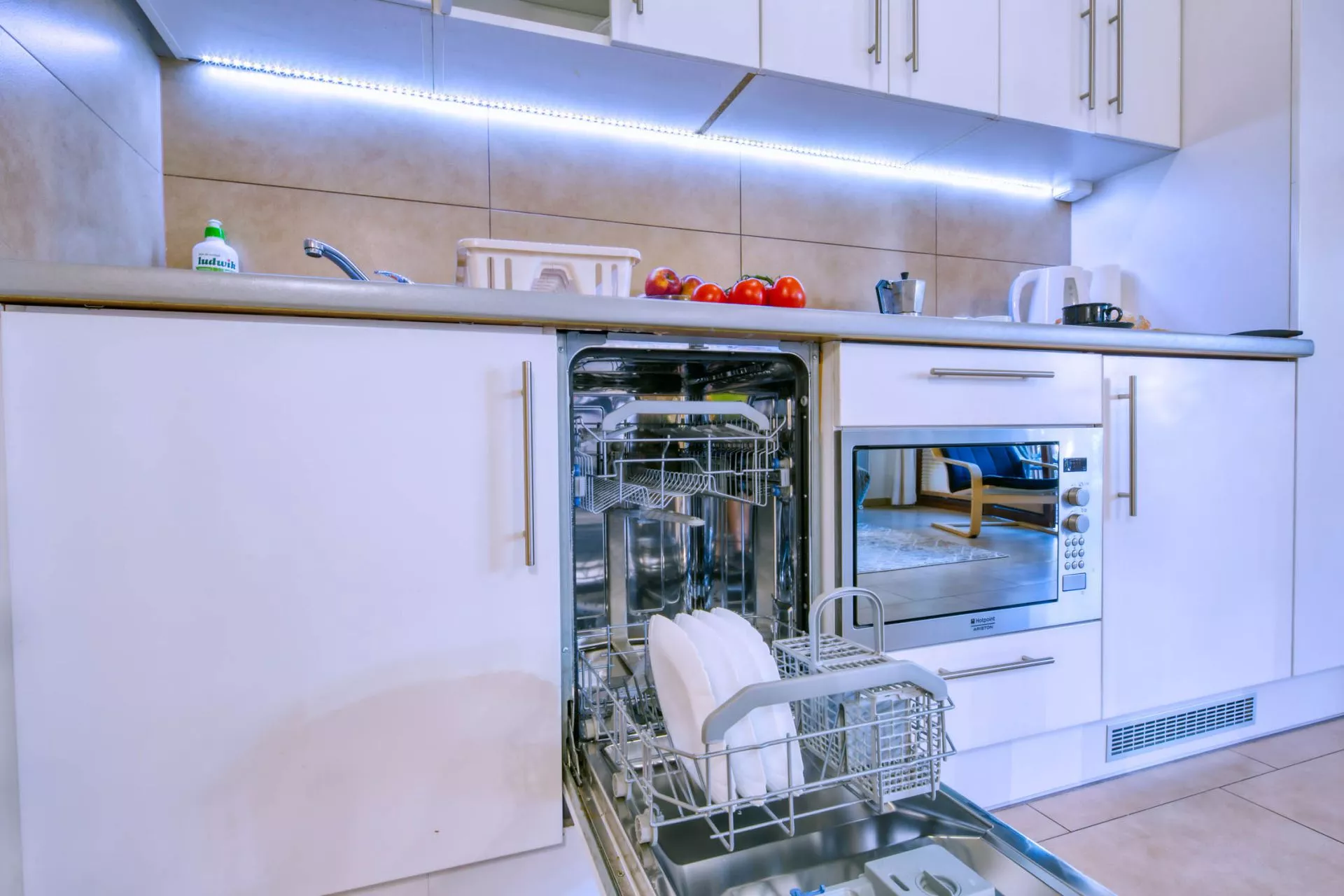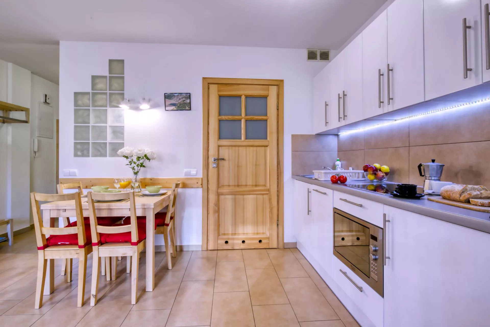 Aneks kuchenny: lodówka, zmywarka, płyta ceramiczna, kuchenka mikrofalowa, toster, naczynia, sztućce, garnki, zlew, kieliszki do wina i szampana
