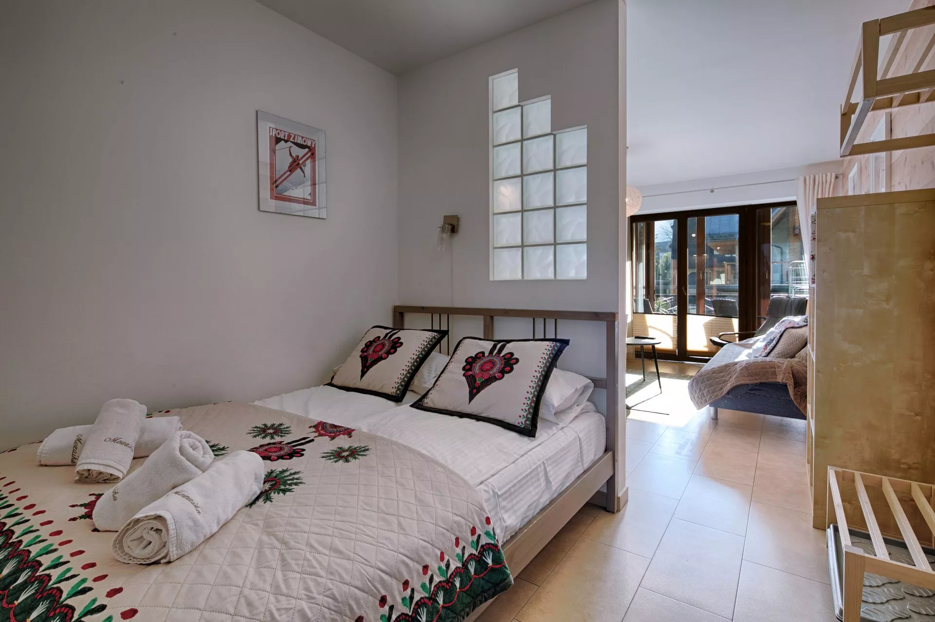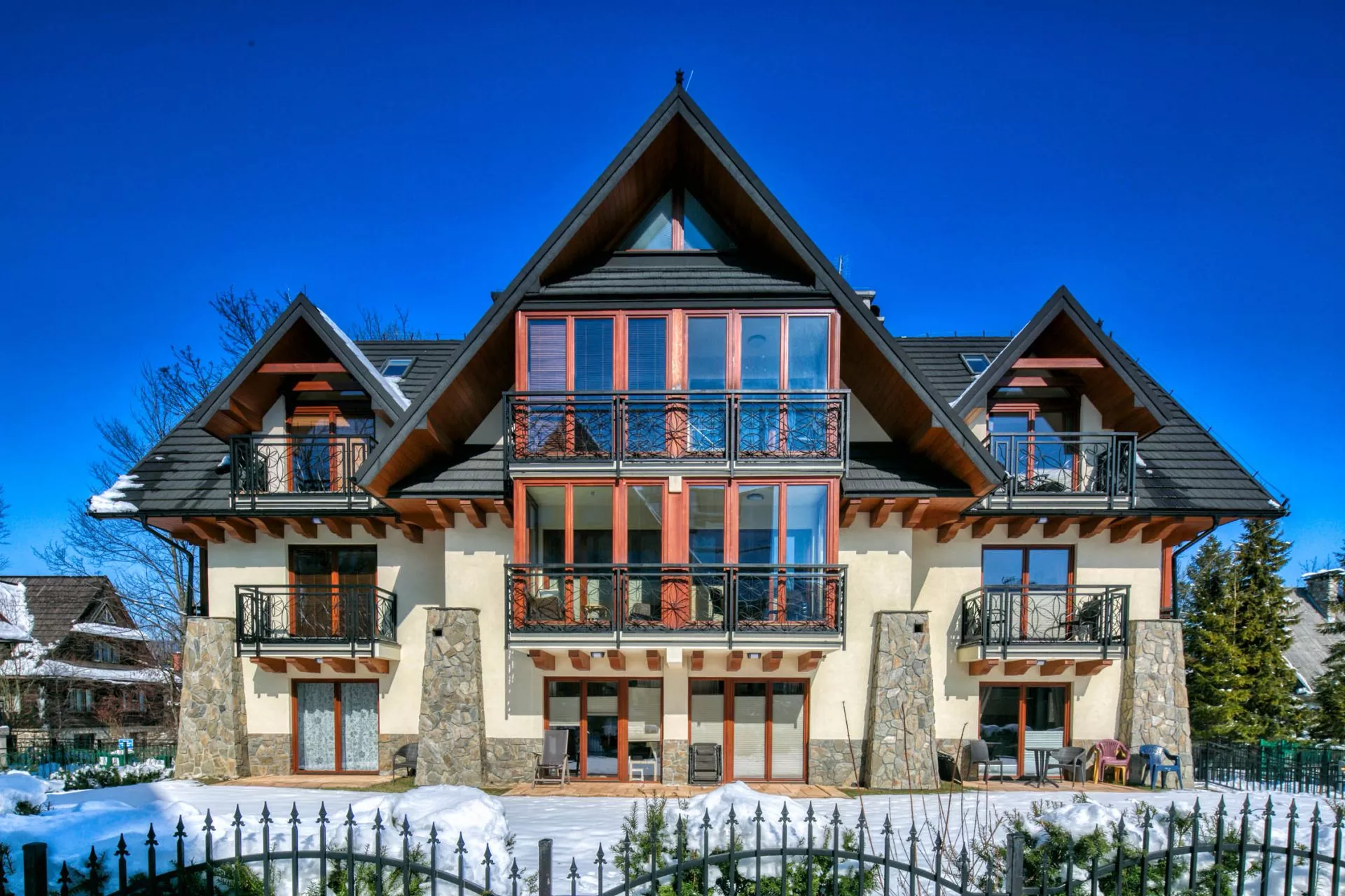 Apartament składa się z: salonu z aneksem kuchennym, sypialni we wnęce, łazienki i przeszklonego balkonu - ogrody zimowego. Teren wokół apartamentowca jest ogrodzony, a okolica bardzo bezpieczna i cicha. W odległości 300m znajduje się wejście do Doliny Białego - miejsca z którego rozpoczyna się szereg szlaków tatrzańskich.