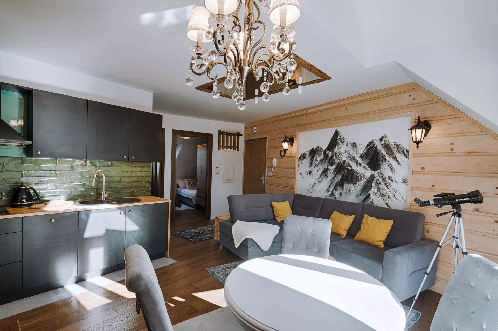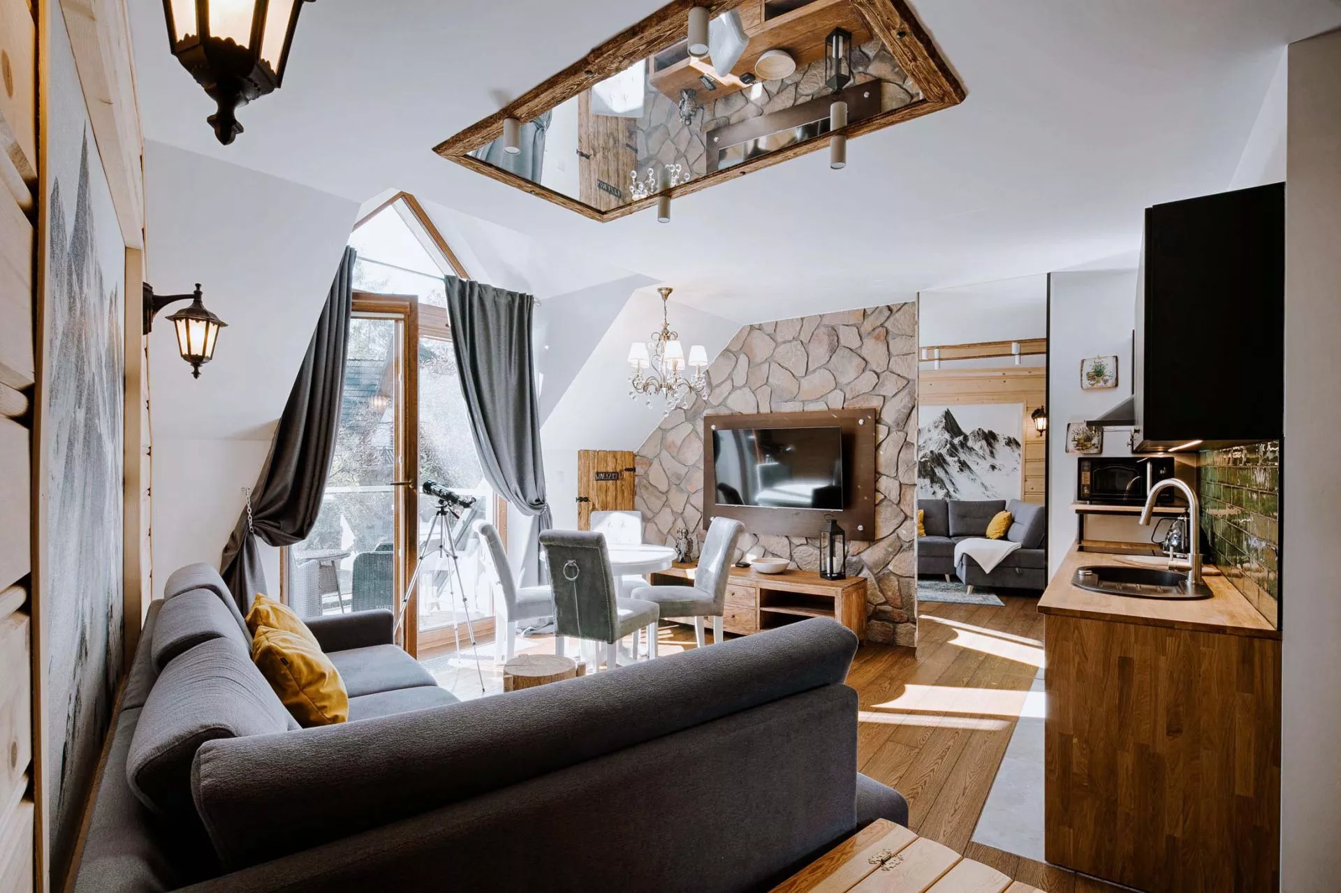 Komfortowy apartament dla 6 osób z przepięknym widokiem na Giewont! Zlokalizowany nieopodal wlotu Doliny Strążyskiej w wyjątkowo atrakcyjnej części Zakopanego. Aranżacja apartamentu to połączenie nowoczesnego desingu z elementami eleganckiego stylu glamour, wzbogacone elementami górskimi. Z okien sypialni można podziwiać widok na Gubałówkę, a z salonu słynny Giewont. W apartamencie do tego celu zainstalowana została specjalna luneta, dzięki której o każdej porze dnia można obserwować turystów zdobywających ten słynny szczyt! W apartamencie zainstalowane jest łącze światłowodowe (bezpłatne WiFi) i Netflix. Kąpiel w łazience umilają dźwięki muzyki, z zainstalowanego tu systemu audio!