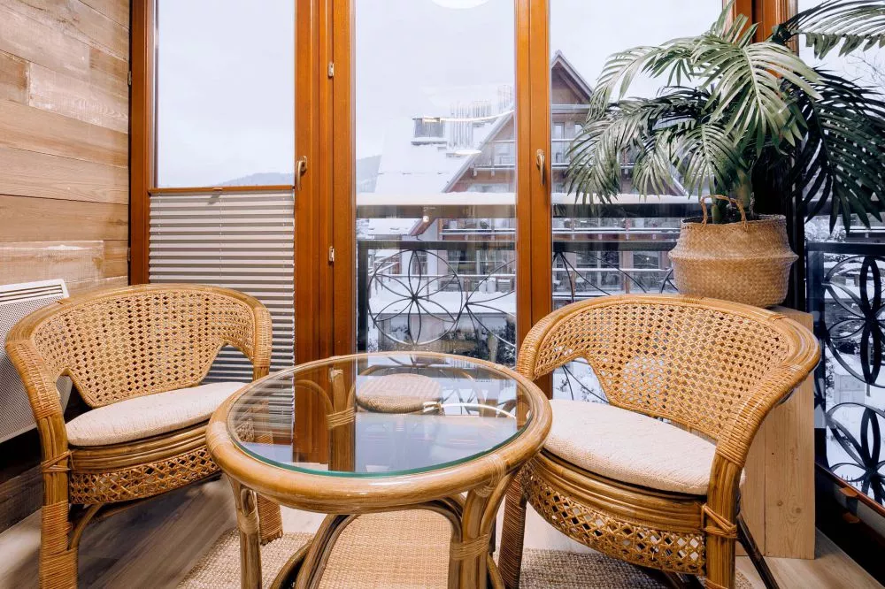 Zabudowany balkon: 2 wiklinowe fotele + stolik kawowy
