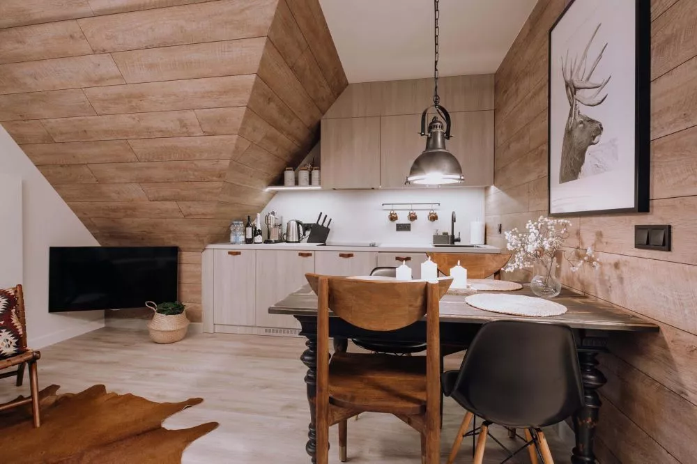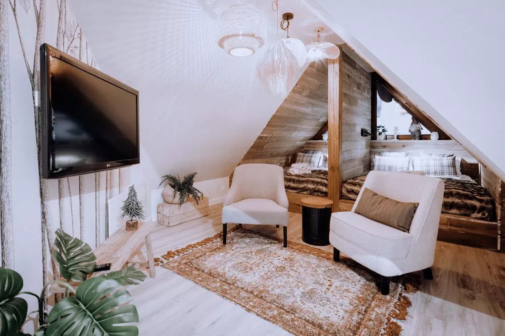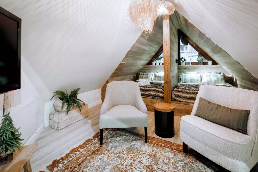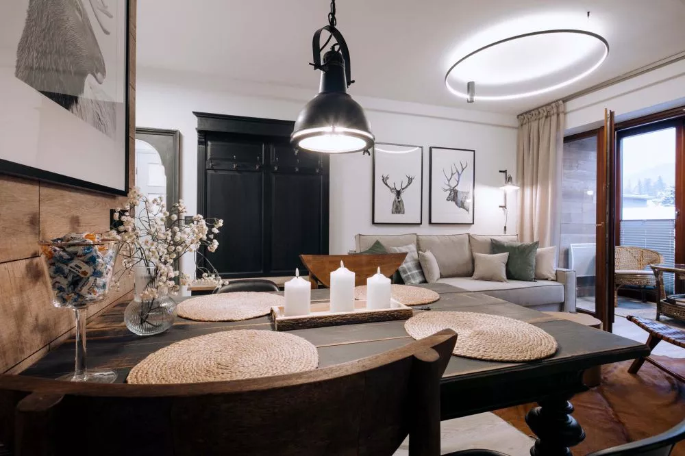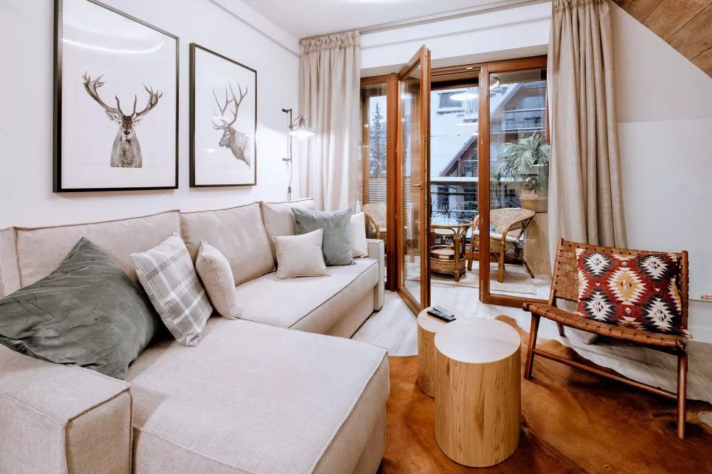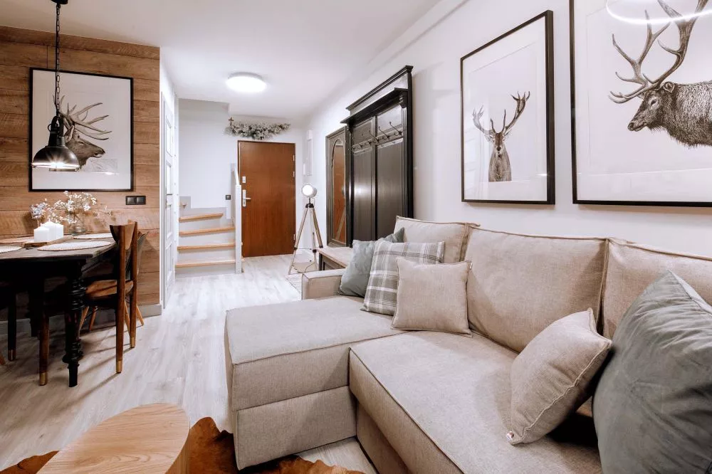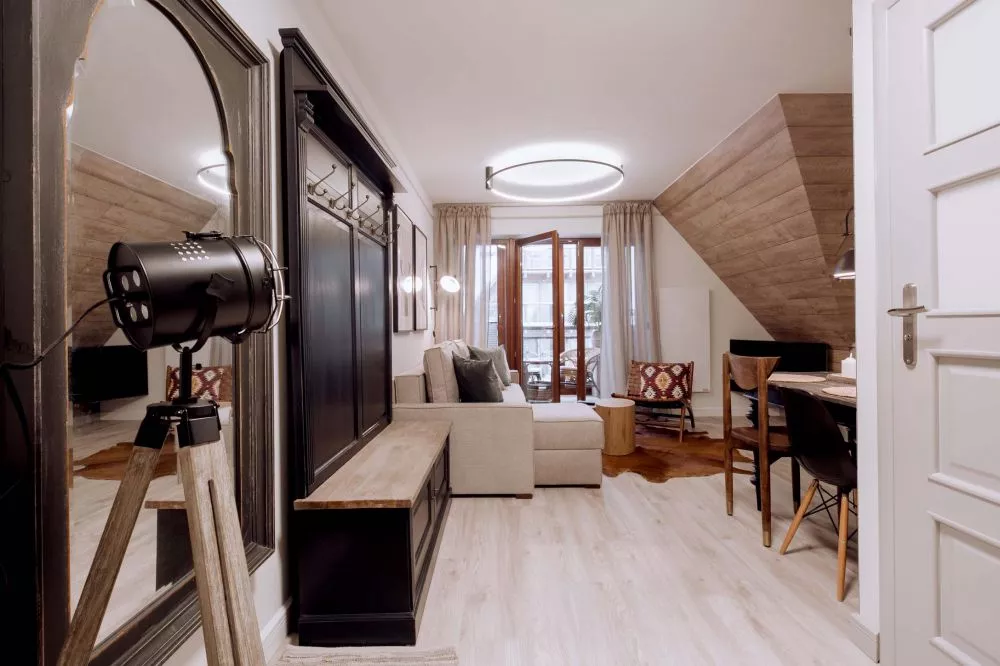 2-poziomowy apartament dla 6 osób zlokalizowany w centrum Zakopanego - 5 minut drogi od ulicy Krupówki. Apartament mieści się na 2 piętrze budynku małego, kameralnego apartamentowca z garażem podziemnym. Teren wokół apartamentowca jest ogrodzony, a okolica bardzo bezpieczna i cicha. W odległości 300m od budynku znajduje się wejście do Doliny Białego - miejsca z którego rozpoczyna się szereg szlaków tatrzańskich. Odległości do innych popularnych miejsc turystycznych: Park Miejski - 500m, Skocznia narciarska i trasy biegowe - 1500m, kino Sokół - 700m, basen, SPA, siłownia - 250m, sklep spożywczy - 100m, Restauracje i Karczmy Regionalne - 200m.