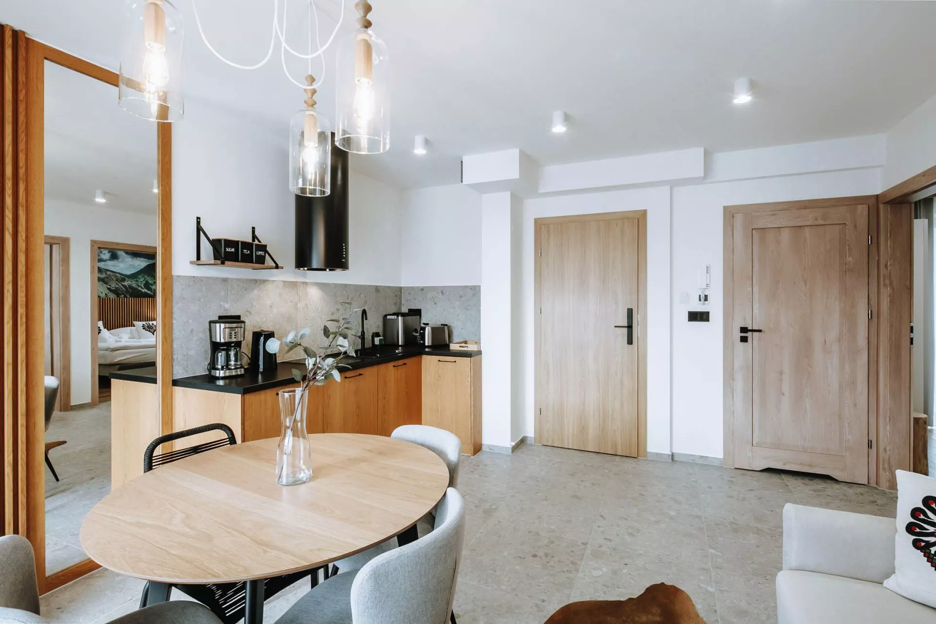 Salon: 2 osobowa rozkłada sofa, fotel, stolik kawowy, okrągły stół, 4 krzesła, TV'45, szafka rtv, wyjście na balkon z pięknym widokiem na panoramę Tatr, klimatyzacja.