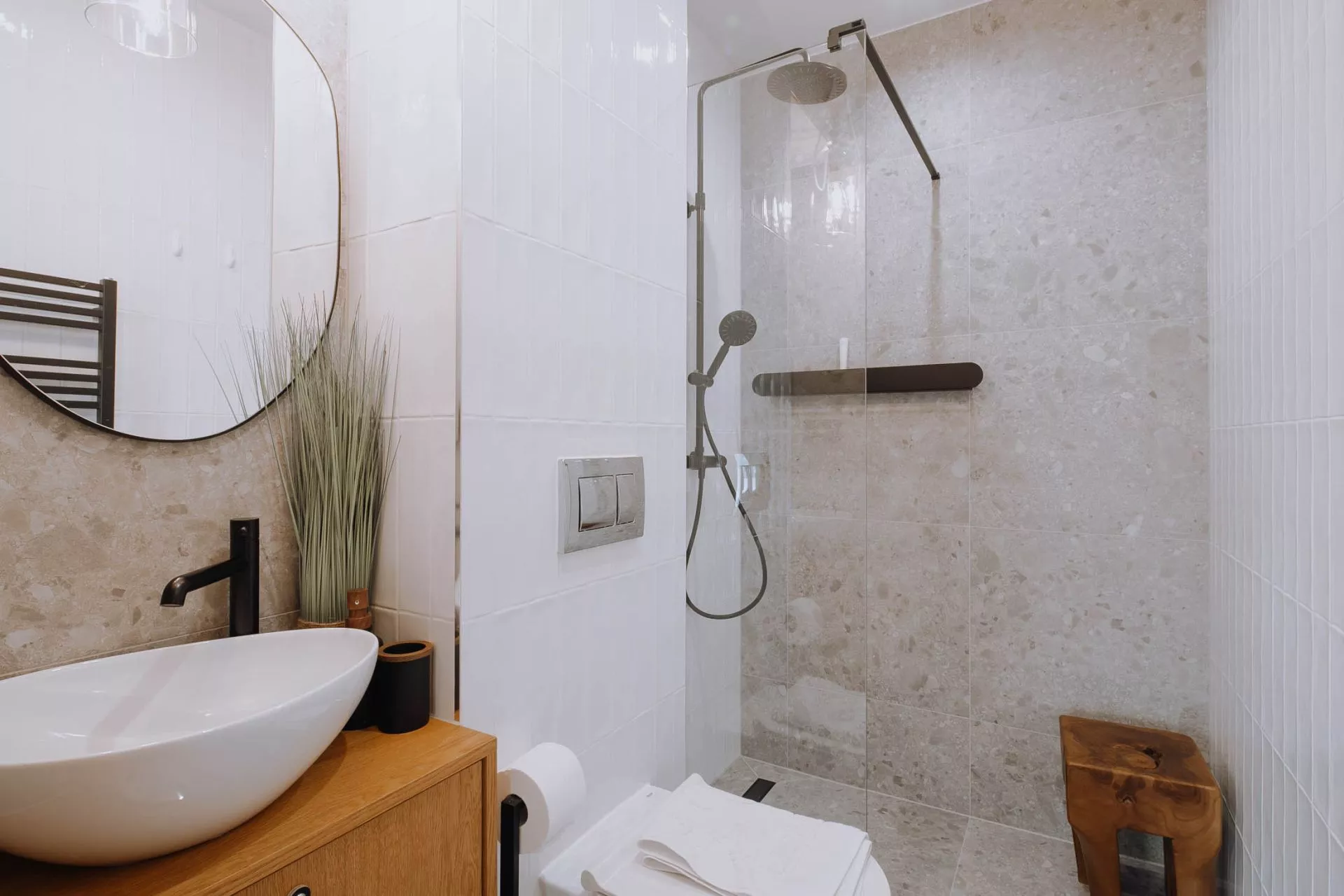 Łazienka - prysznic, umywalka, toaleta, lustro, grzejnik ręcznikowy, suszarka do włosów
