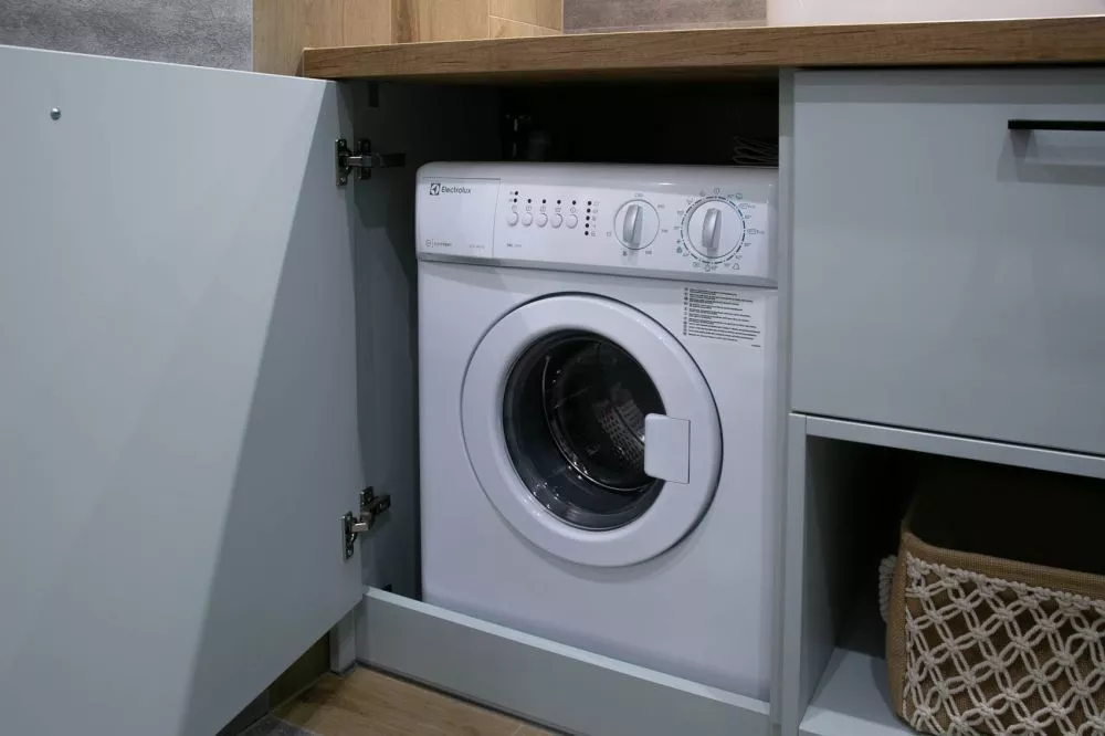 Łazienka: kabina prysznicowa, umywalka, toaleta, pralka, suszarka do włosów