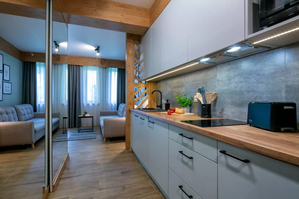 Przytulny apartament dla 4 osób w ścisłym centrum Zakopanego, zlokalizowany pomiędzy Krupówkami (5 minut spacerkiem), a kompleksem skoczni narciarskich Wielka Krokiew. Mieści się w budynku nowoczesnego apartamentowca z windą.
