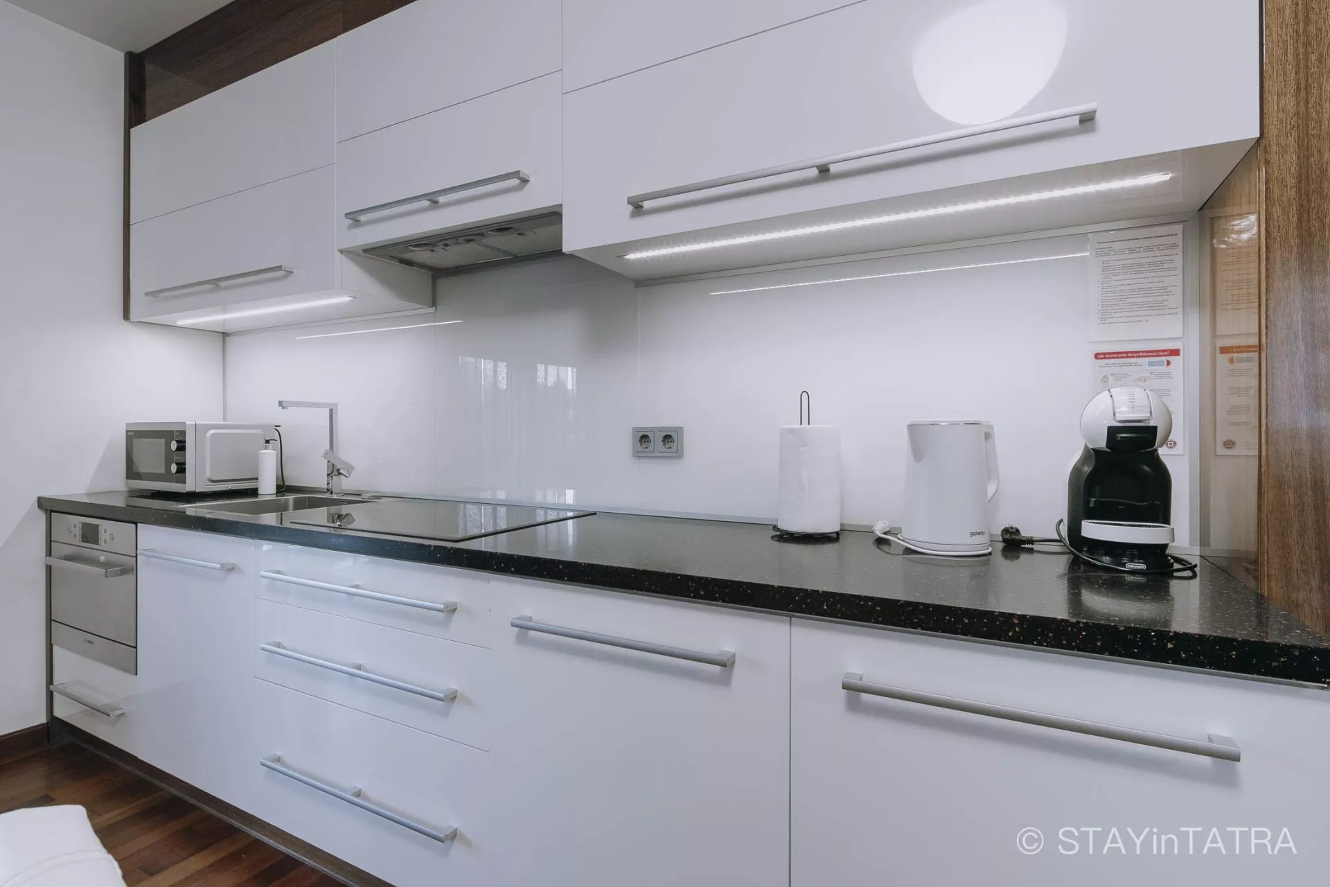 Aneks kuchenny: duża lodówka, zamrażarka, kuchenka mikrofalowa, piekarnik, czajnik elektryczny, zmywarka, 4 palnikowa płyta elektryczna, naczynia, sztućce, garnki, zastawa szklana