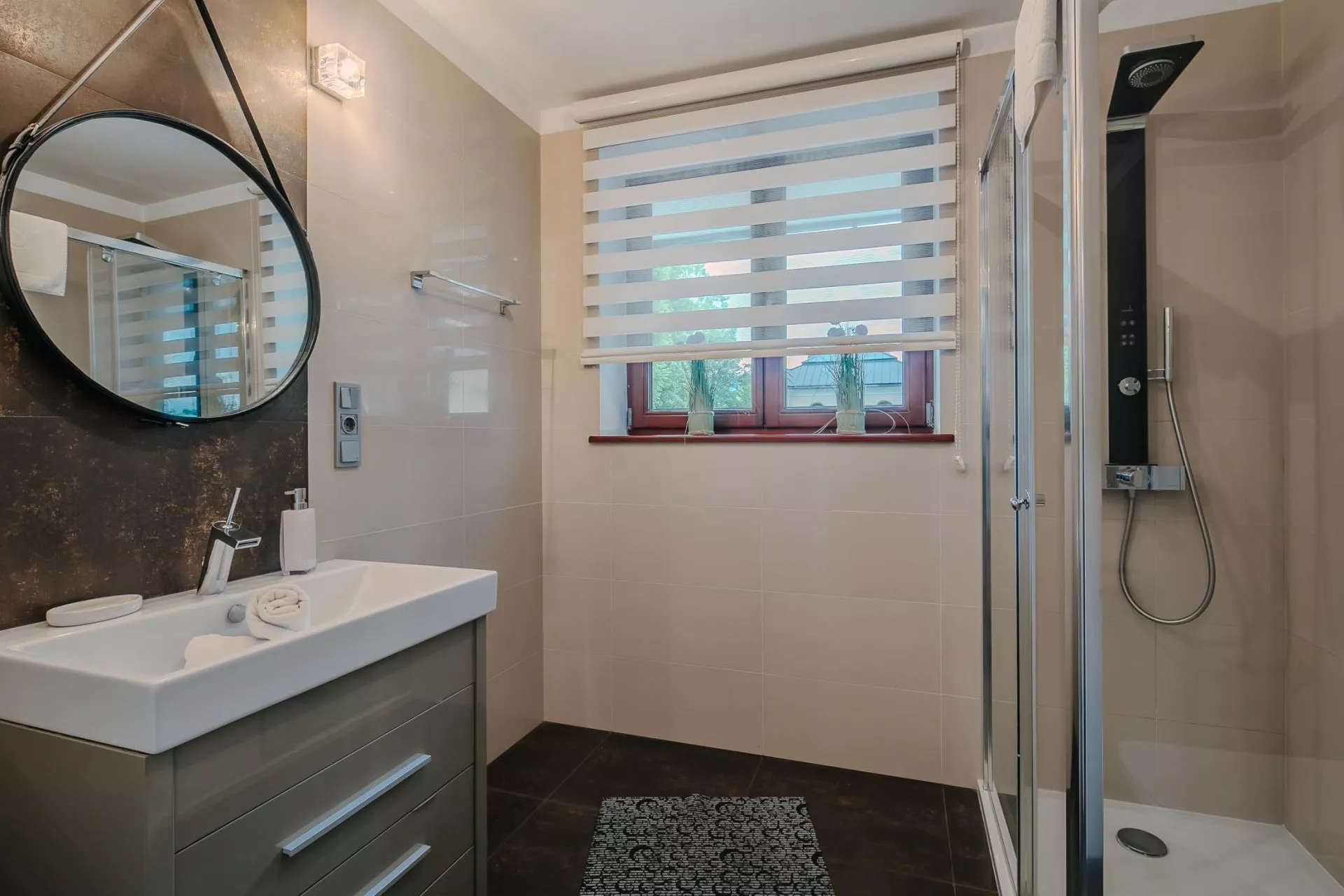 Łazienka: kabina prysznicowa, umywalka, toaleta, suszarka do włosów