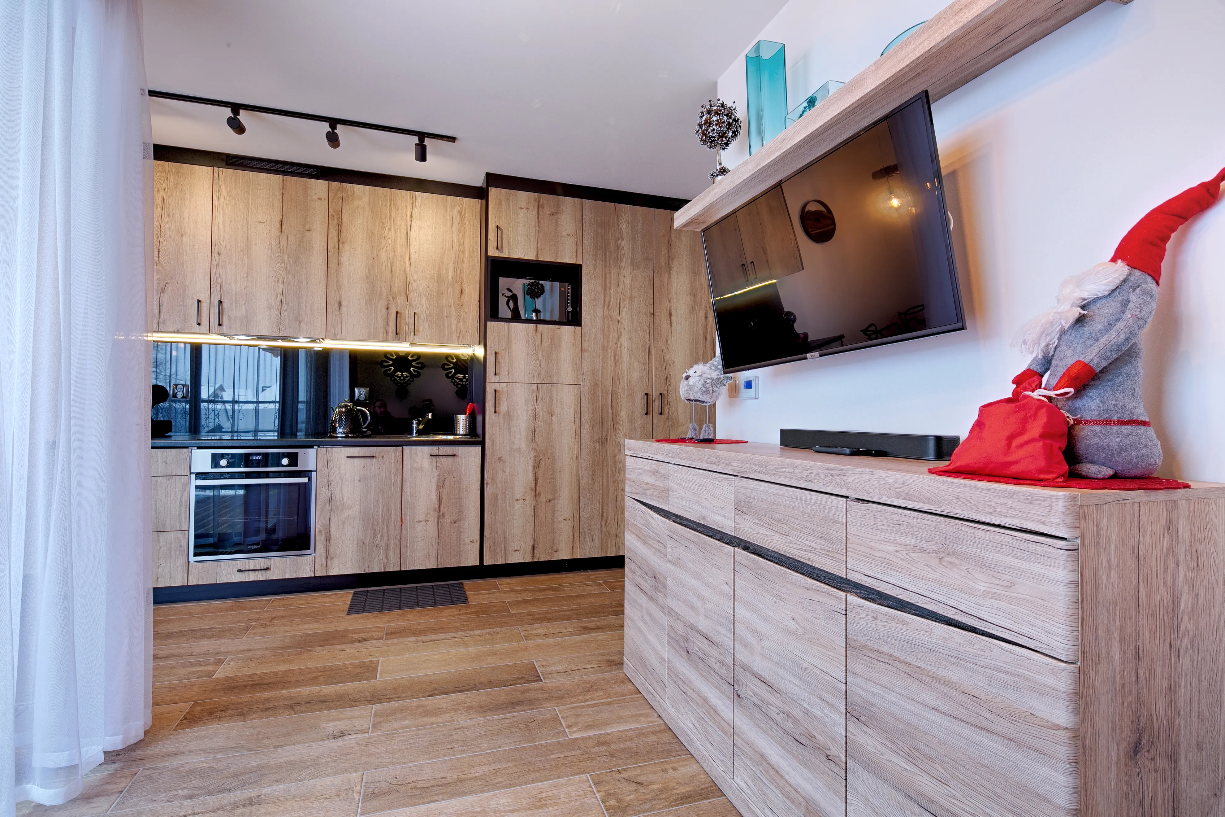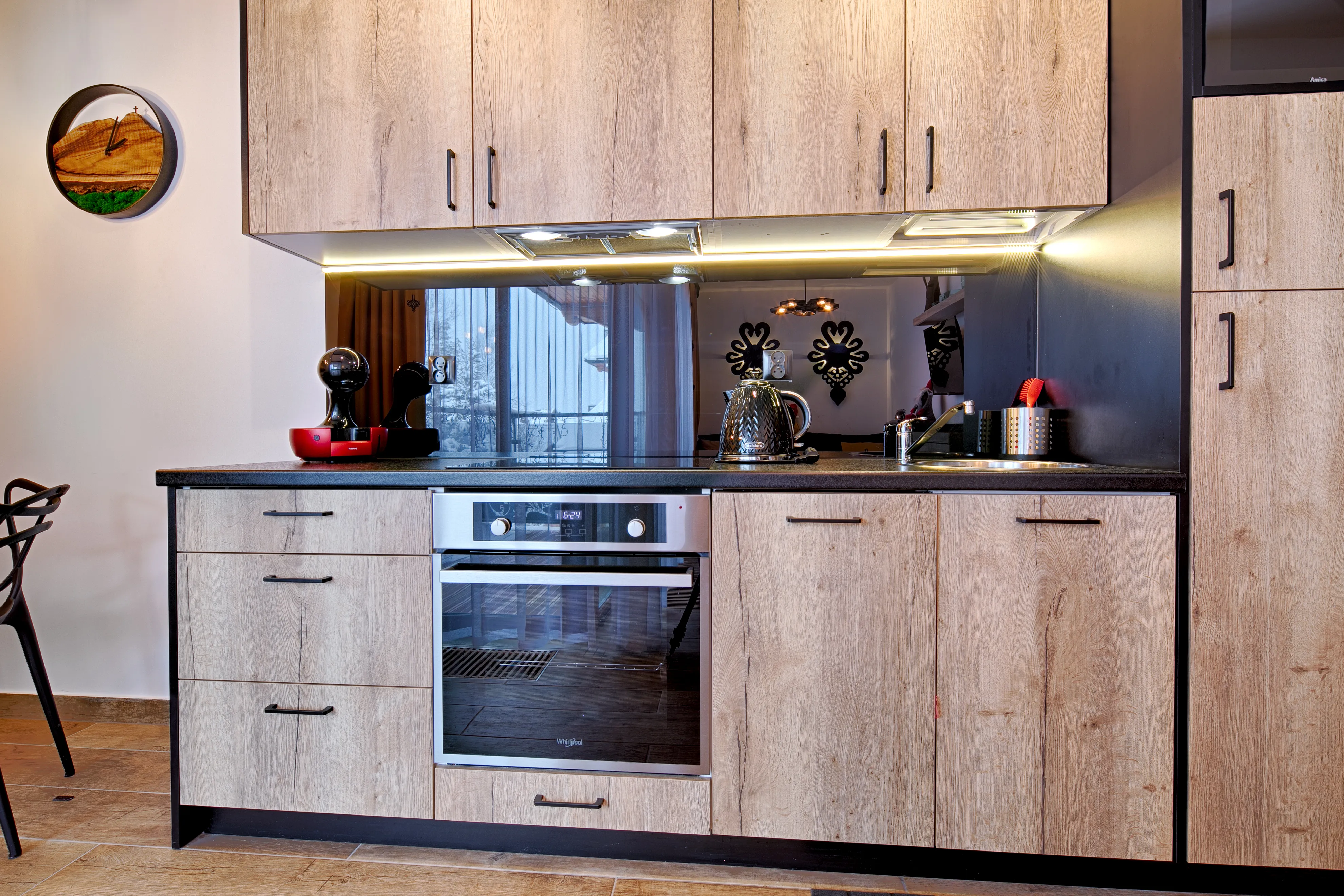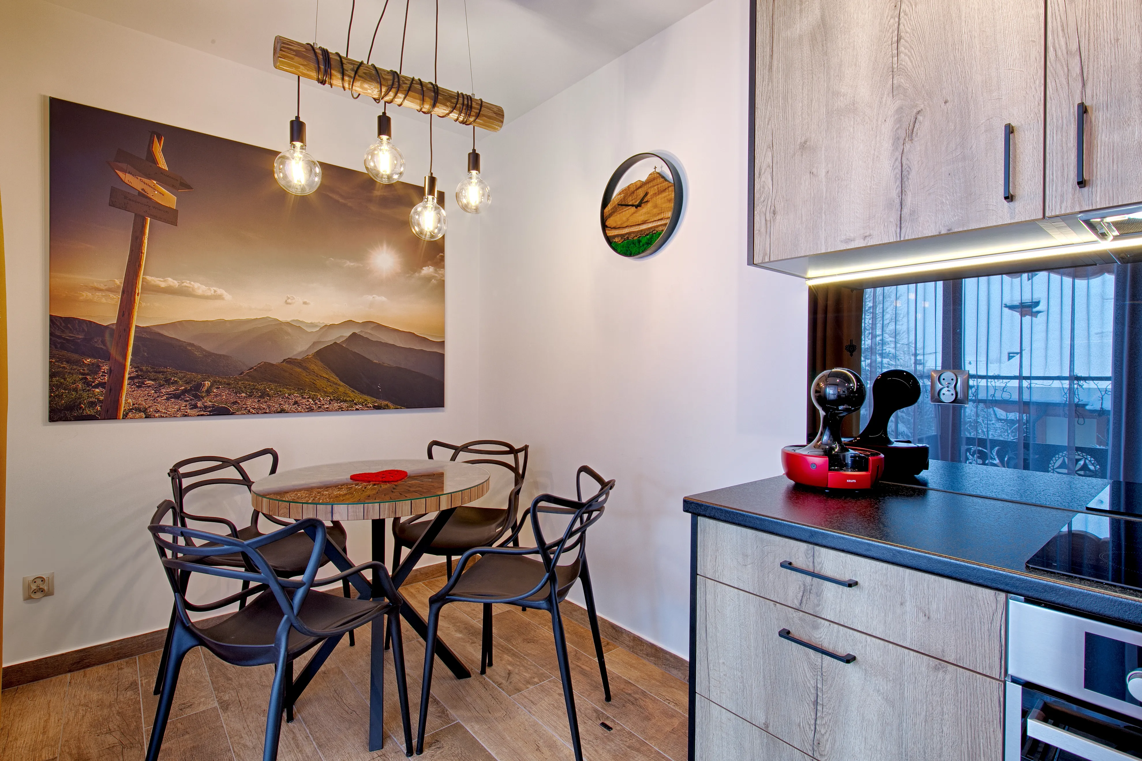 Aneks kuchenny: stół okrągły z 4 krzesłami, piekarnik, czajnik elektryczny, ekspres do kawy Nescafe Dolce Gusto, czteropalnikowa płyta indykcyjna, duża lodówka, jednokomorowy zlew, zmywarka, toster, mikrofalówka, zastawa szklana, kieliszki, garnki, patelnia, sztućce, akcesoria do gotowania