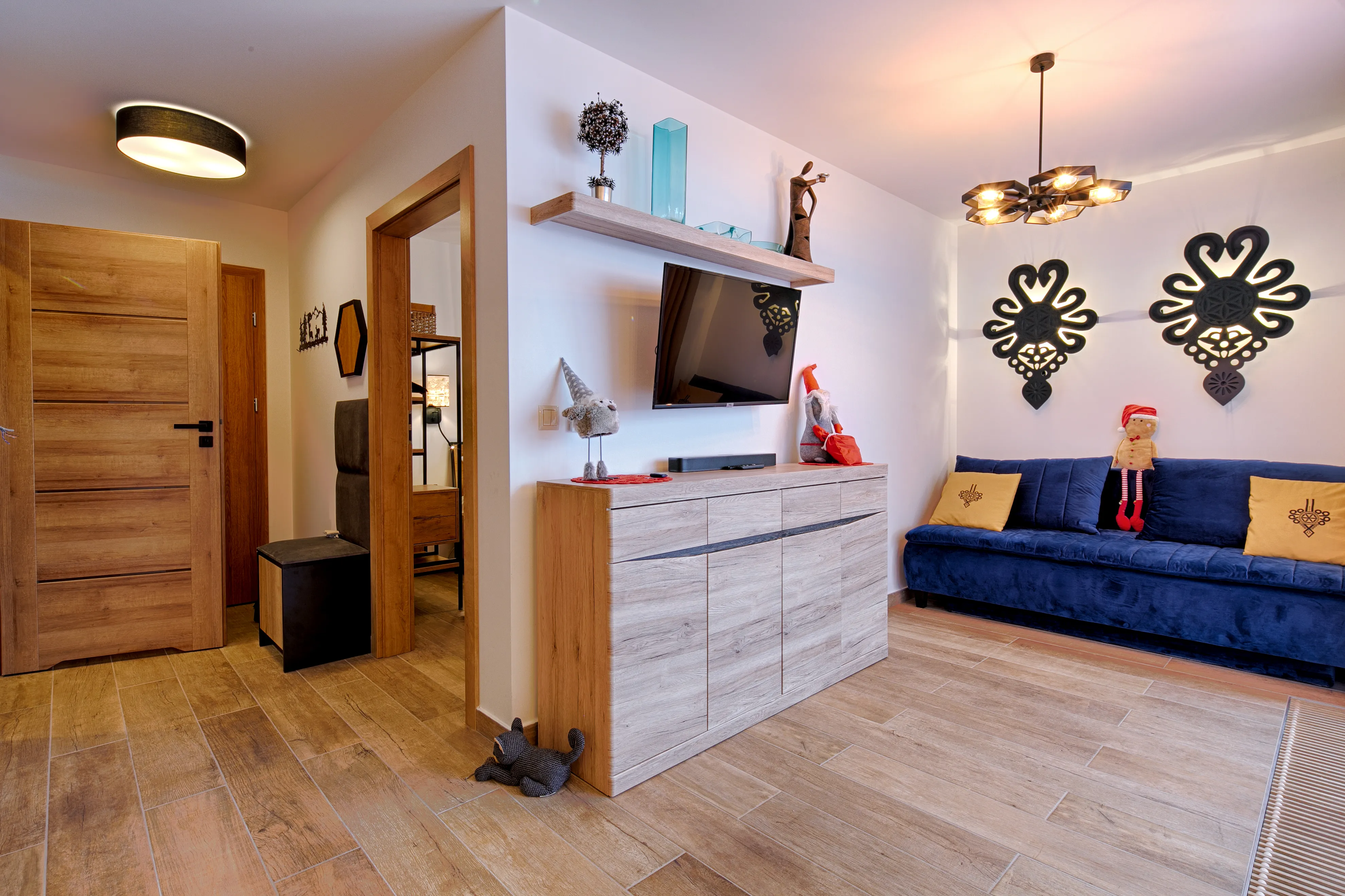 Salon: rozkładana sofa dwuosobowa, duża komoda, telewizor TCL, soundbar JBL gry, puzzle dla dzieci, przeszklona ściana, wyjście na balkon