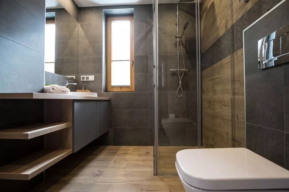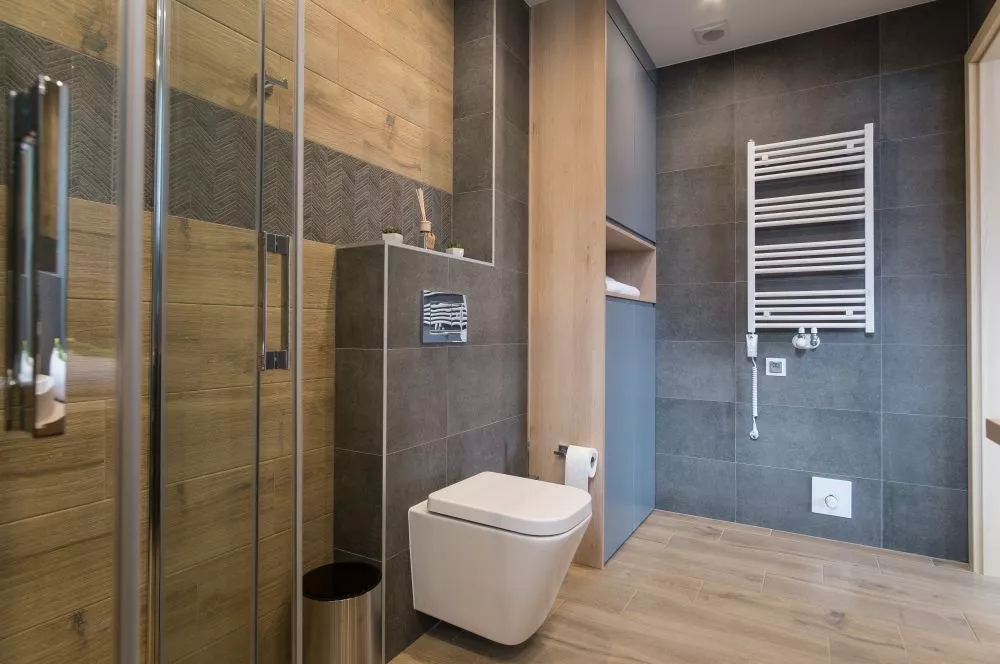 Łazienka: kabina prysznicowa, umywalka, toaleta, pralka, suszarka do włosów