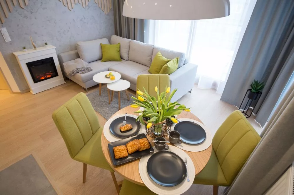 Salon: rozkładana 2-osobowa kanapa narożna (140x200cm), stolik kawowy, stół jadalniany, 4 krzesła, TV 50’, kominek elektryczny, wyjście na balkon