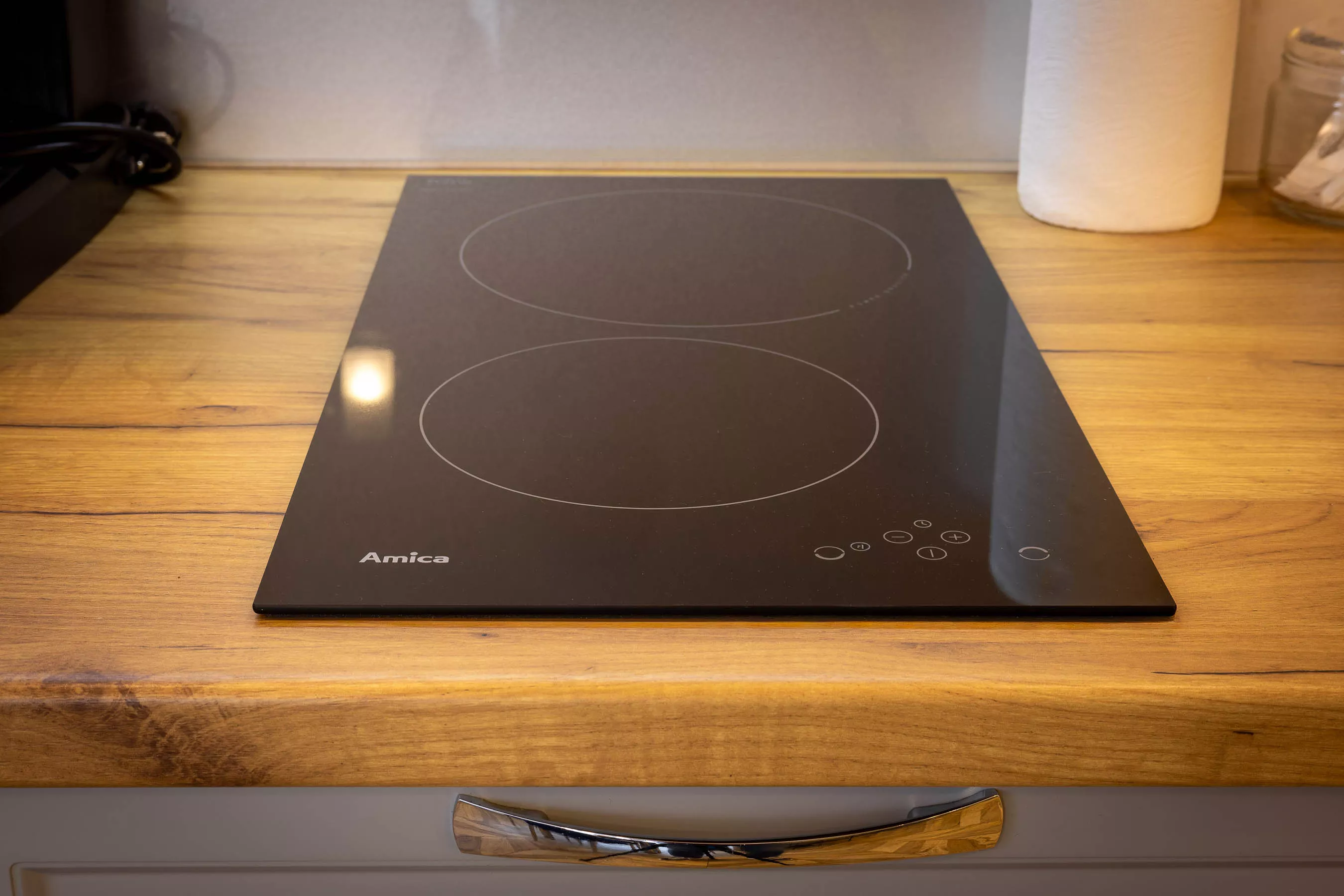 Aneks kuchenny: lodówka, 2 palnikowa płyta ceramiczna, czajnik elektryczny, ekspres do kawy, zmywarka, toster, kuchenka mikrofalowa, naczynia, sztućce, garnki, zastawa szklana