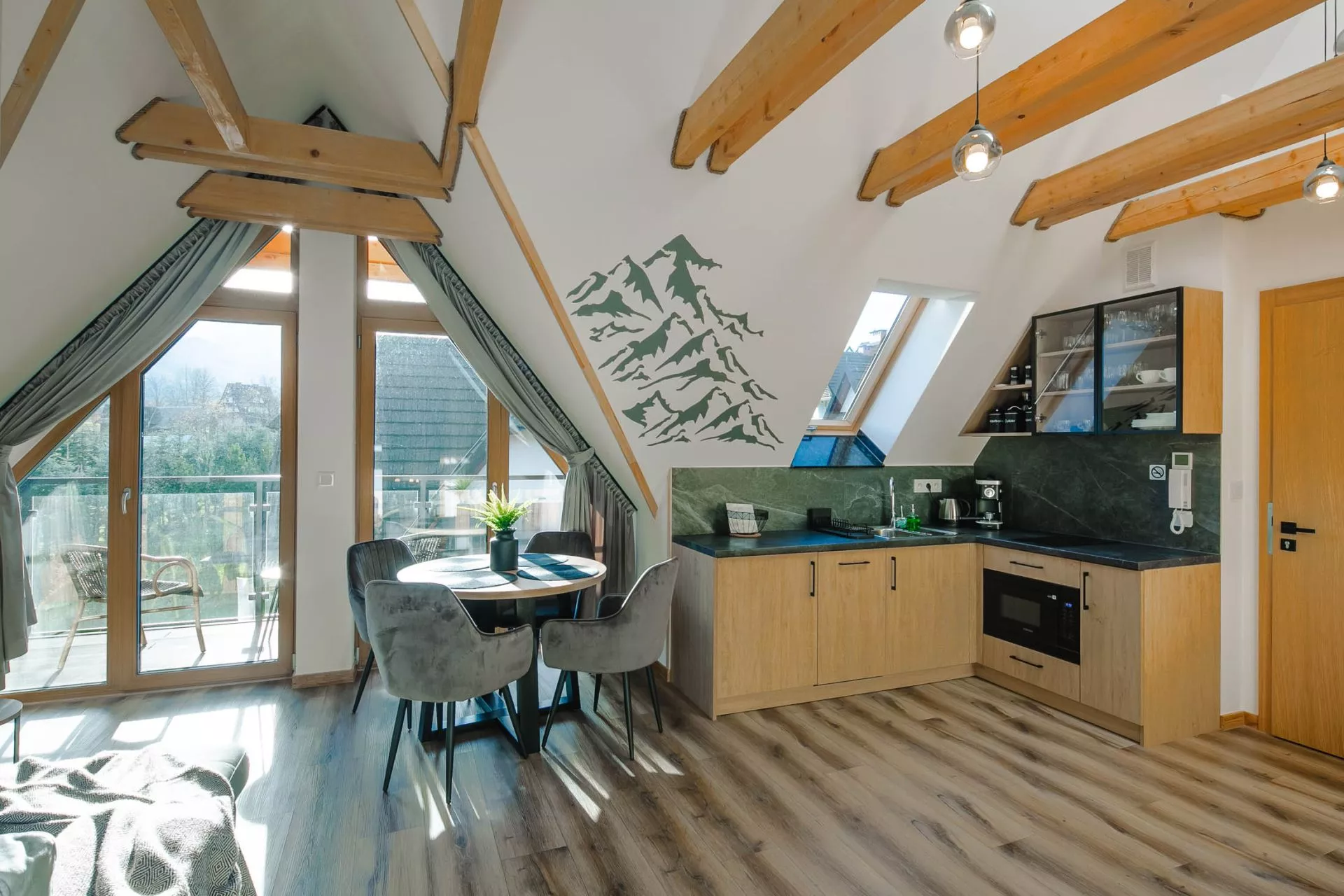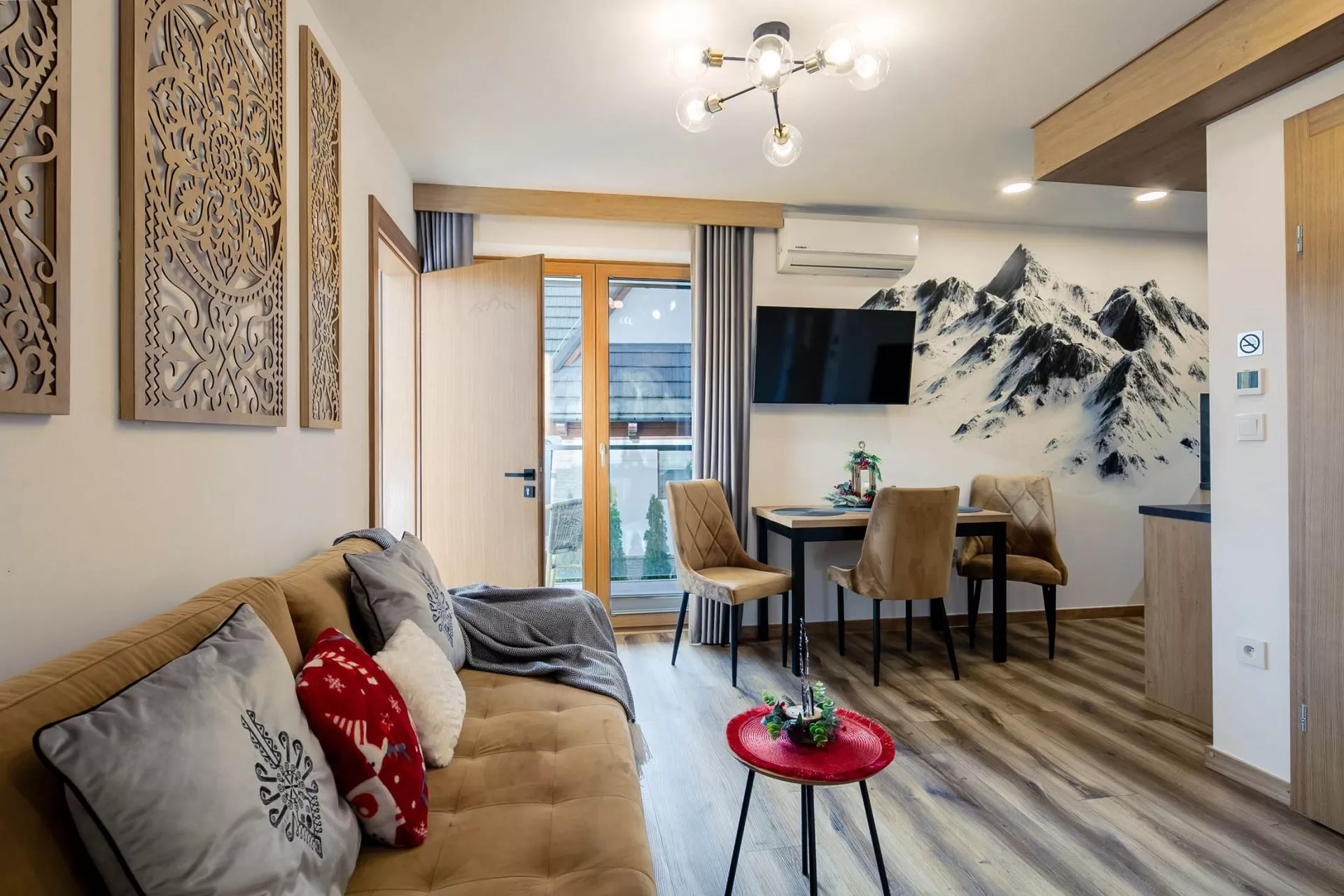 Salon: 2 osobowa rozkładana sofa, stolik kawowy, stół, 3 krzesła, TV'45, wyjście na balkon z pięknym widokiem na panoramę Tatr z meblami ogrodowymi, szafa, klimatyzacja.