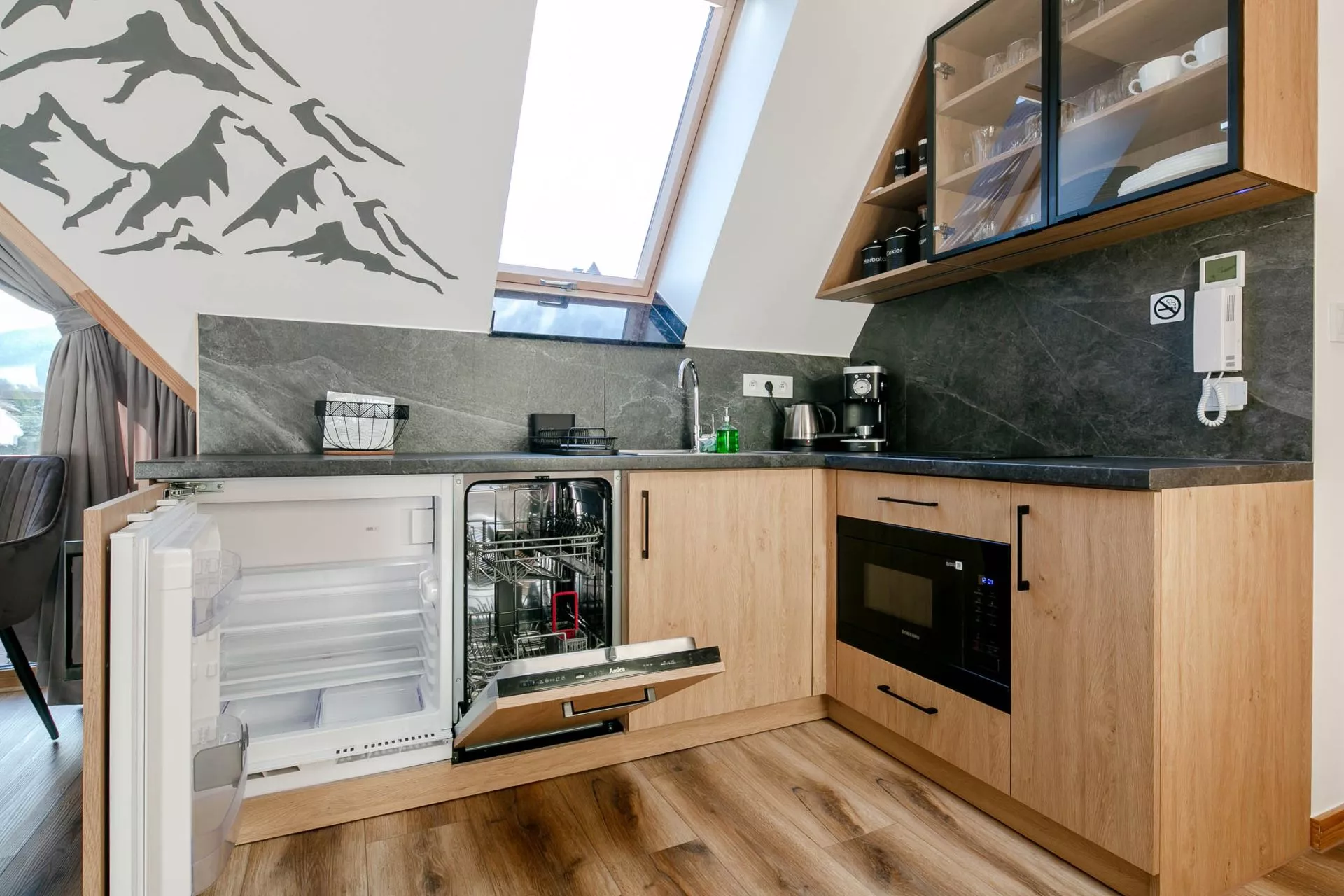 Aneks kuchenny: lodówka, zmywarka, płyta grzewcza 2 palnikowa, czajnik elektryczny, kuchenka mikrofalowa, komplet naczyń, garnków, sztućców, zastawa szklana.