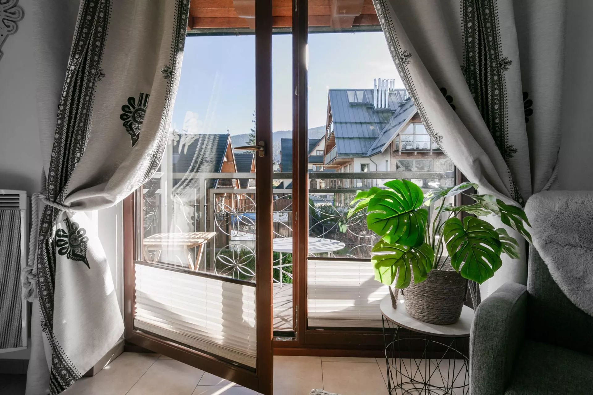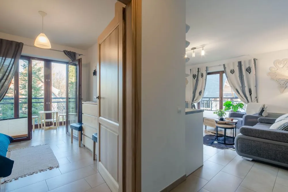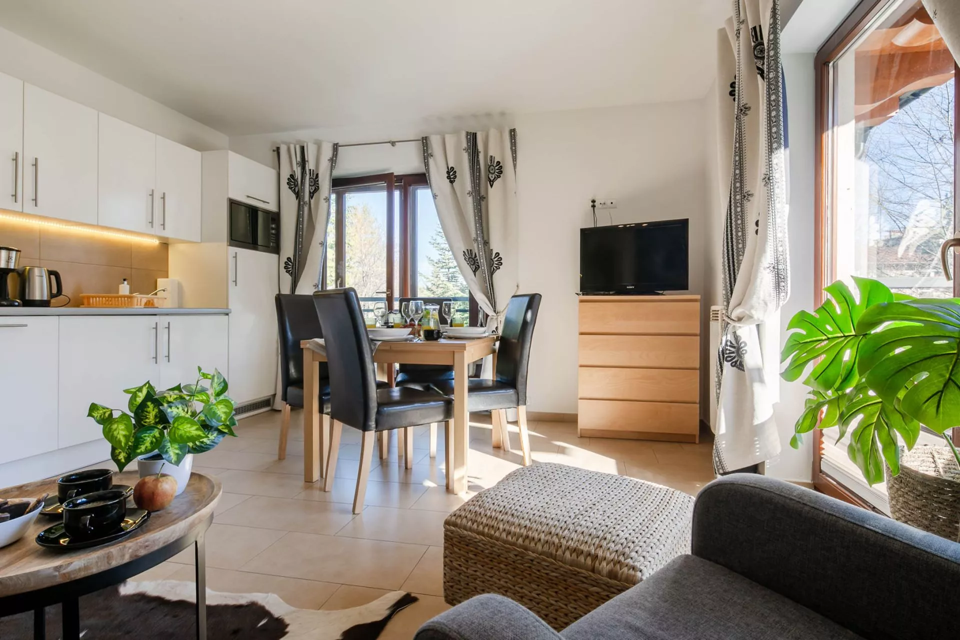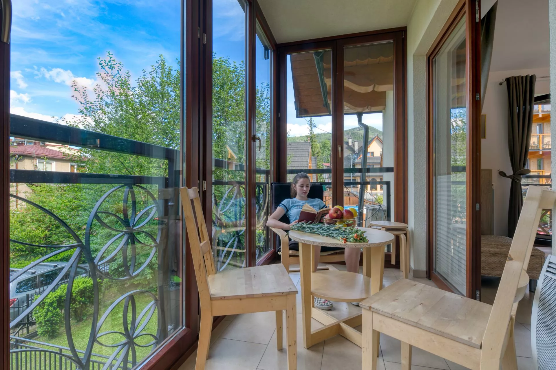 Apartament dla 6 osób, z dwiema osobnymi sypialniami, salonem, aneksem kuchennym, łazienką, balkonem i ogrodem zimowym. Ścisłe centrum, 5 minut od Krupówek. Apartament znajduje się na 1 piętrze stylowego budynku apartamentowca. Dla gości apartamentu zarezerwowane jest 1 miejsce parkingowe w garażu podziemnym. Brama wjazdowa do garażu podziemnego ma wysokość 2 m i szerokość 3 m. Teren wokół apartamentowca jest ogrodzony, a okolica bardzo bezpieczna i cicha. Budynek zlokalizowany jest praktycznie w samym centrum Zakopanego. Od Krupówek dzieli go 5 minutowy spacer. W odległości 300m znajduje się wejście do Doliny Białego - miejsca z którego rozpoczyna się szereg szlaków tatrzańskich. Odległości do innych popularnych miejsc turystycznych: Park Miejski - 500m, Skocznia narciarska i trasy biegowe - 1500m, kino Sokół - 700m, basen, SPA, siłownia - 250m, sklep spożywczy - 100m, Restauracje i Karczmy Regionalne - 200m.