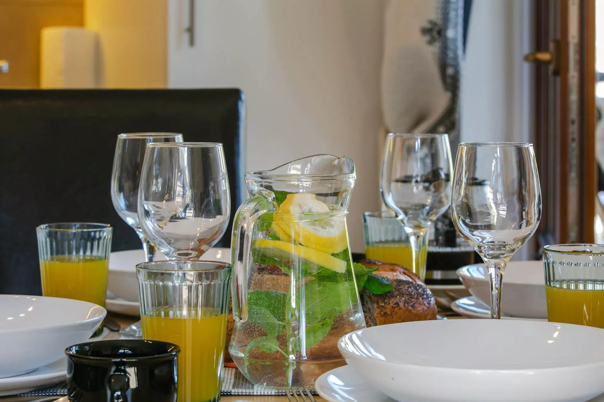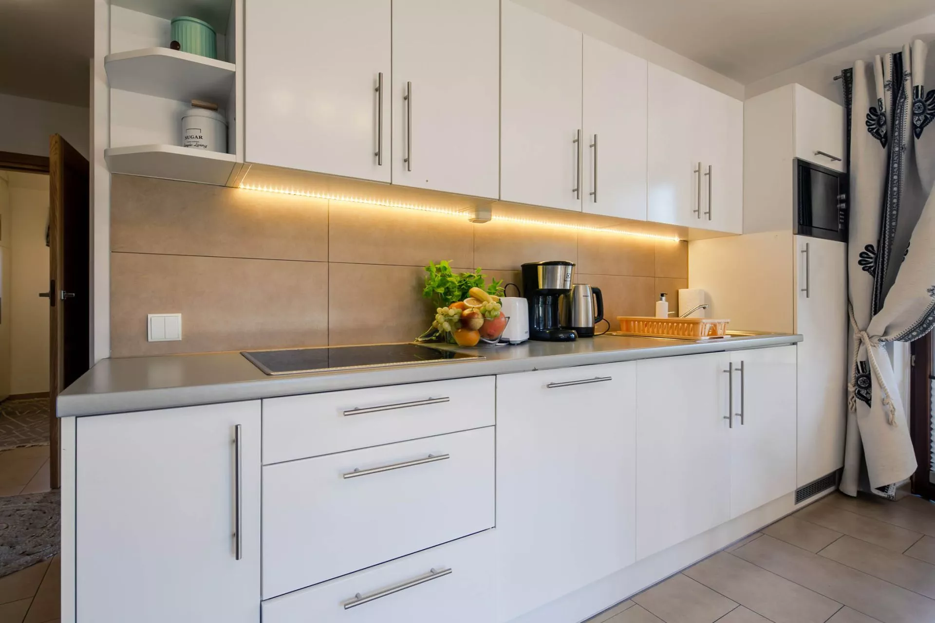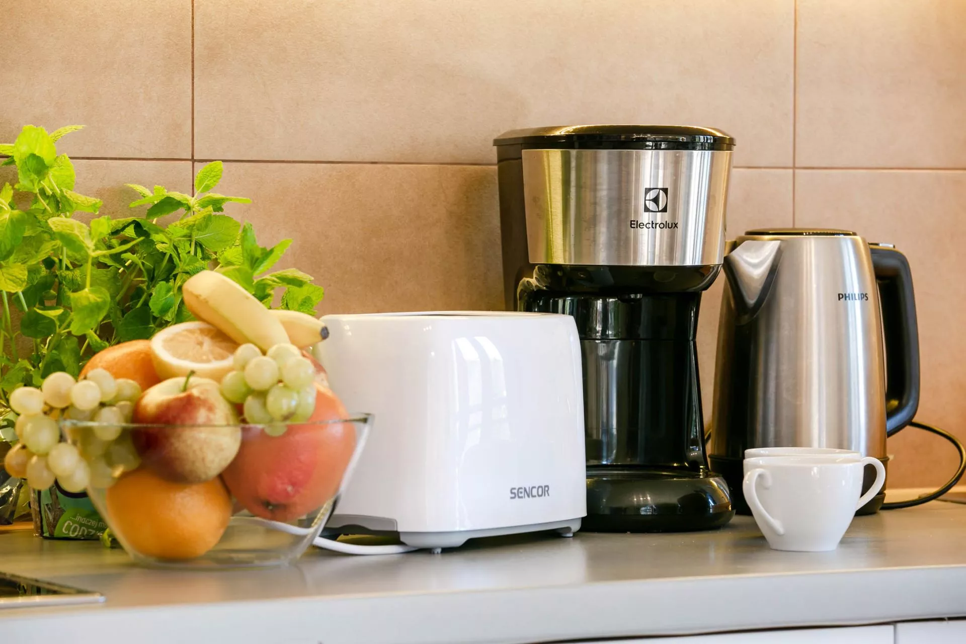 Aneks kuchenny: lodówka, zmywarka, pralka, płyta ceramiczna, kuchenka mikrofalowa, toster, naczynia, sztućce, garnki, zlew, kieliszki do wina i szampana