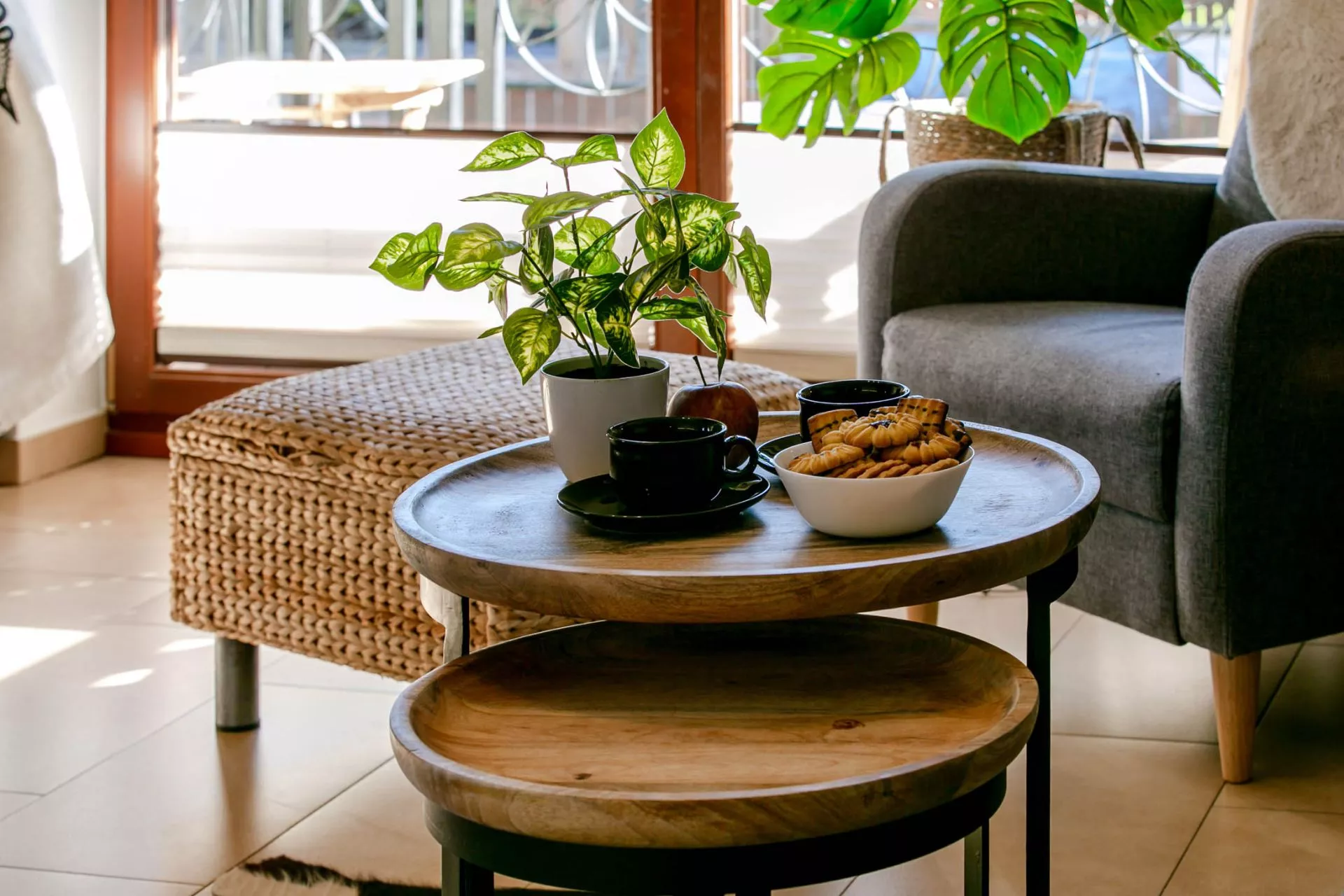 Salon: dwuosobowa sofa , 2xstolik, fotel, pufa z wikliny, stół, 4 krzesła, 2 taborety, regał, komoda z szufladami, TVLCD`37