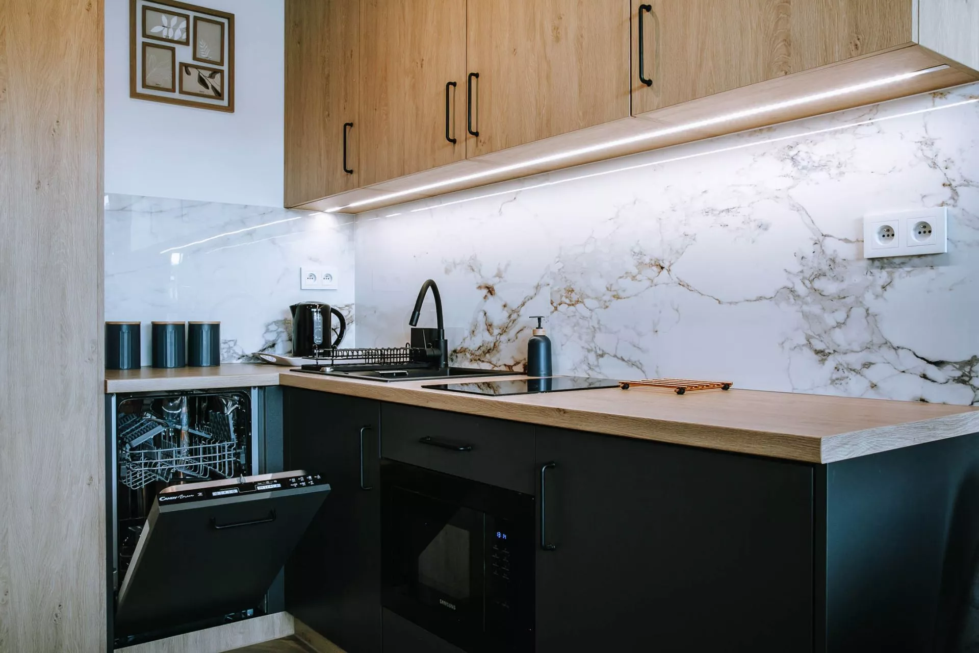 Aneks kuchenny: 2 palnikowa płyta elektryczna, lodówka, kuchenka mikrofalowa, czajnik elektryczny, zmywarka, komplet naczyń , garnków i sztućców, zastawa szklana