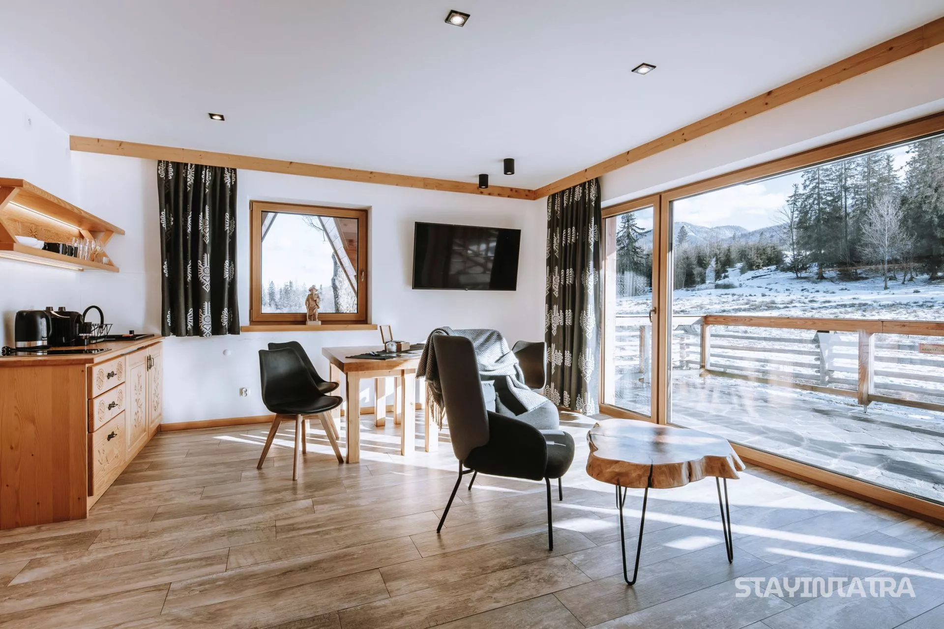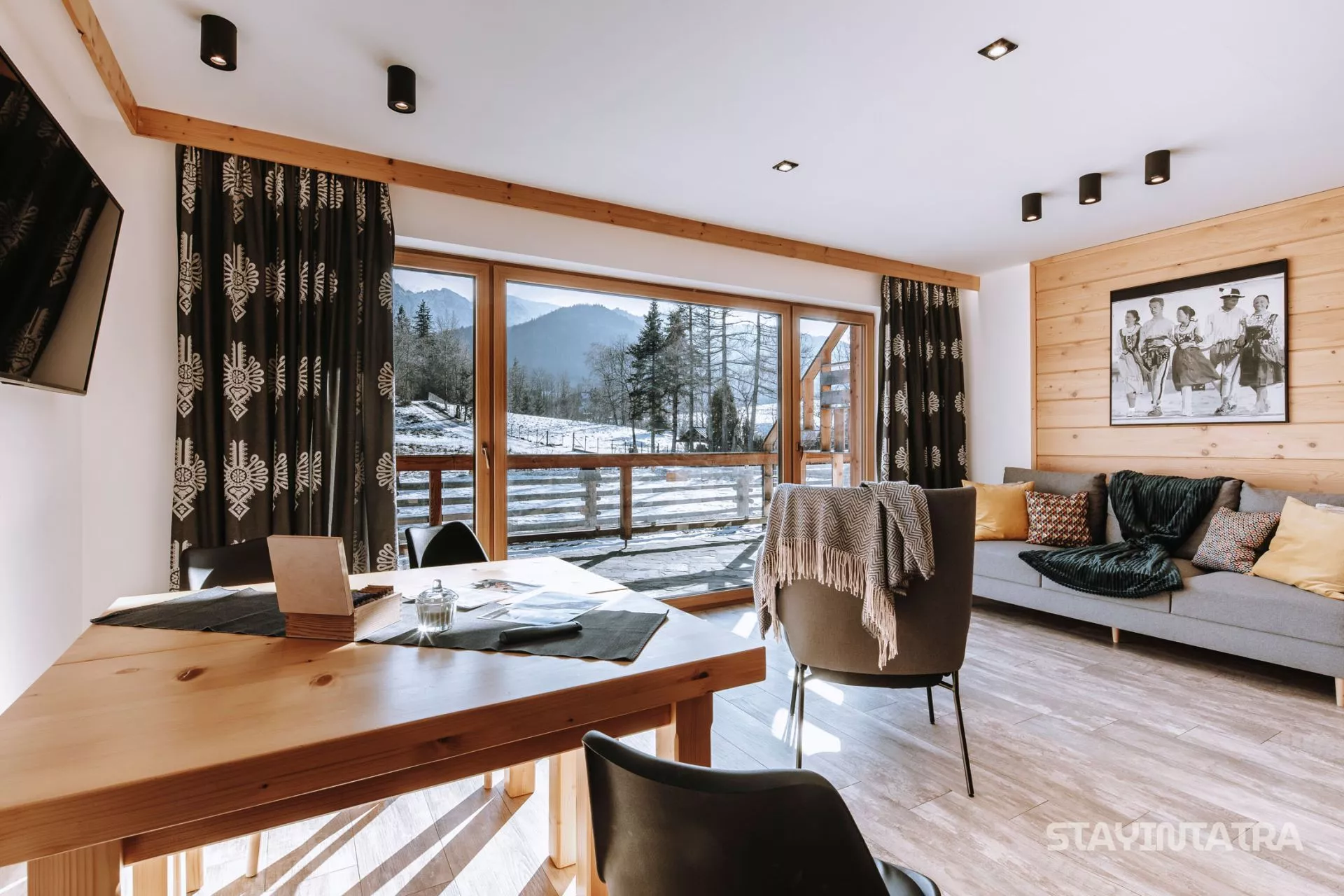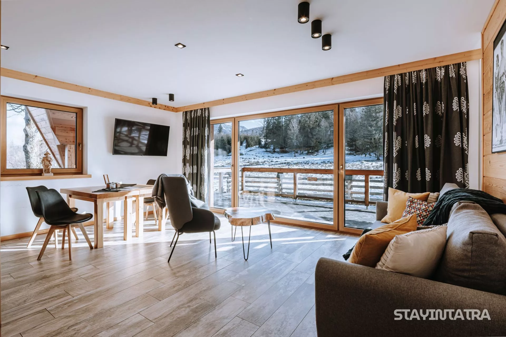 Struktura apartamentu: przedpokój, salon z aneksem kuchennym, osobna sypialnia (łóżko małżeńskie), łazienka, duży taras z pięknym widokiem na góry / Apartament zlokalizowany na parterze.
