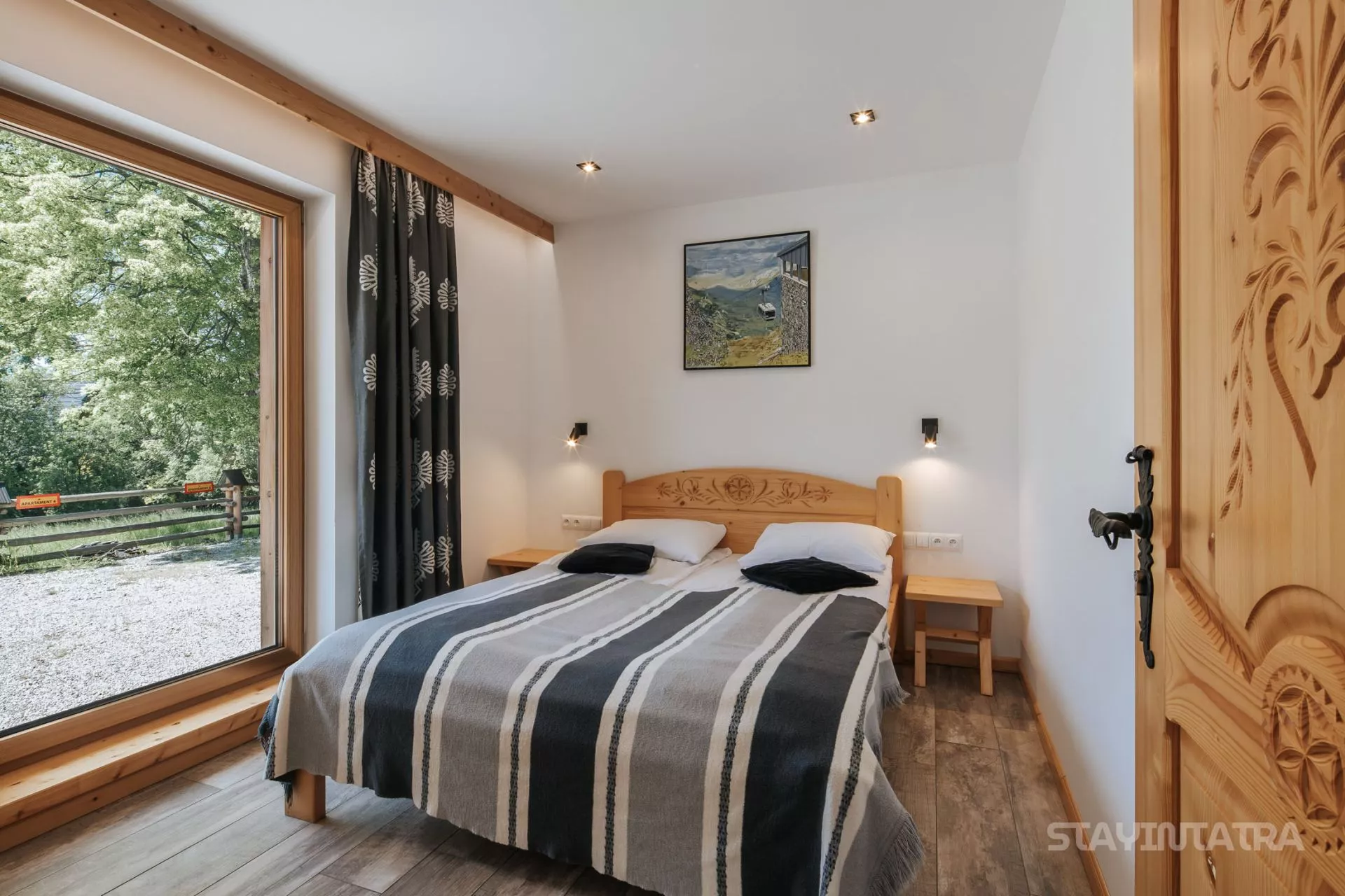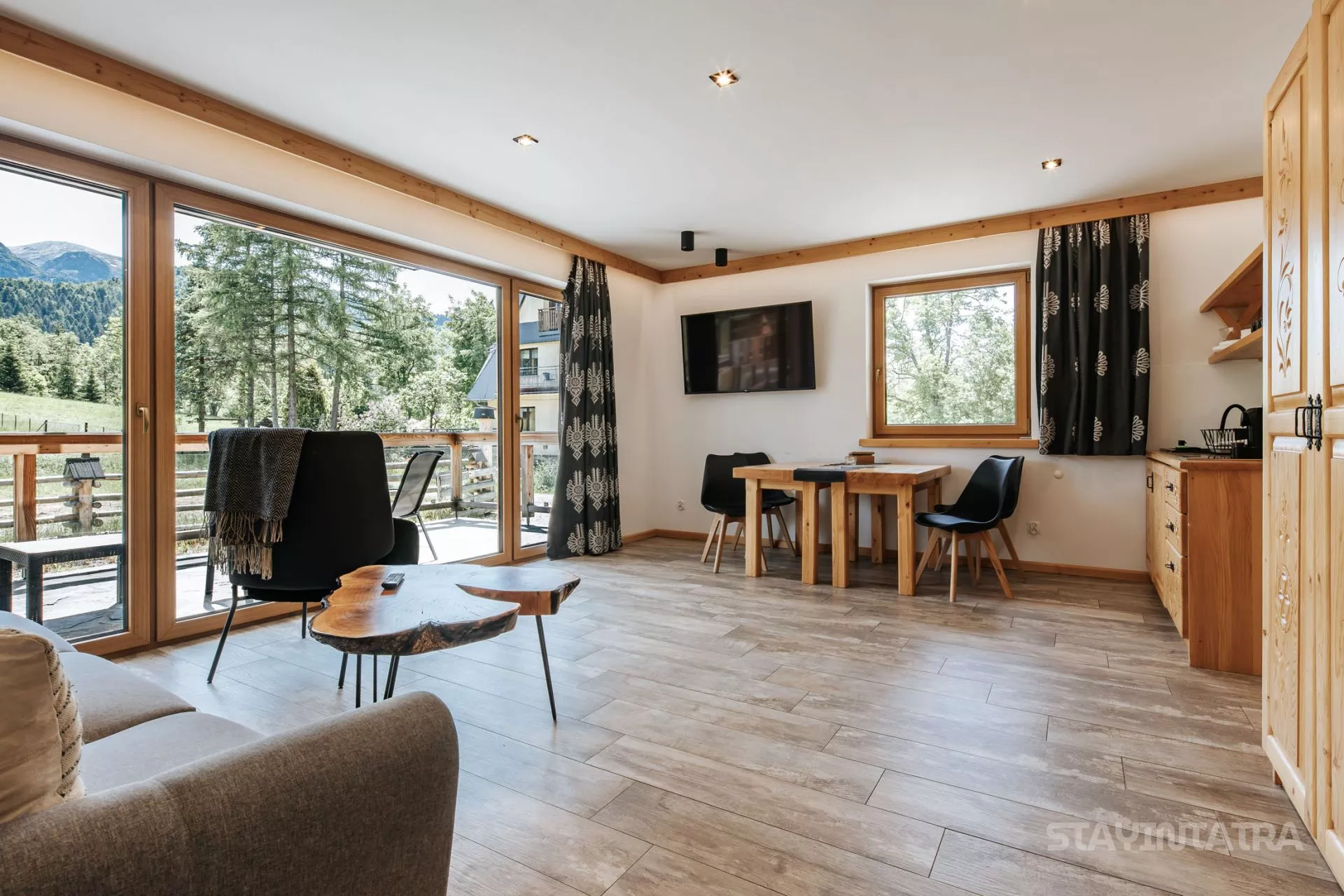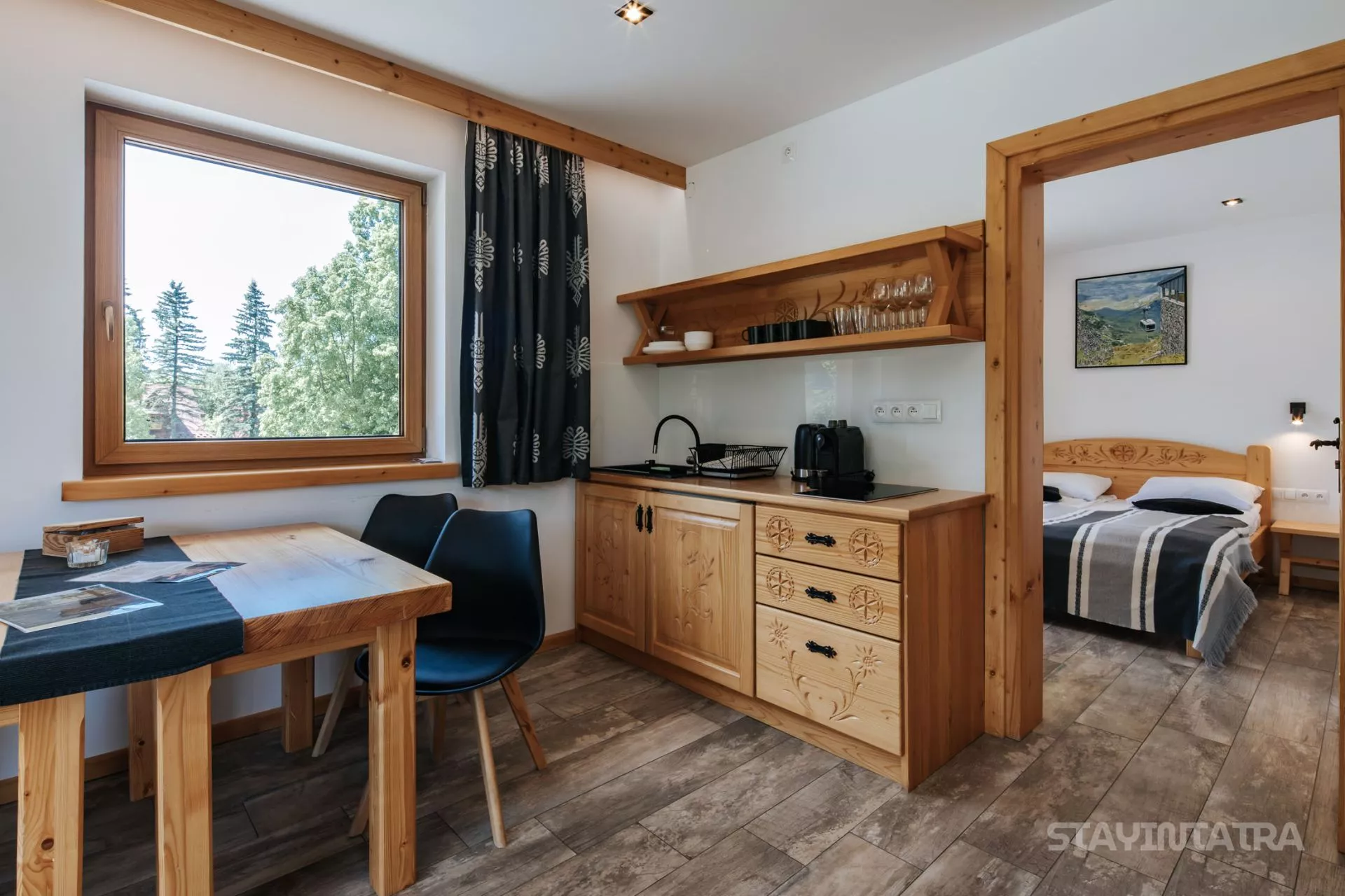 Struktura apartamentu: przedpokój, salon z aneksem kuchennym, osobna sypialnia (łóżko małżeńskie), łazienka, duży taras z pięknym widokiem na góry / Apartament zlokalizowany na parterze.