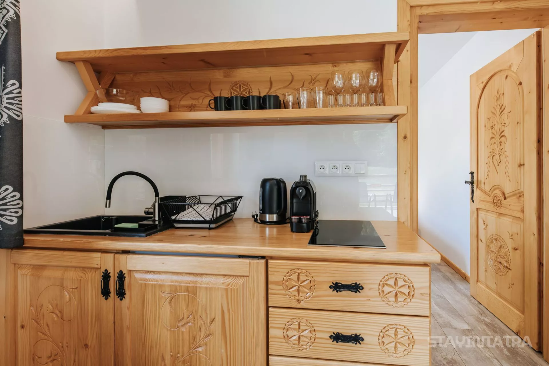 Aneks kuchenny: ekspres do kawy na kapsułki (Cafissimo), czajnik elektryczny, 2-palnikowa płyta elektryczna, lodówka, komplet naczyń, garnków i sztućców, zastawa szklana