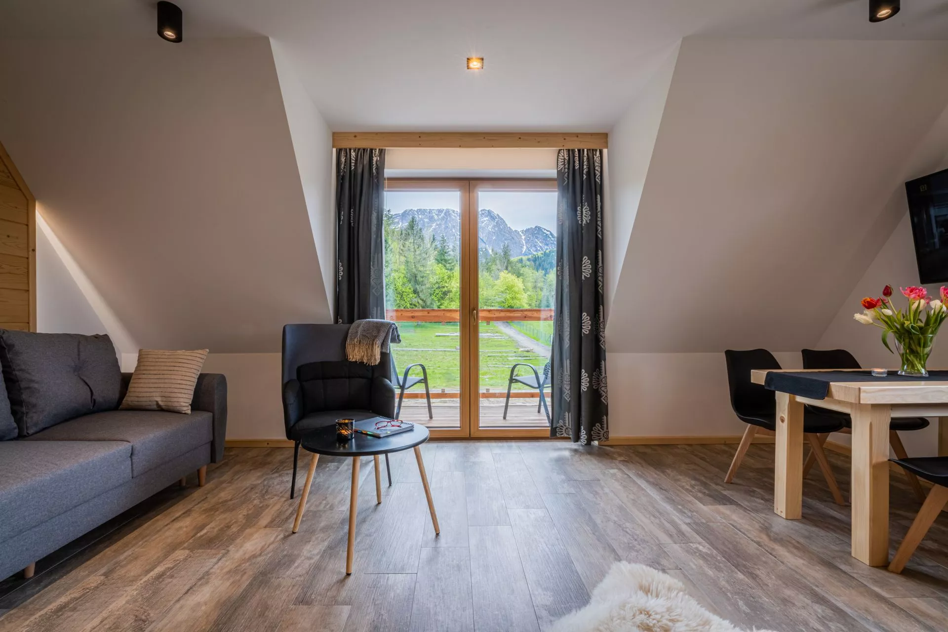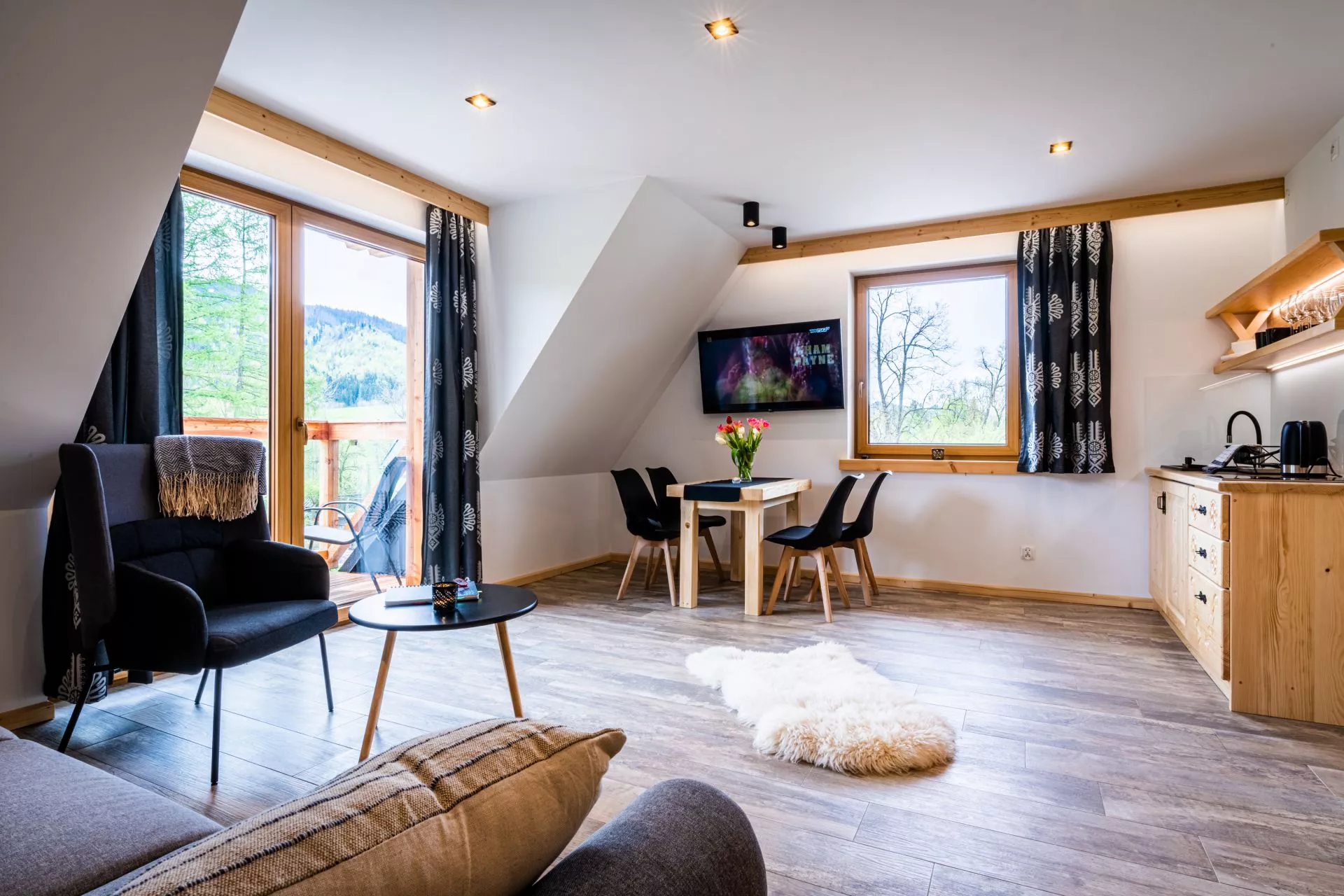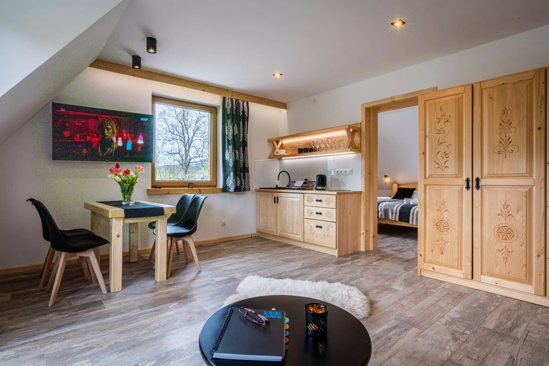 Struktura apartamentu: przedpokój, salon z aneksem kuchennym, osobna sypialnia (łóżko małżeńskie), łazienka, balkon z pięknym widokiem na góry
