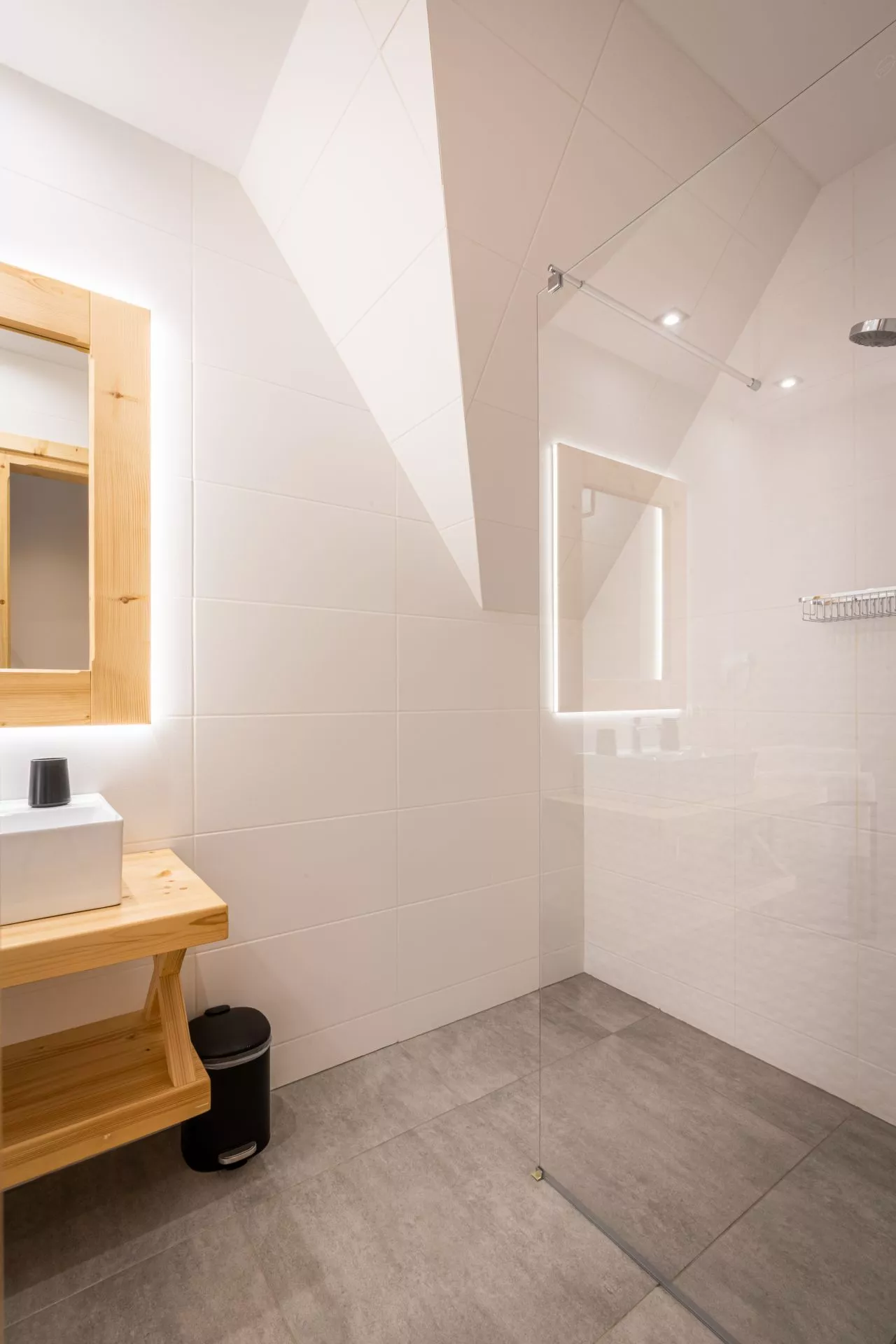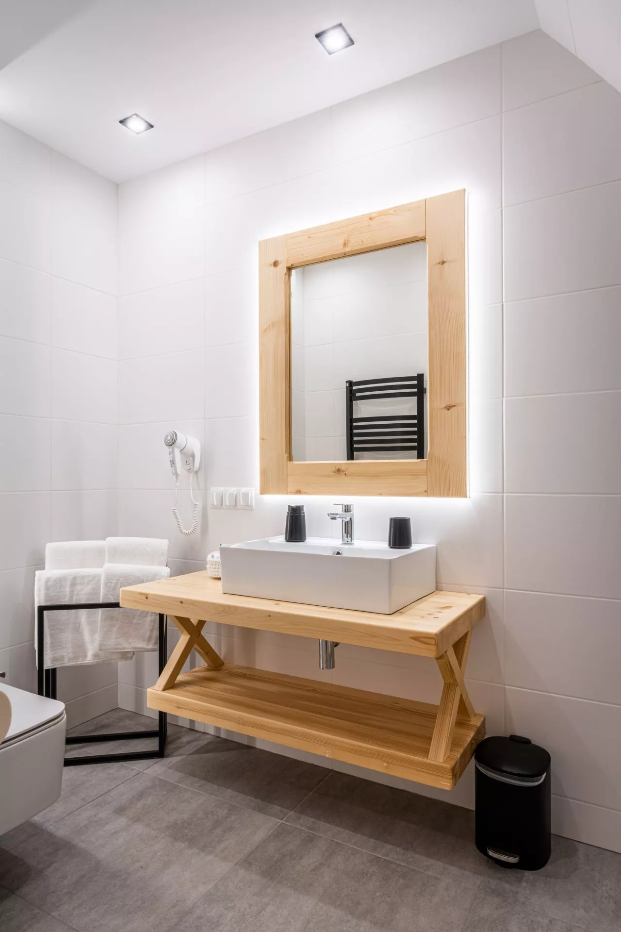 Łazienka: prysznic, toaleta, umywalka, grzejnik ręcznikowy, suszarka do włosów