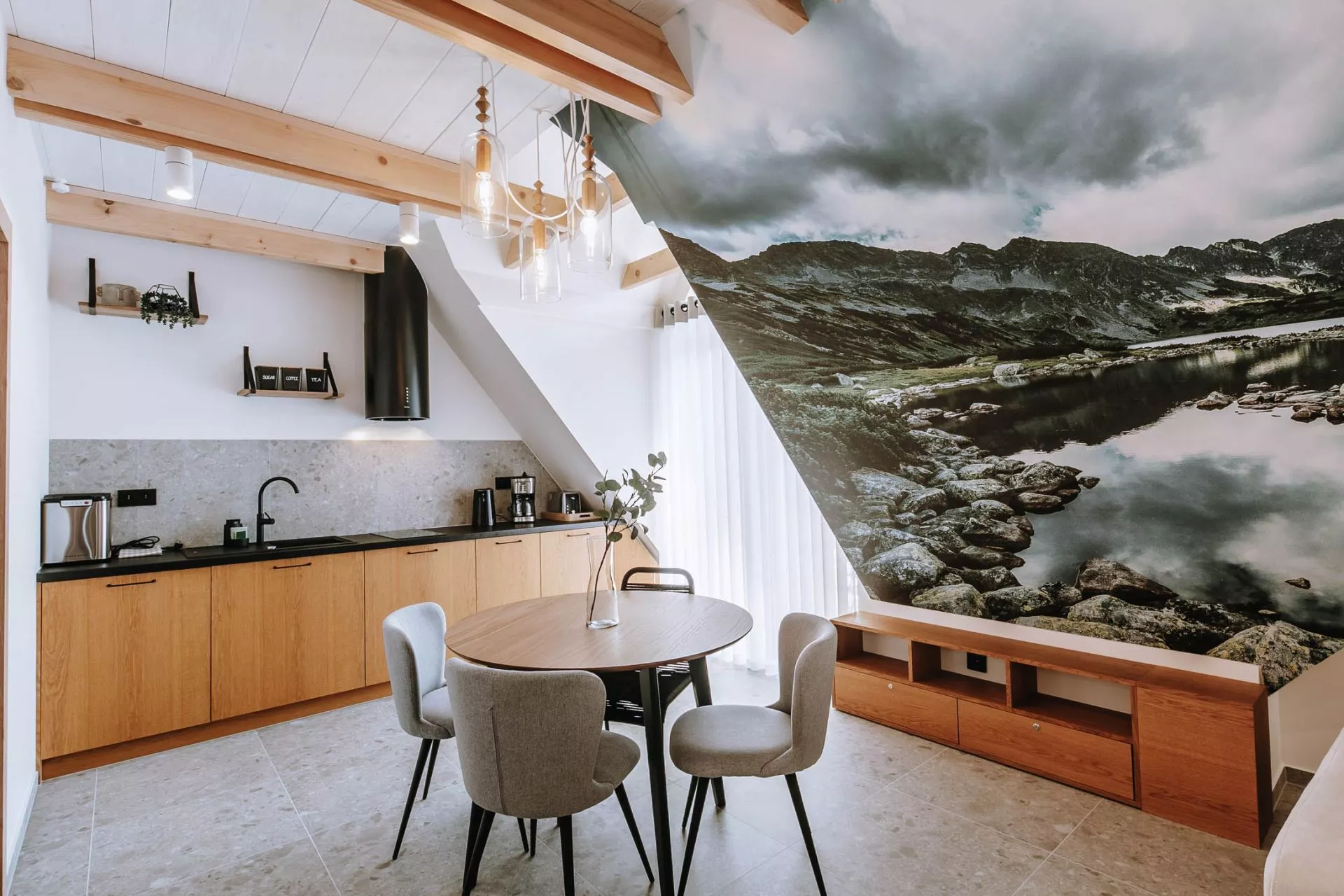 Salon: 2 osobowa rozkłada sofa, fotel, stolik kawowy, okrągły stół, 4 krzesła, TV'45, szafka rtv, wyjście na balkon z pięknym widokiem na panoramę Tatr, klimatyzacja.