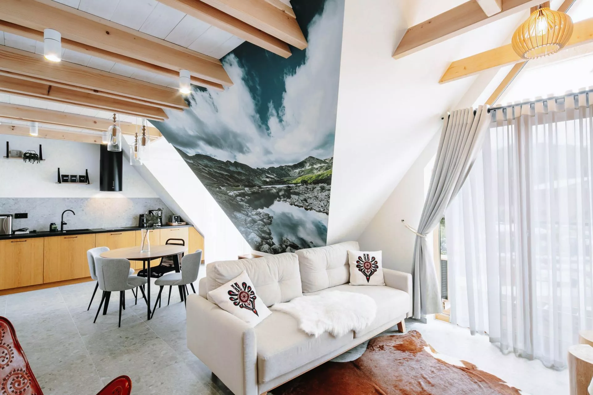 Salon - 2 osobowa rozkładana sofa, fotel, stolik kawowy, 2 szafki typu rtv, TV'45, 2 balkony z widokiem na panoramę Tatr, klimatyzacja.