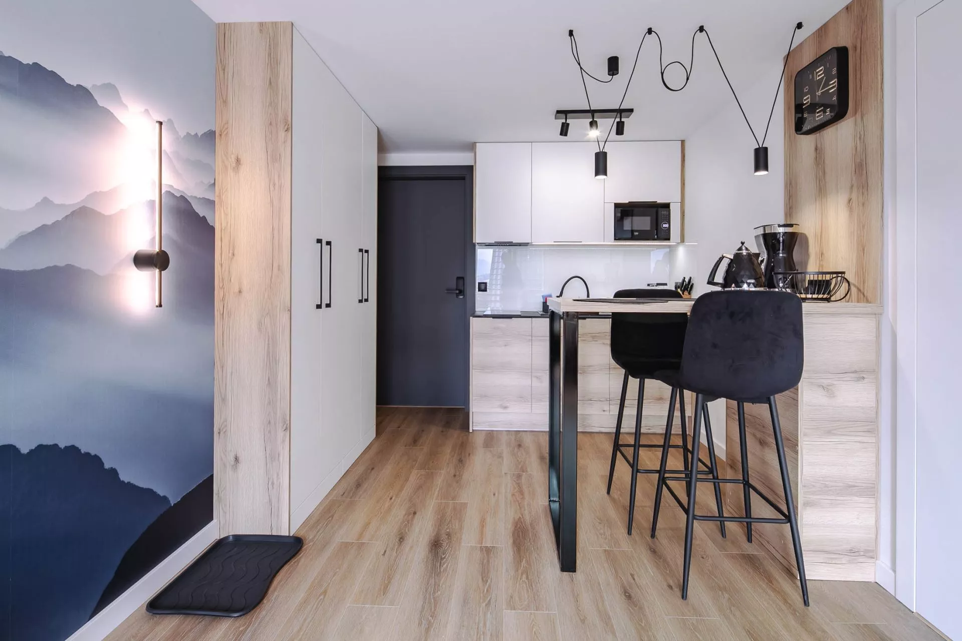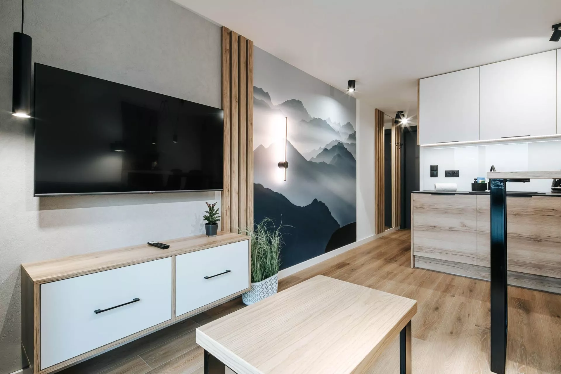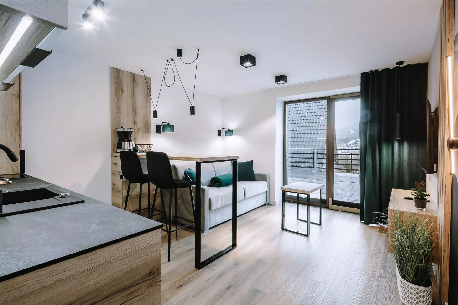 Struktura apartamentu: Salon z aneksem kuchennym, łazienka, przedpokój, wyjście na taras z pięknym widokiem na panoramę Tatr i miasto Zakopane. Z tarasu rozpościera się także widok na wzgórze Gubałówki.