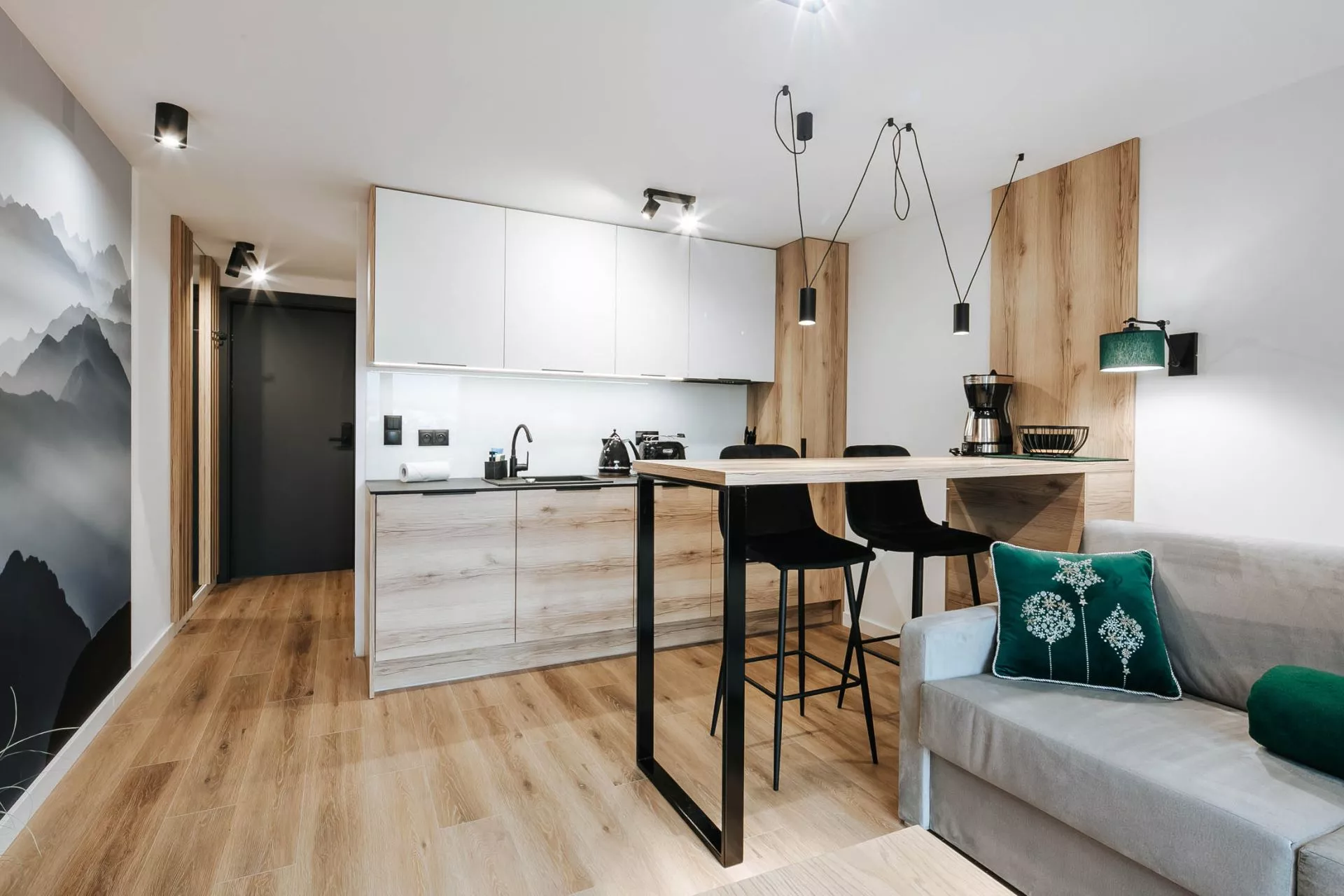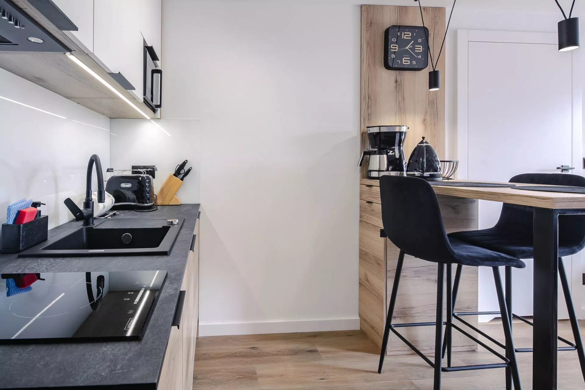 Aneks kuchenny: lodówka, zmywarka, płyta indukcyjna, zlew 1-komorowy, czajnik elektryczny, ekspres do kawy, toster, okap, komplet naczyń, patelnia, akcesoria do gotowania, sztućców, garnków, zastawa szklana
