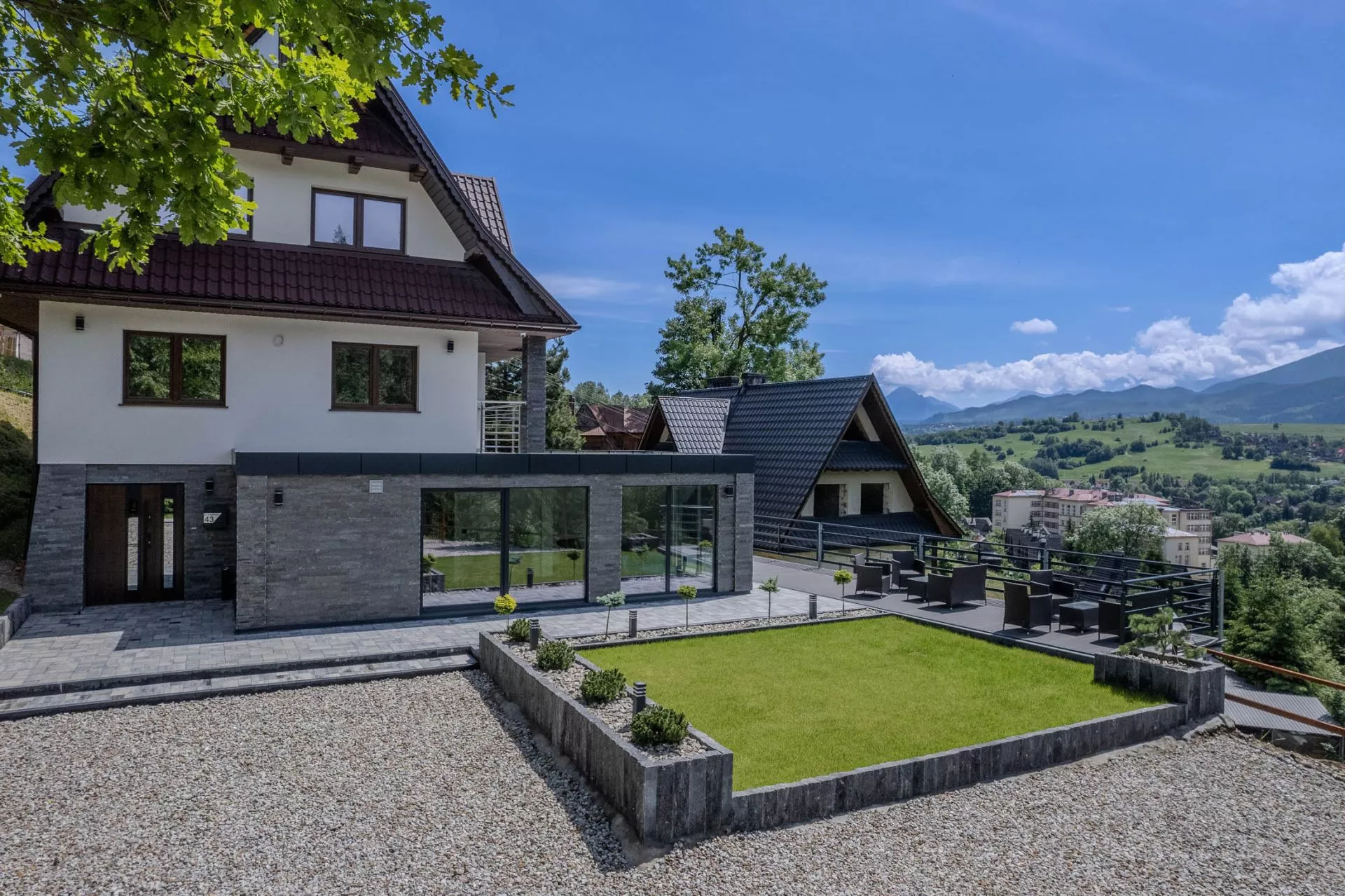 Dom Panorama Tatr Jacuzzi to samodzielny obiekt dla maksymalnie 16 osób, oferujący komfortowy pobyt z przepięknym widokiem na całą Panoramę Tatr, Zakopane, dostęp do strefy SPA z jacuzzi i prywatnym parkingiem!
