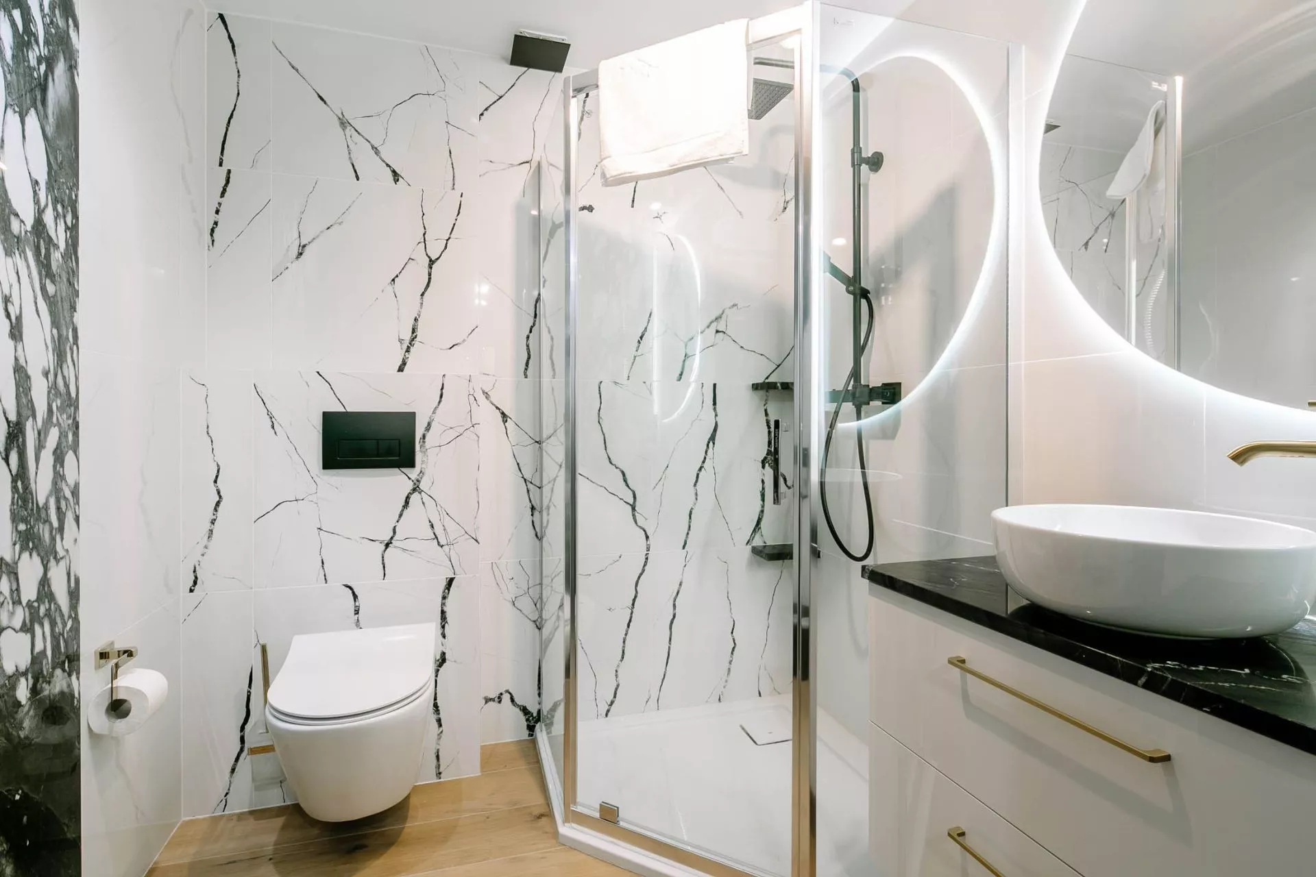 Łazienka: kabina prysznicowa z deszczownicą, toaleta, 2 umywalki, 2 lustra, suszarka hotelowa
