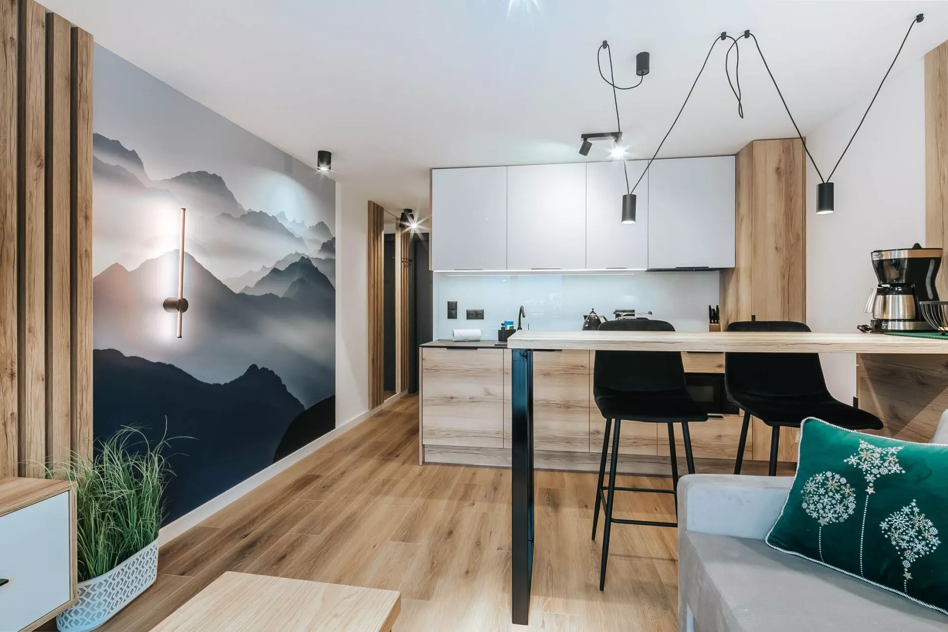 Struktura apartamentu: Duży salon z aneksem kuchennym, 2 osobne zamykane sypialnie, łazienka, przedpokój, duży balkon z pięknym widokiem na panoramę Tatr i miasto Zakopane. Z okien sypialnie rozciąga się widok na wzgórze Gubałówki.